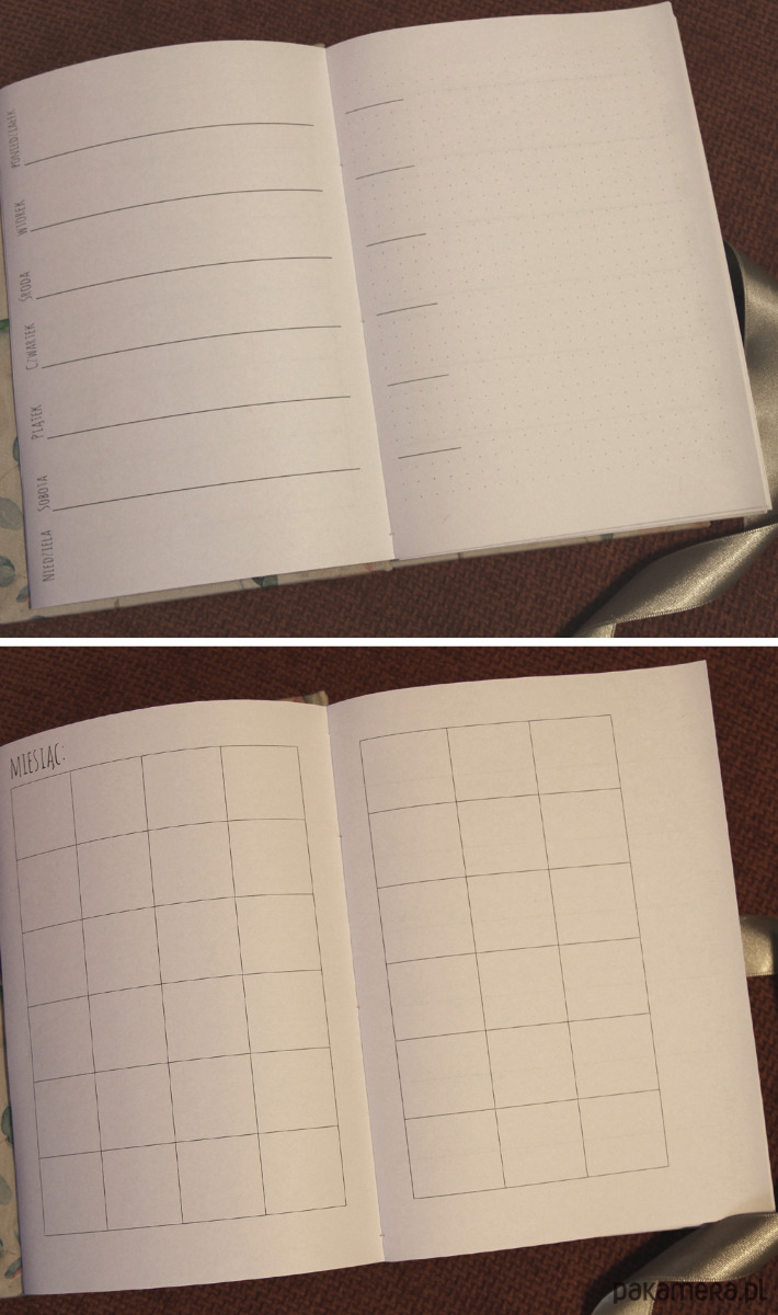 - w każdym miesiącu 5 rozkładówek z planem tygodnia - dwustronnym - po lewej cały tydzień na gładkiej kartce, po prawej strona kropkowana z delikatnym zaznaczeniem układu tygodnia, do dowolnej interpretacji graficznej i zapisków :)