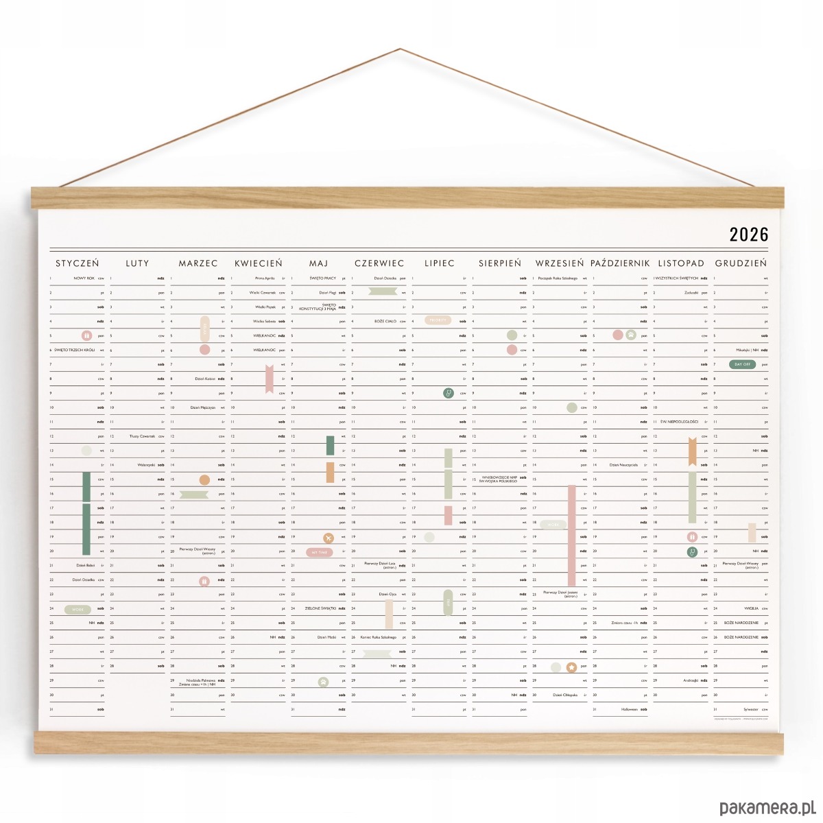 Planer ścienny 2026 z naklejkami i dębowym wieszakiem