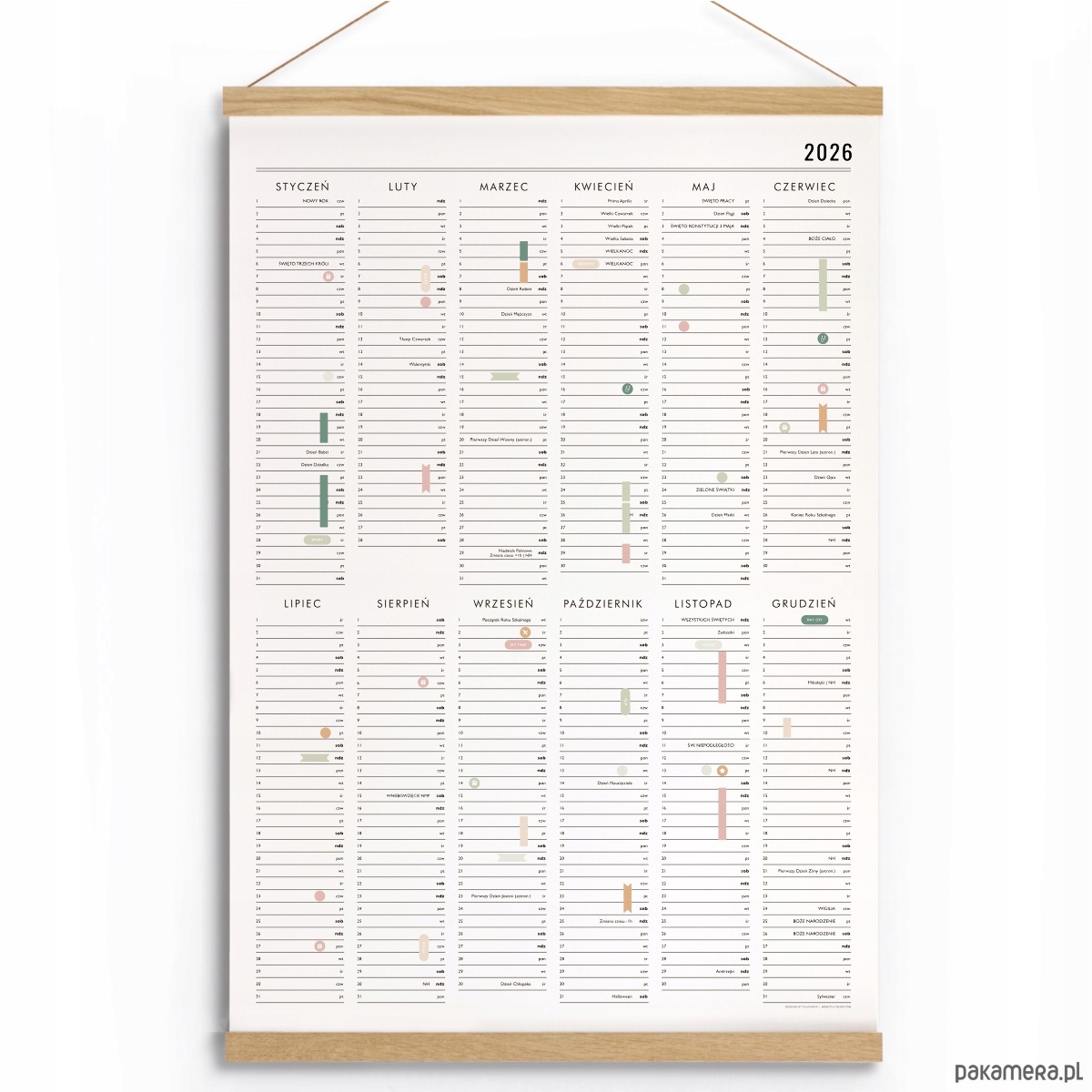Kalendarz ścienny 2026 z naklejkami i dębowym wieszakiem