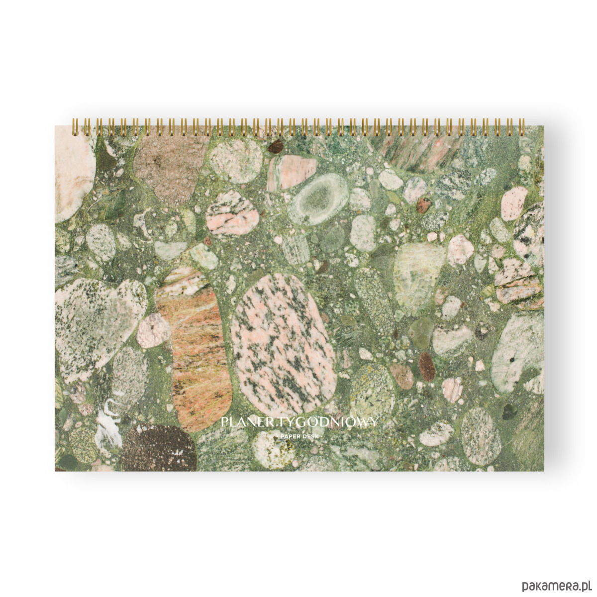 Kolekcja Stone inspirowana surową elegancją naturalnych materiałów łączy prostotę z funkcjonalnością. Ten planer tygodniowy A4 na spirali oferuje czytelny układ, gdzie każdy tydzień ma swoją przestrzeń, a spiralna konstrukcja pozwala łatwo przewracać strony. To narzędzie, które łączy planer biurkowy ze spokojem minimalistycznego designu.