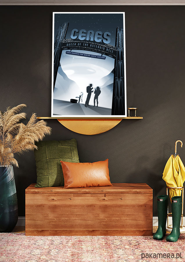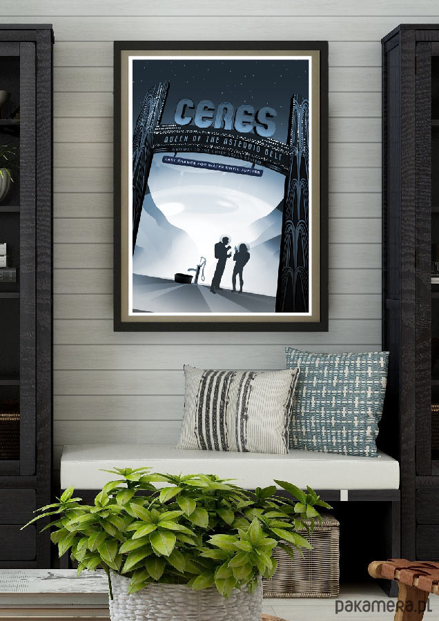 Plakat w stylu vintage przedstawiający planetę karłowatą Ceres. Slogan na plakacie reklamuje ją jako "Królową pasa asteroid", a także bramę na zewnątrz Układu Słonecznego i ostatnie miejsce z szansą na wodę przed Jupiterem. Ceres to największy obiekt w pasie asteroid znajdującym się pomiędzy Marsem i Jupiterem, jest także ulokowana najbliżej słońca. Obserwowana od 200 lat, jako pierwsza planeta karłowata została zbadana w 2015 roku przez sondę Dawn ujawniając tajemniczy świat stworzony z lodu i skał.