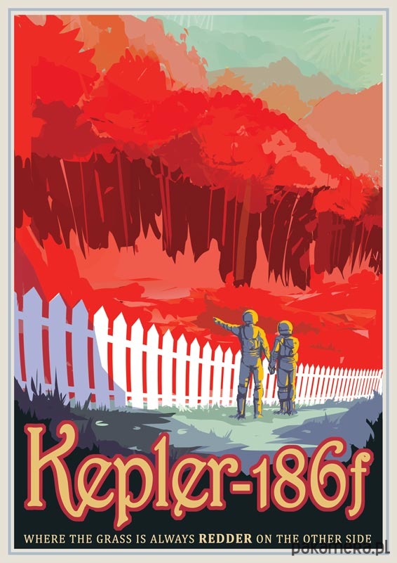 Plakat w stylu vintage przedstawiający planetę Kepler-186f, reklamowaną sloganem "Gdzie trawa jest bardziej czerwona z drugiej strony".