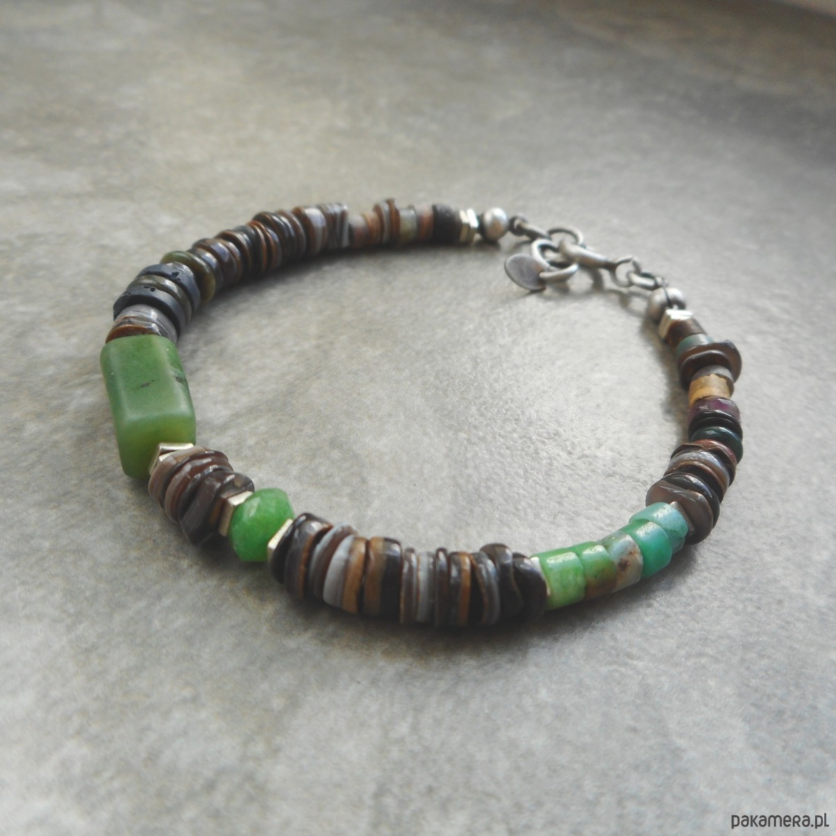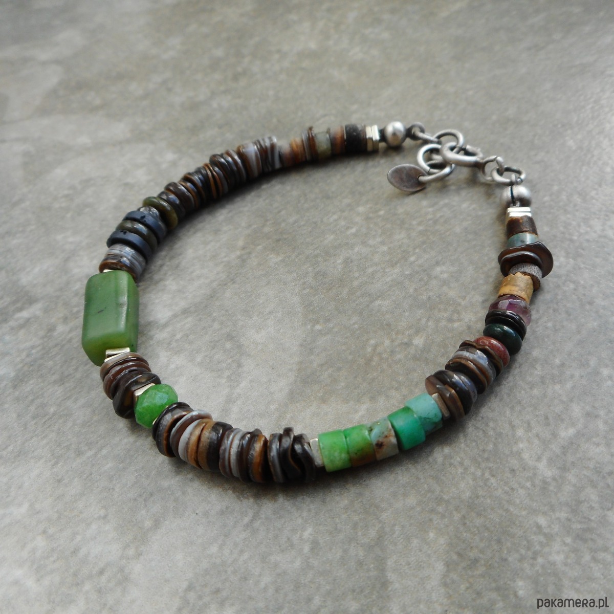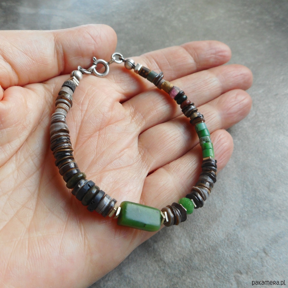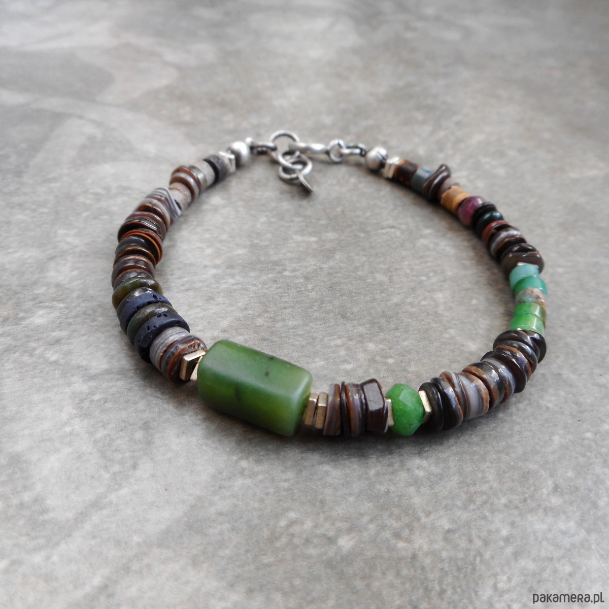 Bransoletka z kamieni naturalnych i szlachetnego srebra; prosta w formie, w kolorach ziemi.