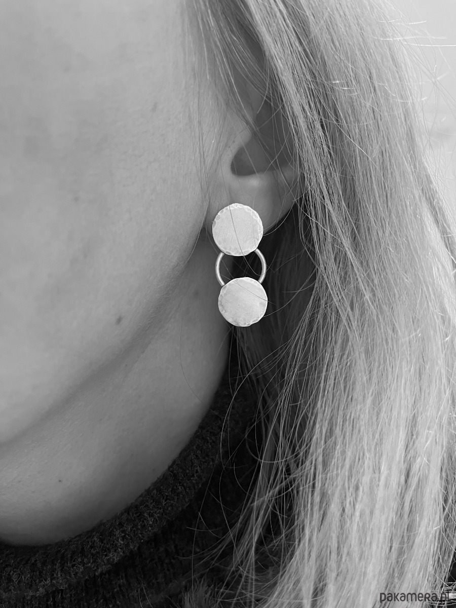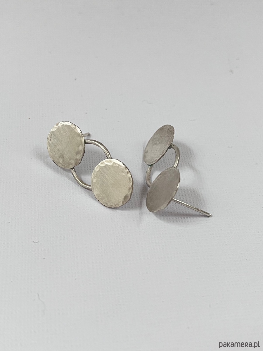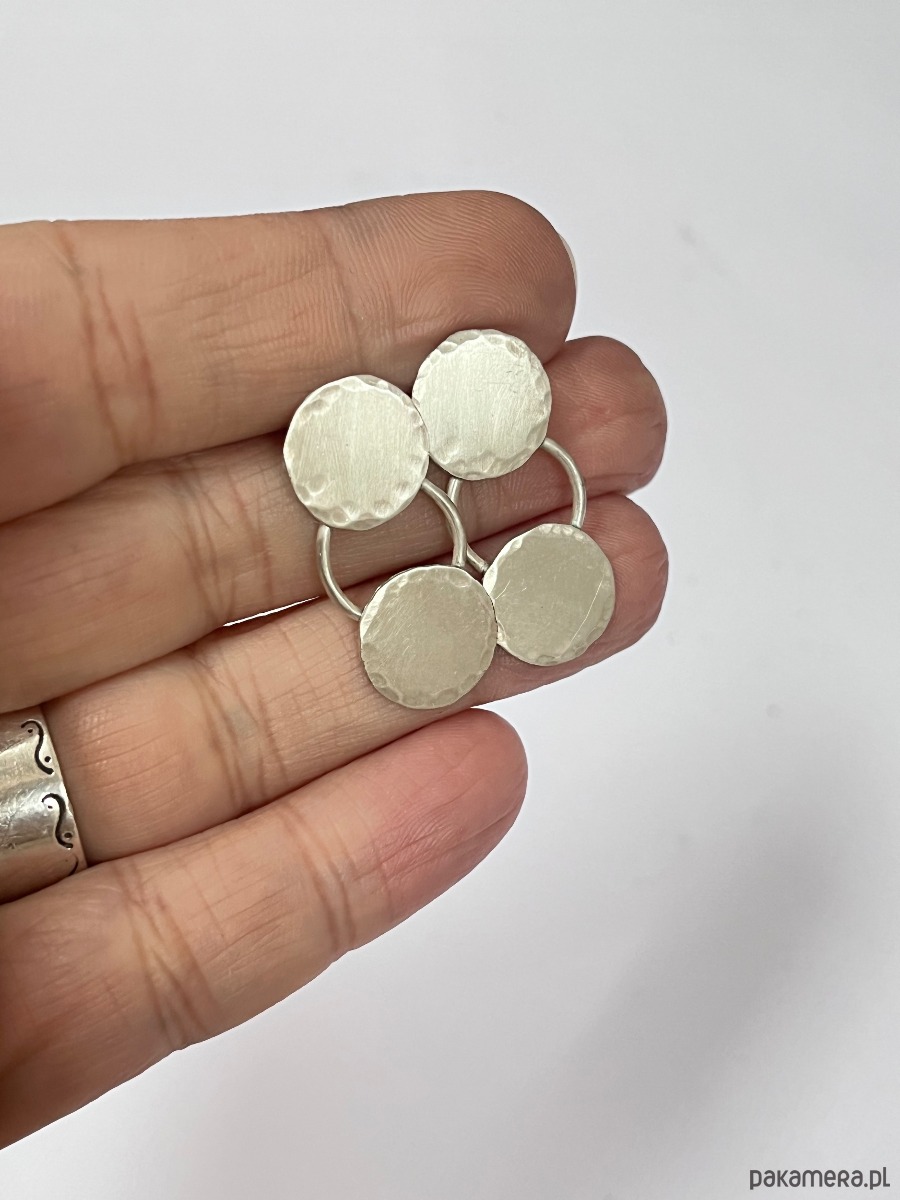Srebro młotkowane na brzegach dysków subtelnie odbijające światło. Całość w jasnym srebrze lekko polerowanym.
