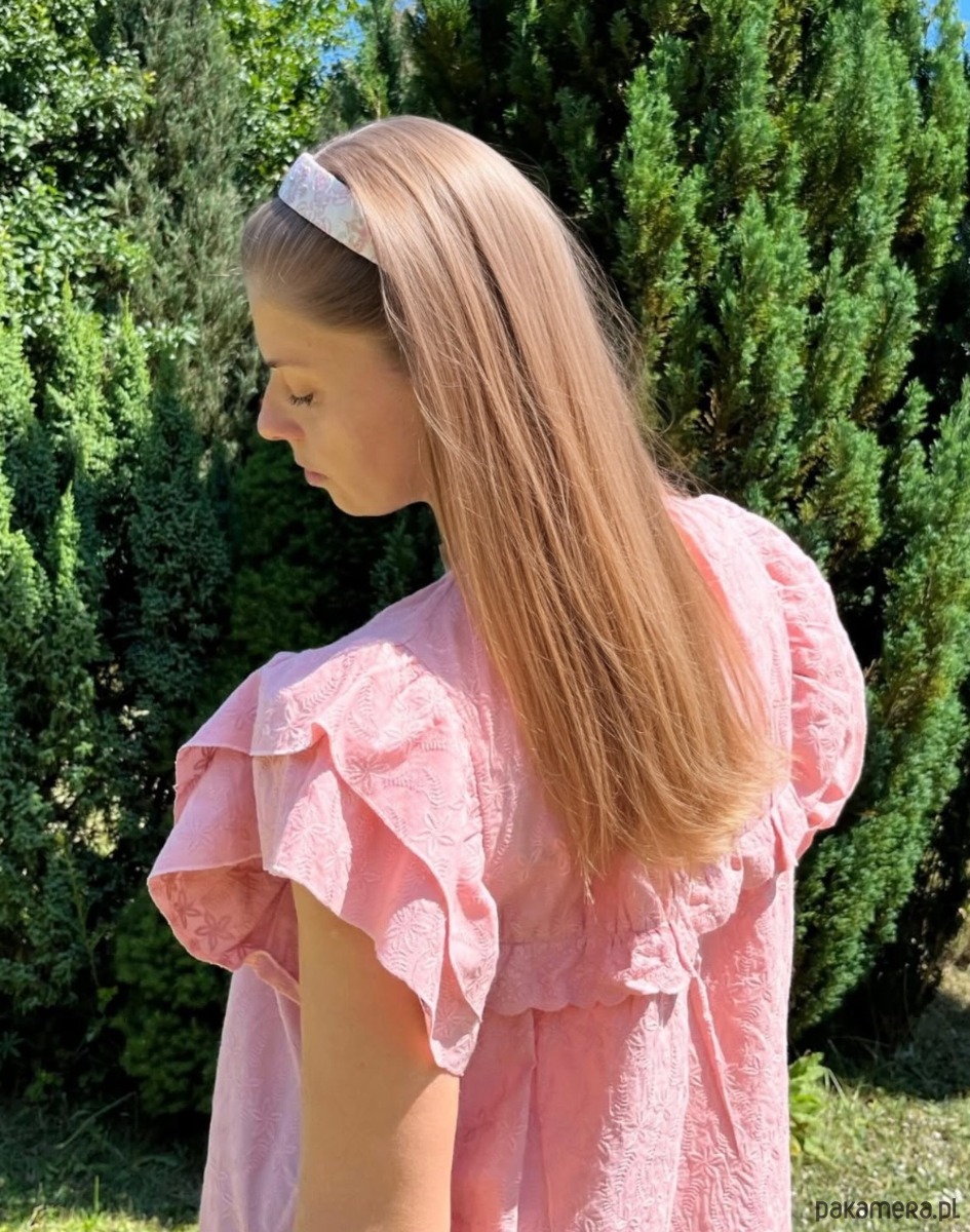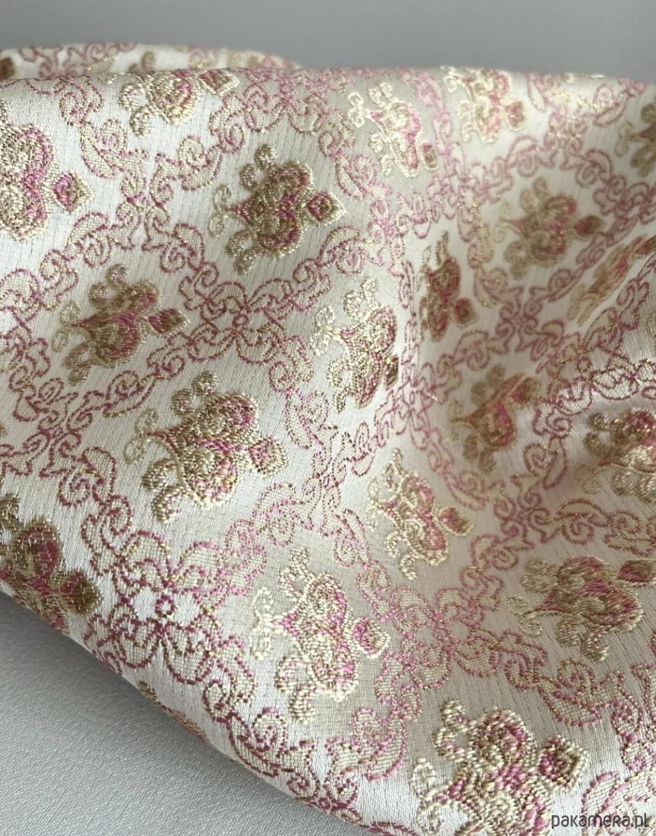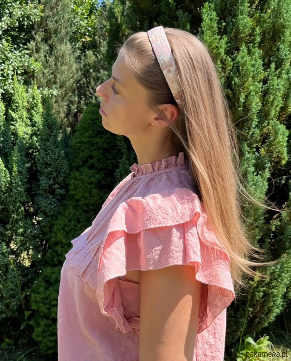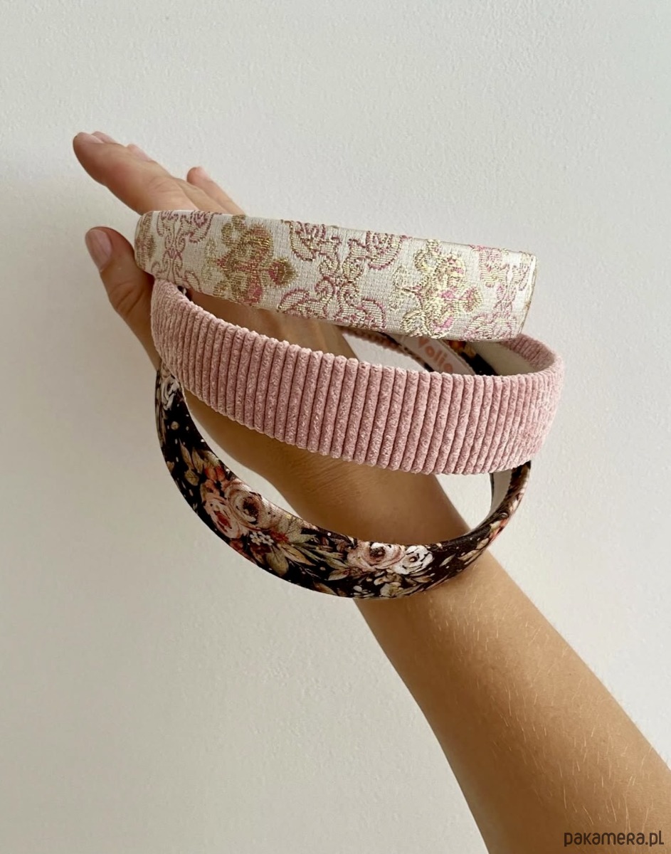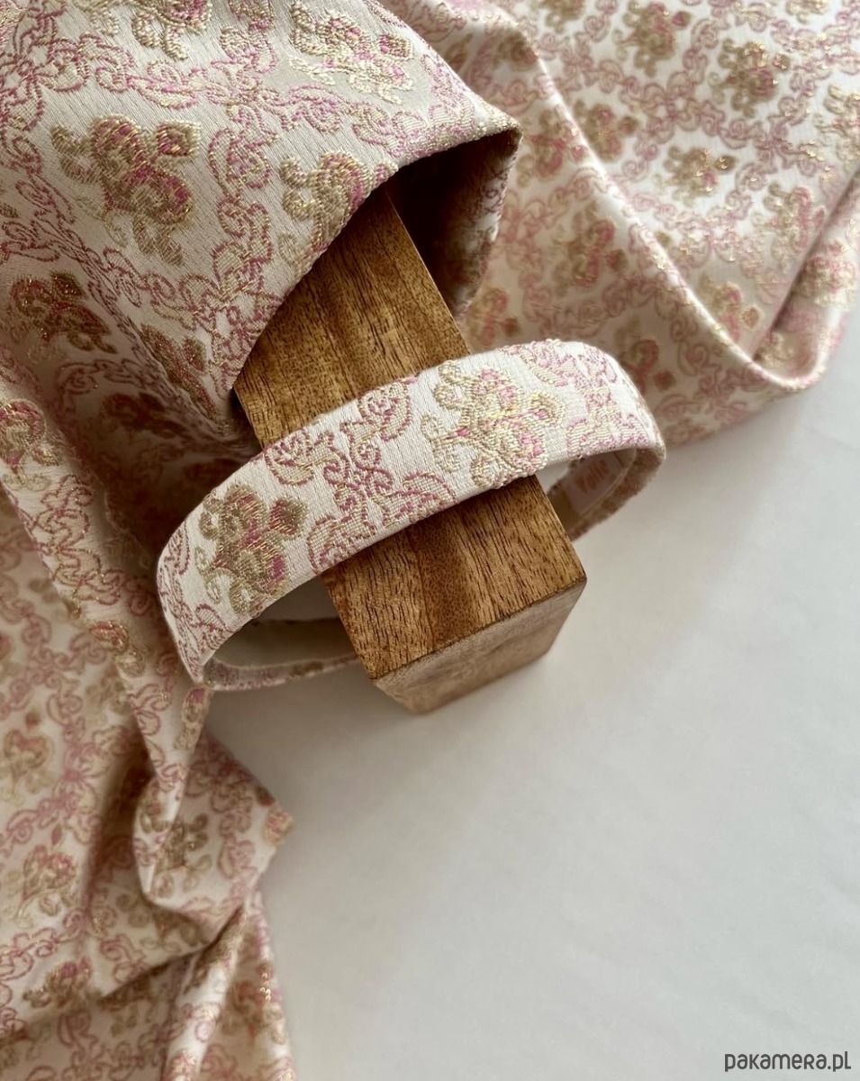 Uszyta z żakardu o błyszczącym wzorze w odcieniach różu i złota. Materiał subtelnie odbija światło, dzięki czemu opaska prezentuje się wyjątkowo elegancko – jak drobny, ale wyrazisty akcent biżuteryjny.