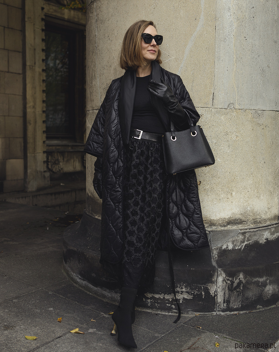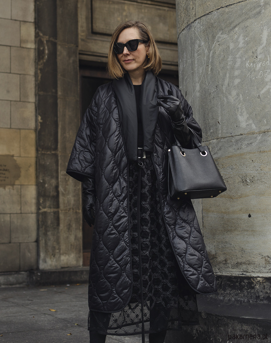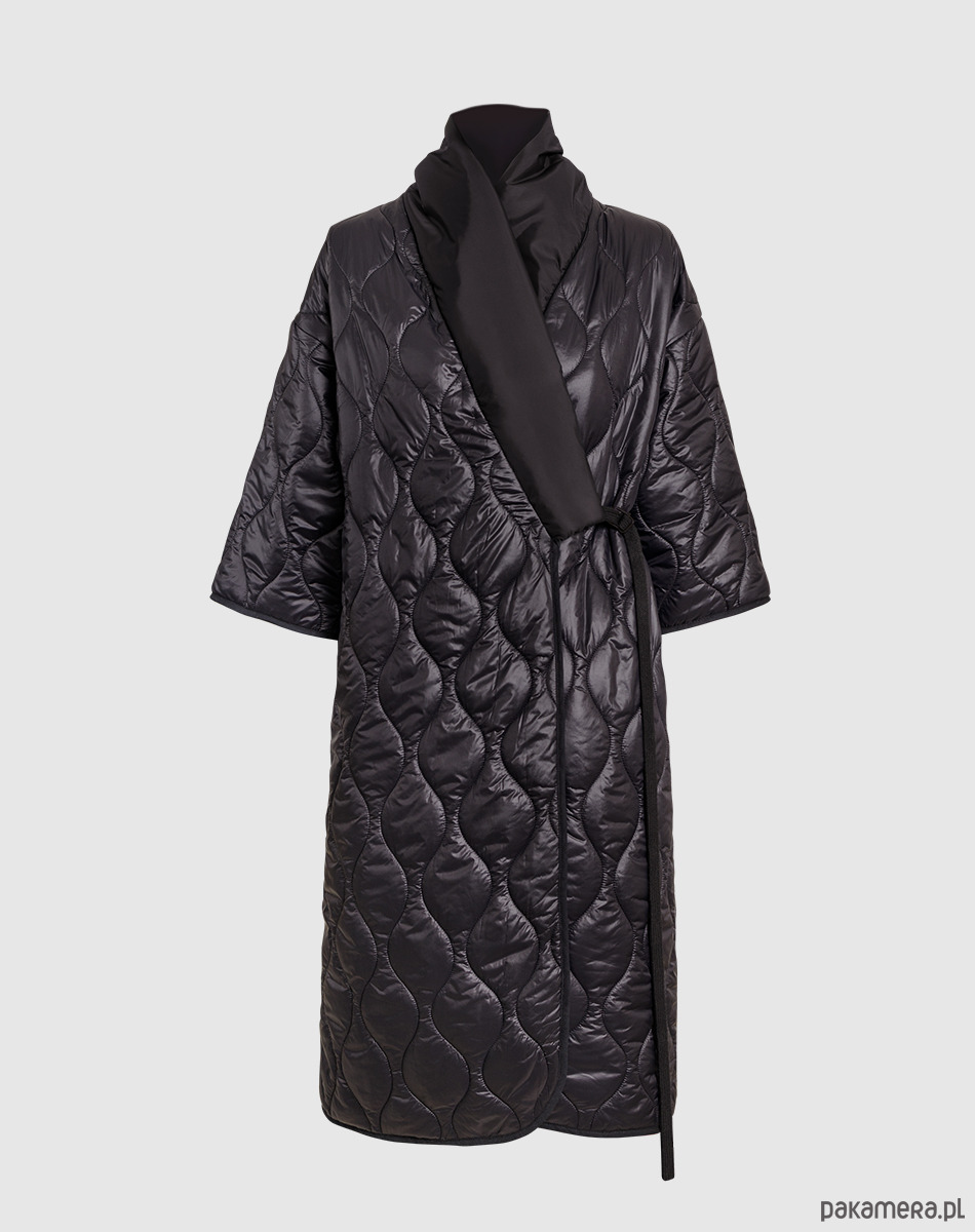 Długi kopertowy płaszcz uszyty z czarnej pikówki z rękawem 3/4. Brzegi wykończone czarną lamówką. Zapięcie na sznurki, przekładane wokół talii i zapinane na półkółka. Płaszcz posiada 2 kieszenie w szwach bocznych.