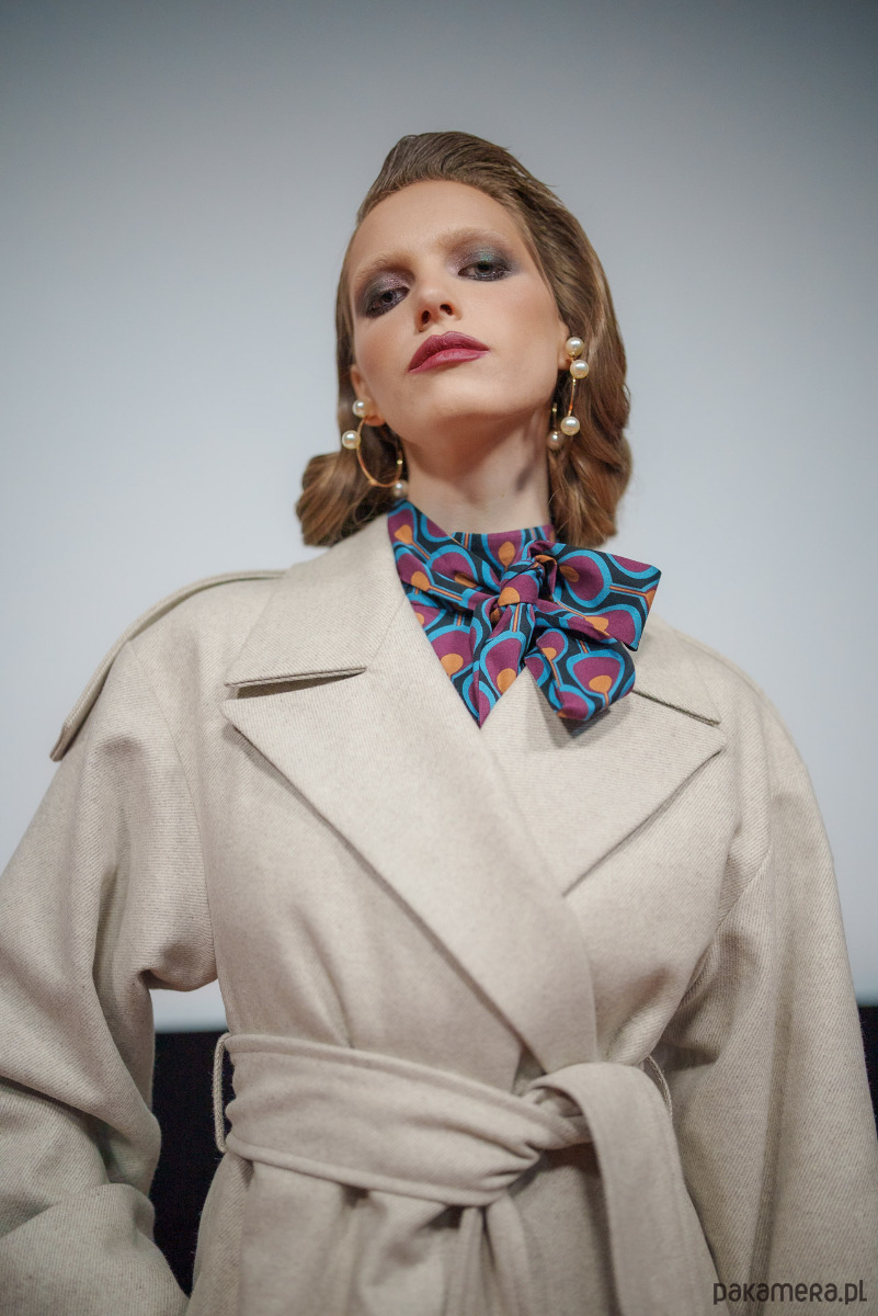 Styl: Klasyczny kołnierz oraz pasek w talii, który podkreśla sylwetkę, nadając jej kobiecy kształt.