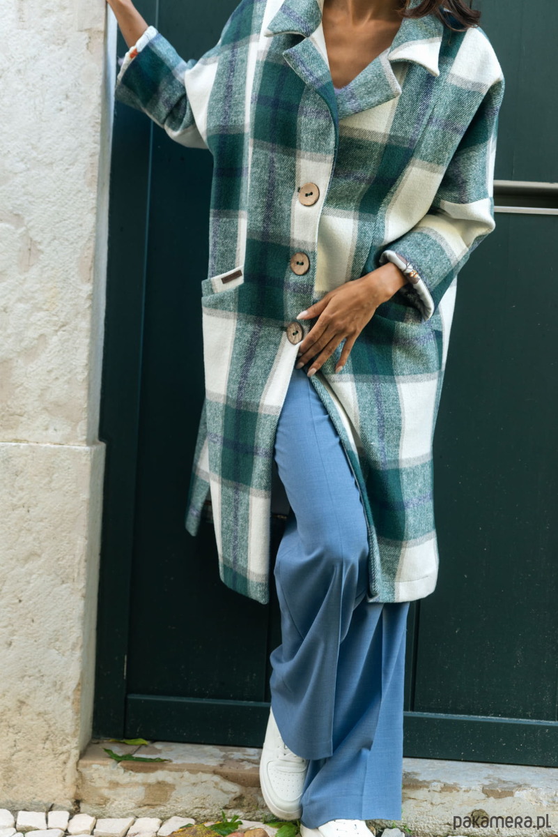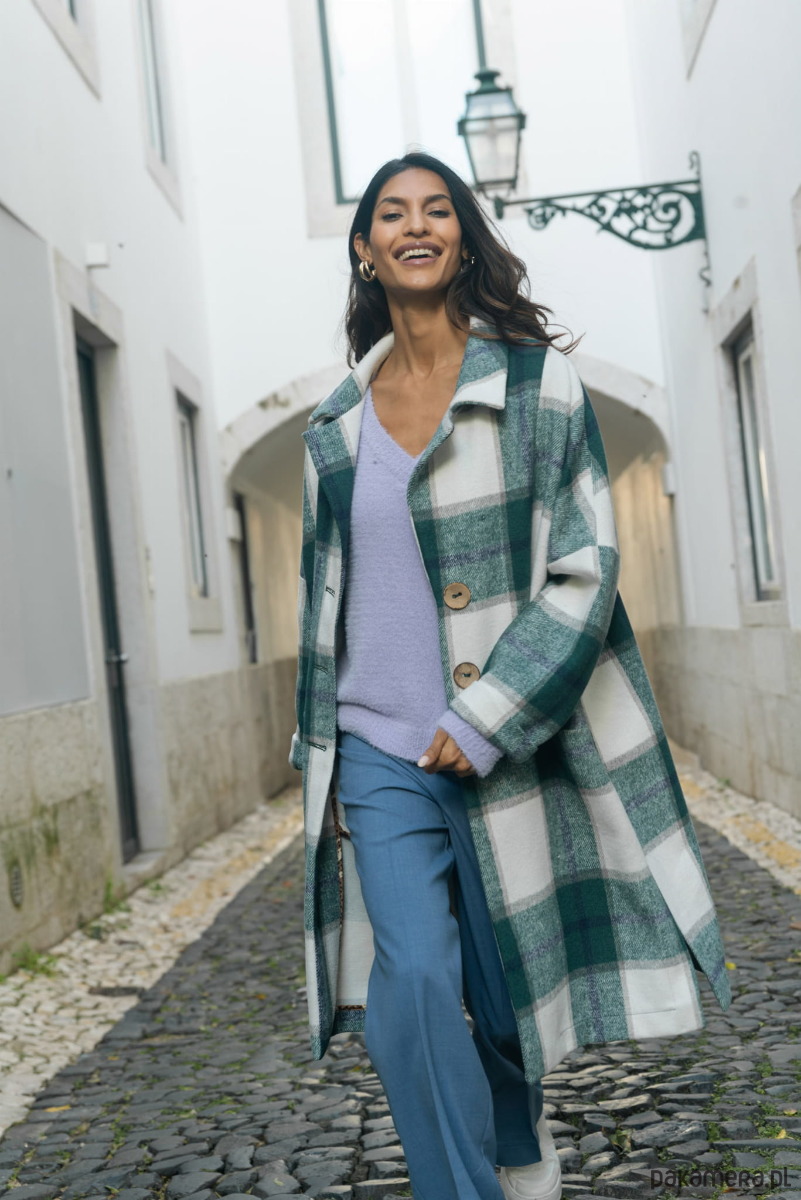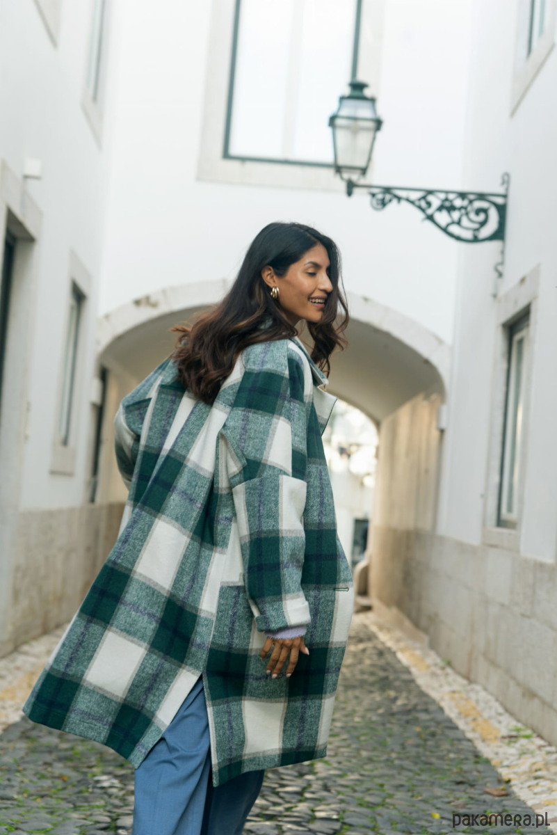 ATIRA zapinany jest na trzy guziki-kokoski (nasze ulubione!). Z rzeczy praktycznych, wspomnieć należy tu też rozcięcia po bokach, dzięki którym łatwiej Ci będzie zrobić krok. I na pewno nie pogardzisz głębokimi kieszeniami, w których zmieści się telefon lub klucze. A teraz słowo o kolorach. Masz do wyboru dwie ich kombinacje: oceaniczny ze złamaną bielą i delikatnymi odcieniami wrzosowo-fioletowymi albo połączenie beżowo-kamelowo-écru.