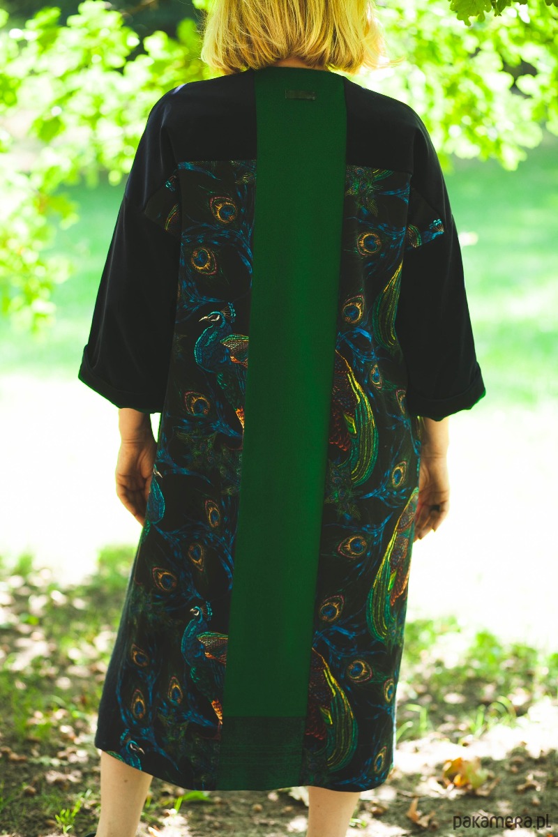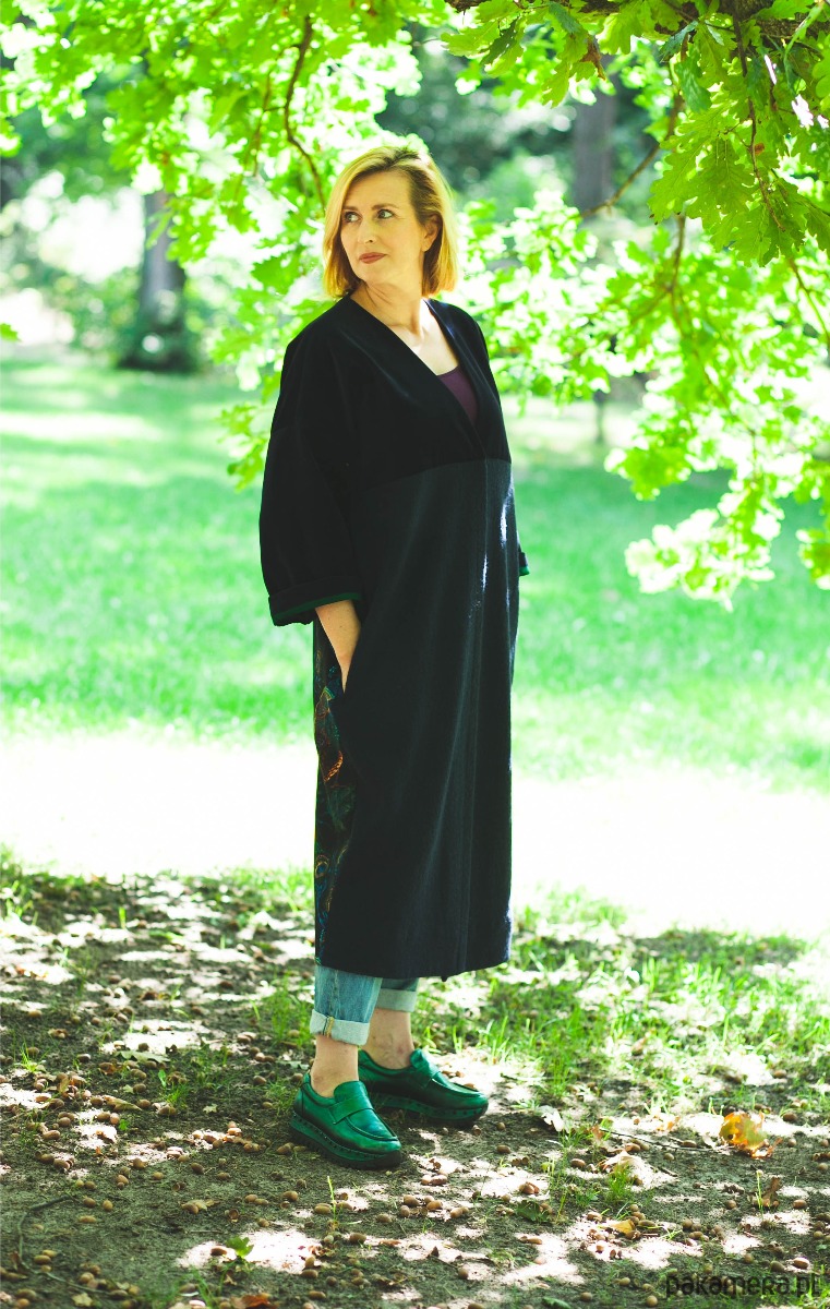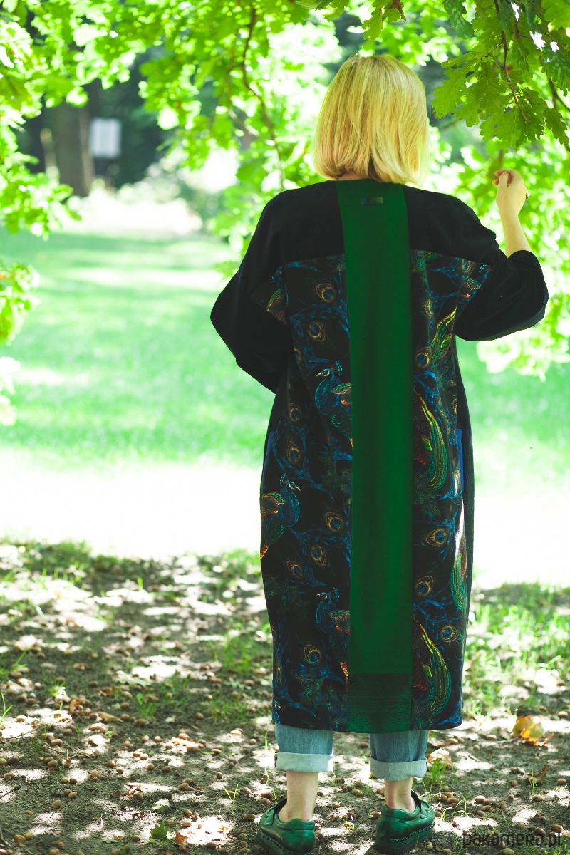 Płaszcz kimonowy o wyjątkowym, niepowtarzalnym charakterze, łączący różnorodne faktury i kolory w spójną, artystyczną całość. Wykonany z miękkiego, szlachetnego aksamitu bawełnianego, który nadaje mu eleganckiej głębi i subtelnego połysku. Na tyle znajduje się wyrazisty, pionowy pas z zielonej wełny, stanowiący mocny akcent i podkreślający sylwetkę.