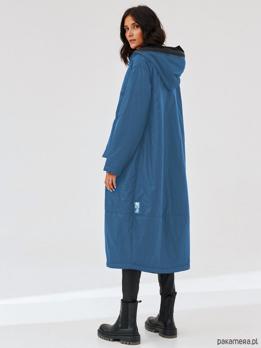 Kurtka Afera z ultra lekkiej tkaniny. Forma kurtki to ciekawy kształt kokonu. Kaptur wykończony strukturalnym wełnianym ściągaczem z ozdobną wytłaczaną, wegańską "skórką". Na przodzie naszywane, lekko przestrzenne kieszenie. Kurtka - płaszcz jest ocieplany i wykończony od środka podszewką.