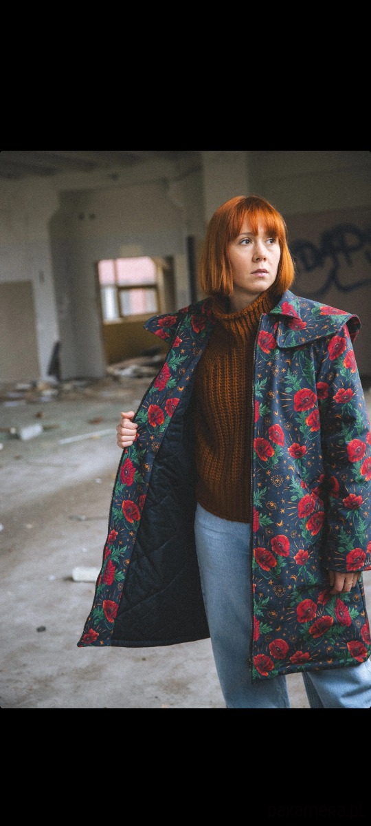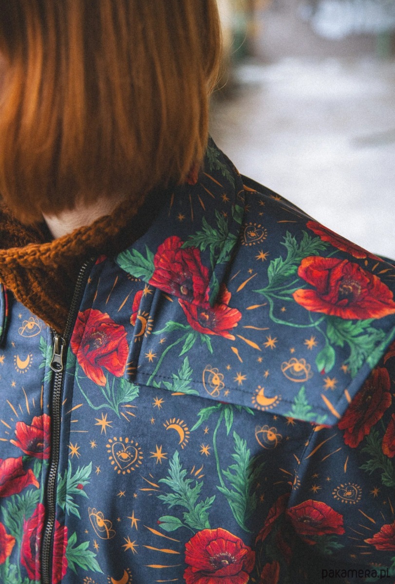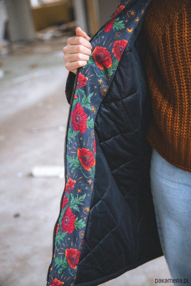 Płaszcz został uszyty z softshellu, który zapewnia cyrkulację powietrza, a zarazem chroni przed wiatrem. Odznacza się dużą odpornością na wodę. Płaszcz posiada od wewnątrz ocieplaną podszewkę. Zapinany jest na zamek. Ten model ma obszerny kaptur zakończony patkami na ramionach, co dodatkowo chroni przed deszczem. Posiada również praktyczne kieszenie z klapkami. Wzór płaszcza jest bardzo przyciągający, nie tylko ze względu na swój krój, ale również na wzór na płaszczu, który został zaprojektowany wyłacznie dla ŻE-CO.