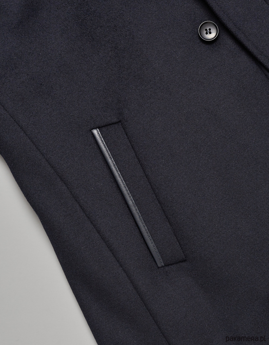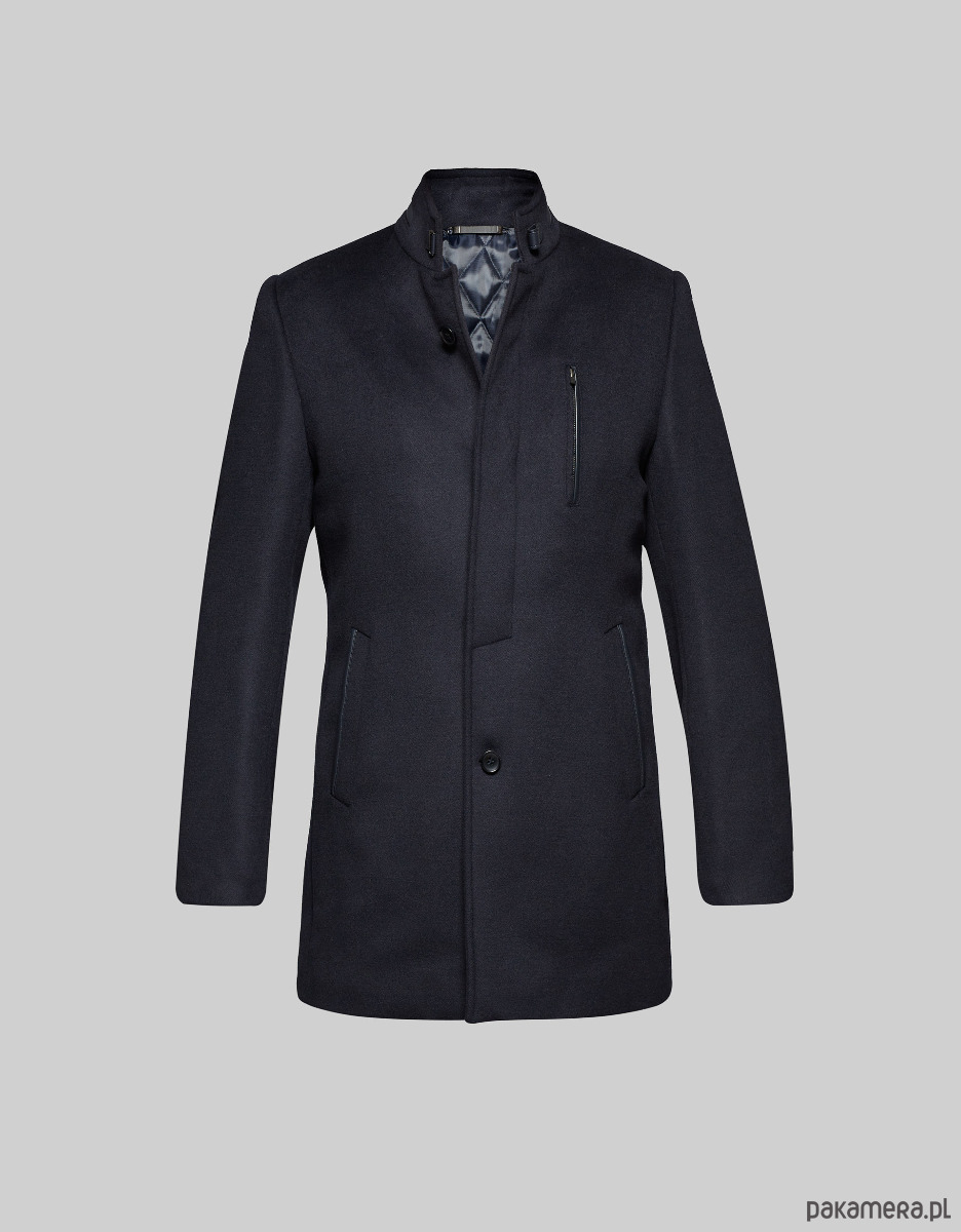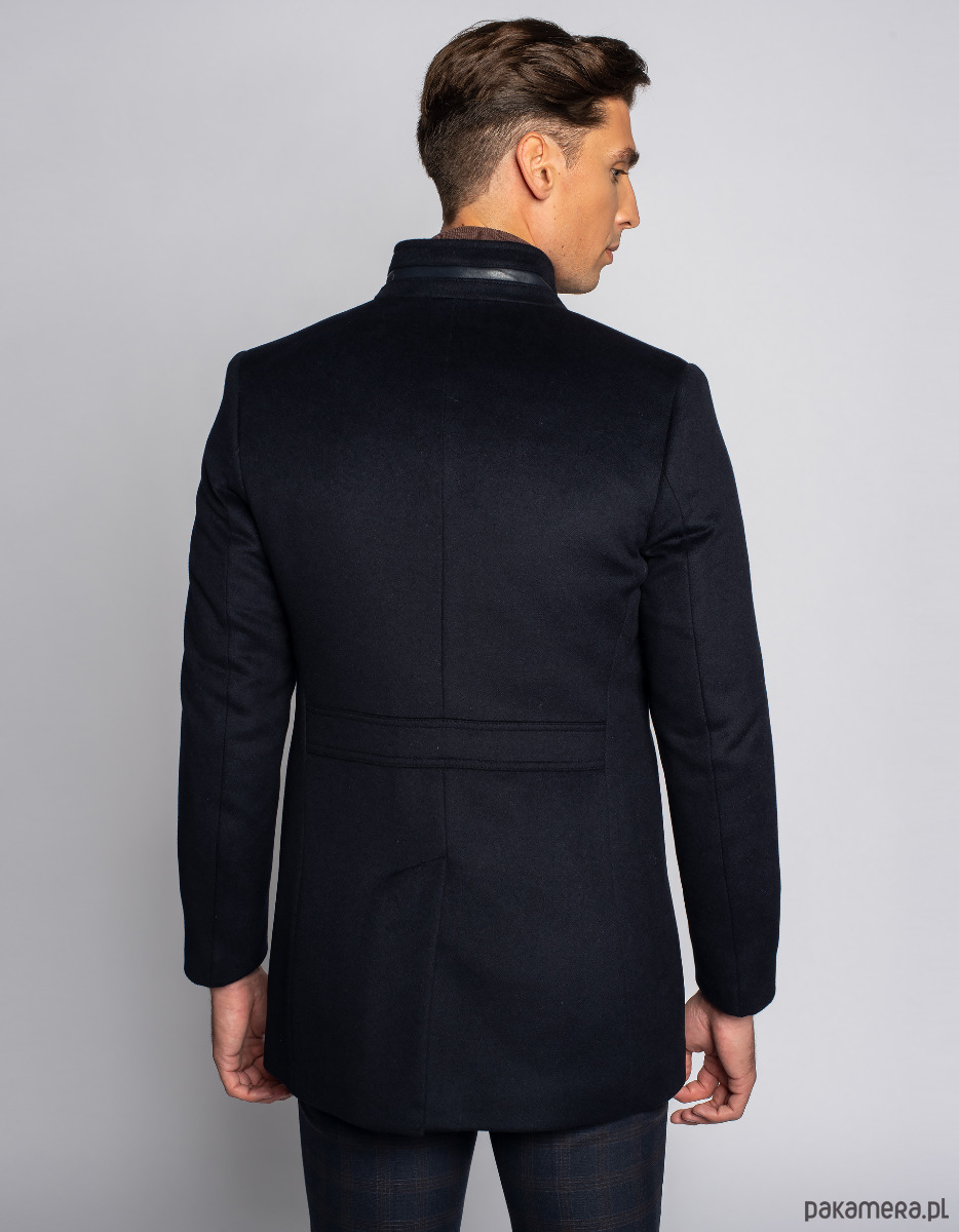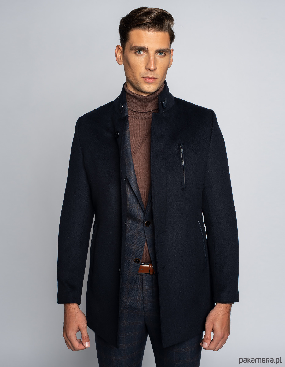 Płaszcz męski riposto granatowy płaszcz riposto granatowy 48Riposto to elegancki płaszcz w kolorze granatowym, wykonany z wysokiej jakości wełny z domieszką wiskozy oraz włókien syntetycznych. Krótsza długość płaszcza wydłuża optycznie sylwetkę, a jednocześnie idealnie zakrywa marynarkę. Zapinany na stójkę, którą charakteryzuje dyskretne skórzane wykończenie, występujące również przy kieszeniach. Zaprojektowany z krytą plisą zakończoną przed ostatnim, dolnym guzikiem, rozcięciem z tyłu oraz stójką chroniącą przed zimnem. Wysoki komfort użytkowania zapewnią trzy kieszenie zewnętrzne (w tym pionowa na zamek) ocieplane przyjemną w dotyku, dedykowaną tkaniną oraz dwie praktyczne kieszenie wewnętrzne na zamek. Świetnie sprawdzi się w klasycznym zestawie z garniturem oraz w stylizacjach smart casual. Występuje w alternatywnej wersji kolorystycznej. Przy wyborze rozmiaru sugerujemy jeden rozmiar większy, ponieważ płaszcz ma dopasowany krój.