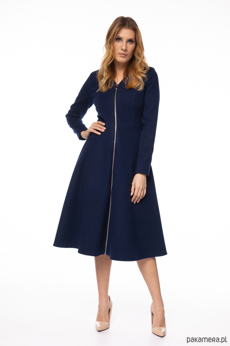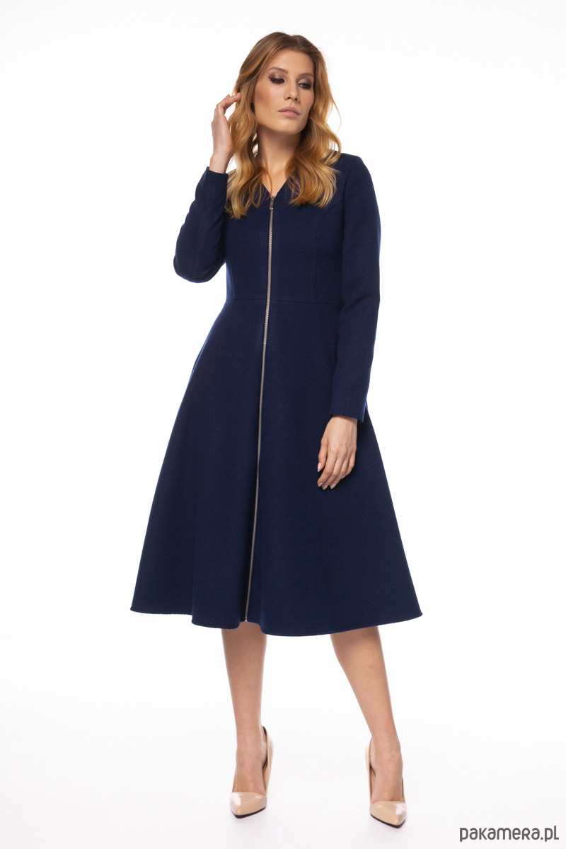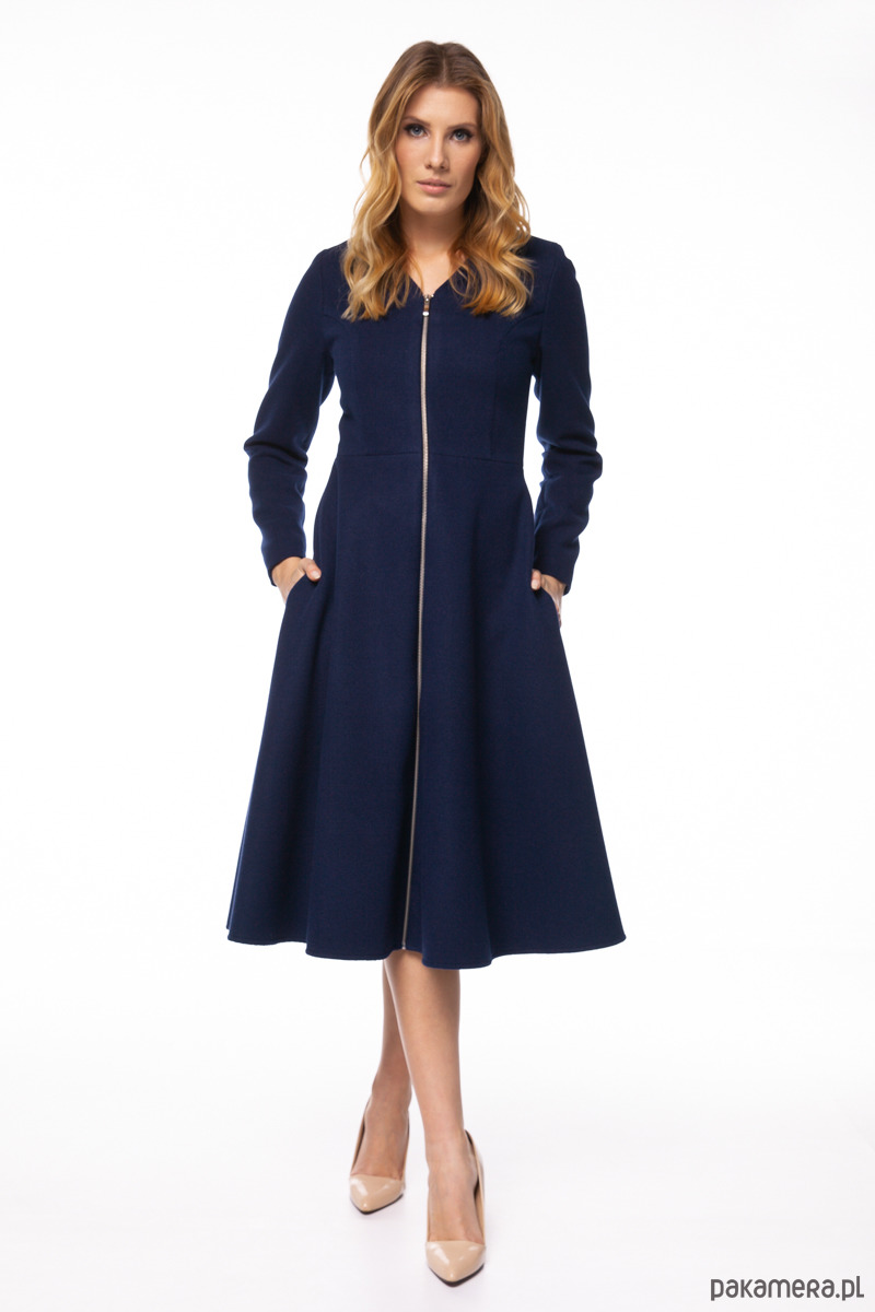 Wiosenny płaszcz uszyty z granatowego flauszu wiskoza z poliestrem, na wiskozowej podszewce. Góra dopasowana, mała stójka. Dół rozkloszowany z kieszeniami w bokach. Metalowy zamek, długość od talii 73 cm. Modelka na zdjęciu ma 177 cm. Przed zakupem prosimy o dokładne zmierzenie sylwetki.