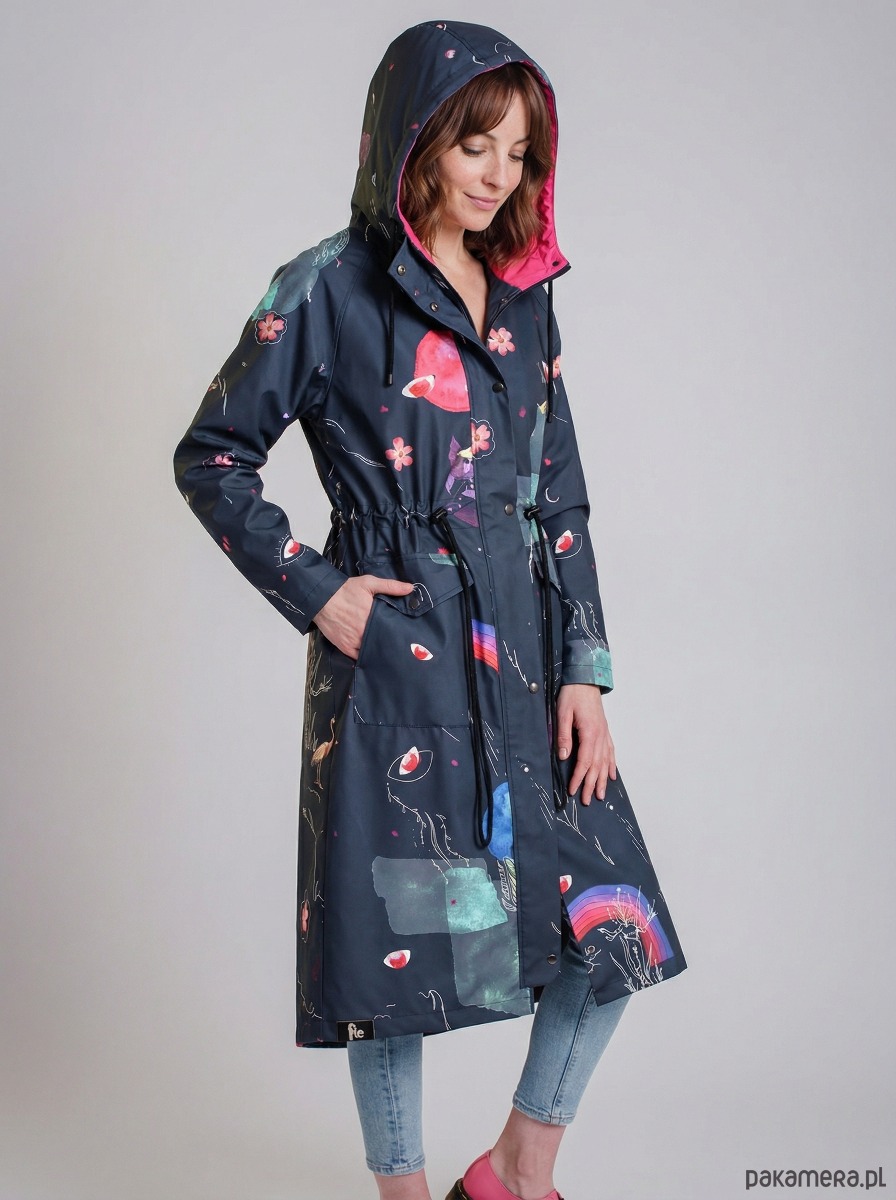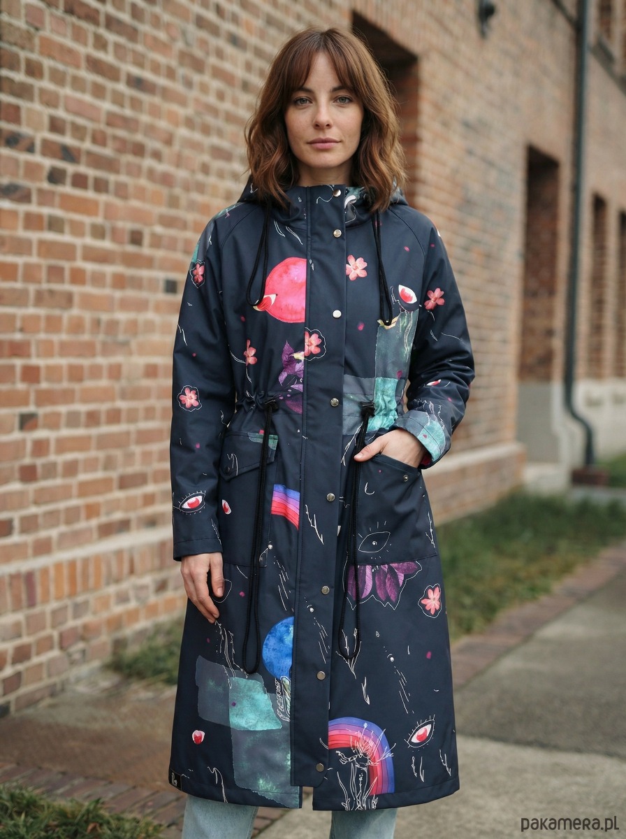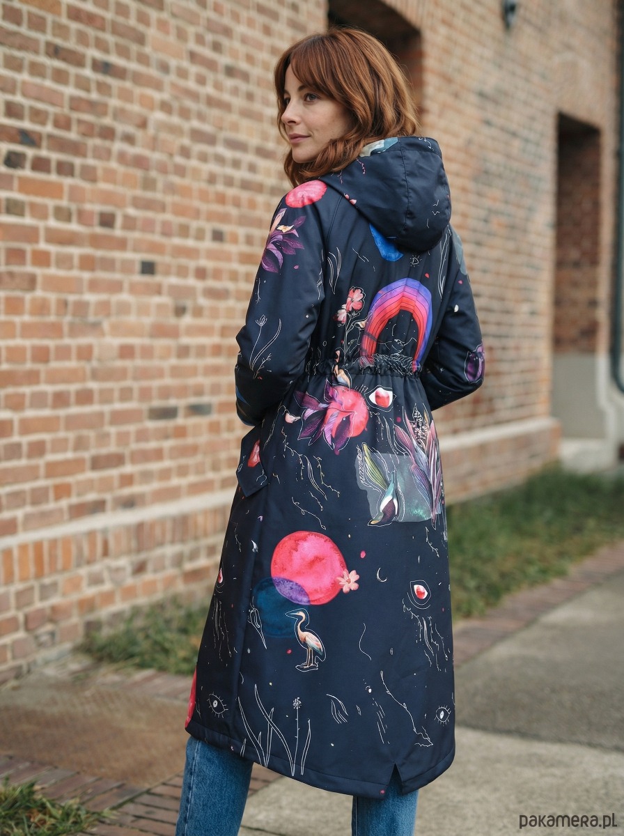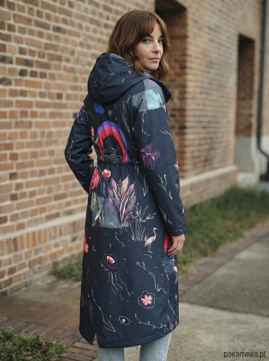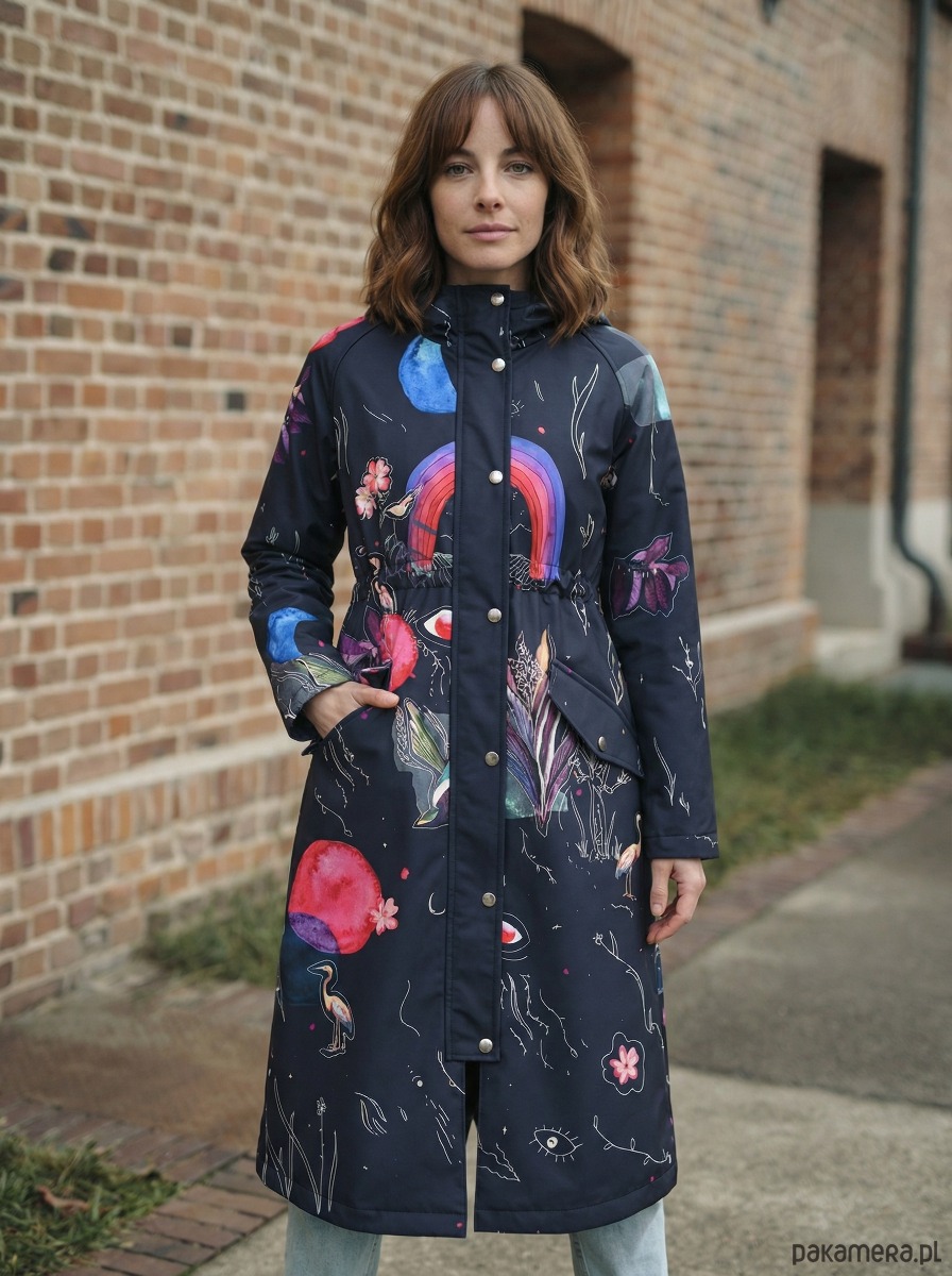 Płaszcz Rainbow to wyjątkowy model z autorskim wzorem inspirowanym naturą i motywami kosmicznymi. Połączenie grafitowej bazy z wielobarwnymi detalami tworzy efektowny, nowoczesny design, który przyciąga uwagę i wyróżnia stylizację.