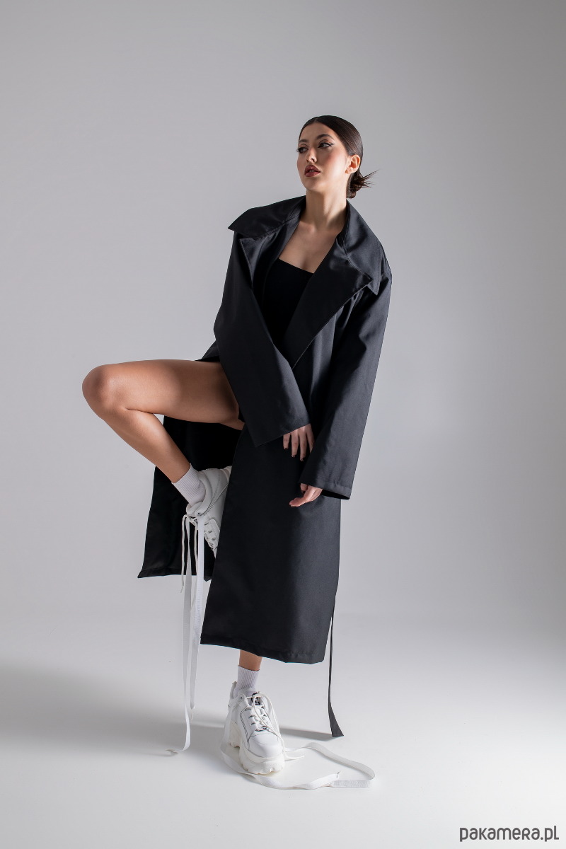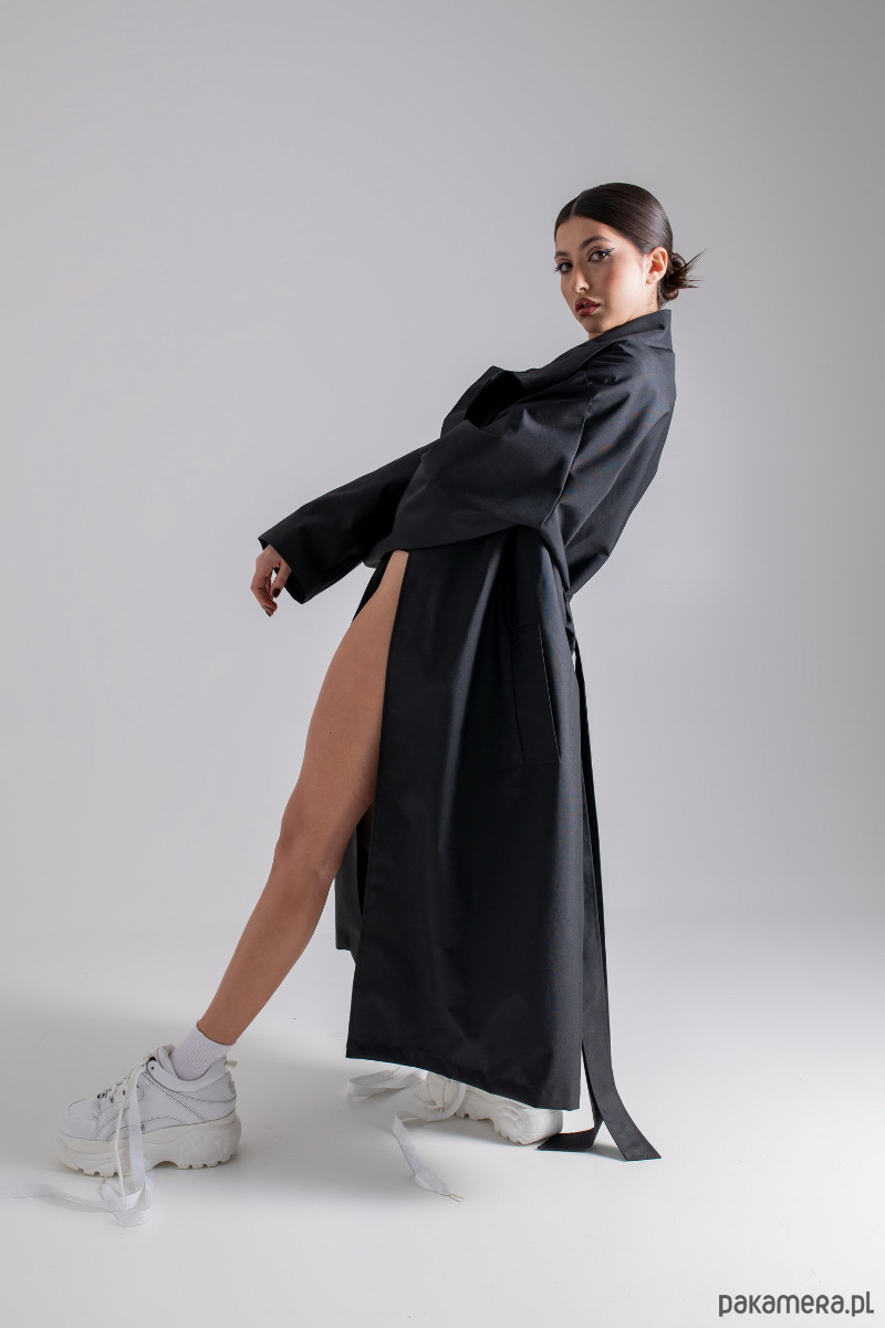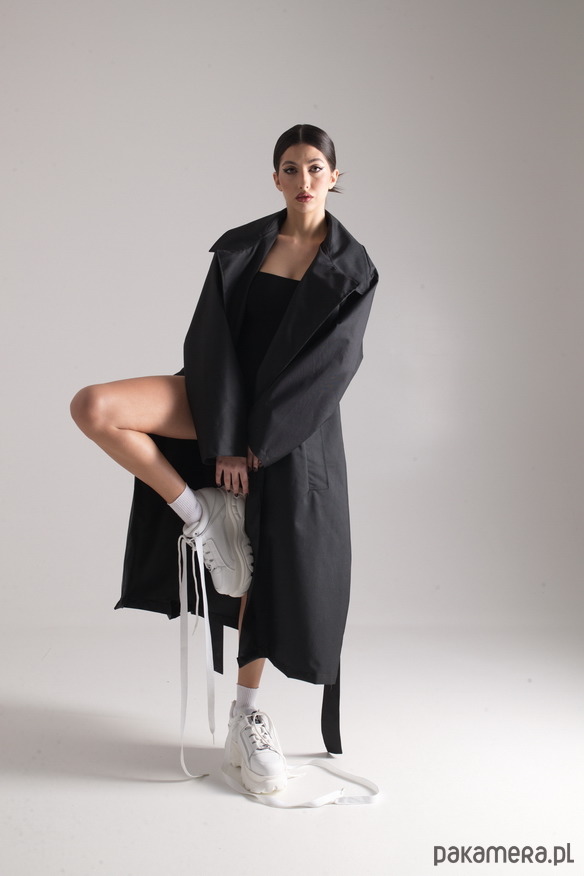 Oversizowy krój, obniżona linia ramion, duży kołnierz, szerokie rękawy, długi pasek w talii umożliwiający różne kombinacje noszenia, po bokach pojemne kieszenie, rozcięcie z tyłu