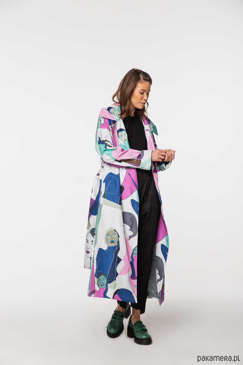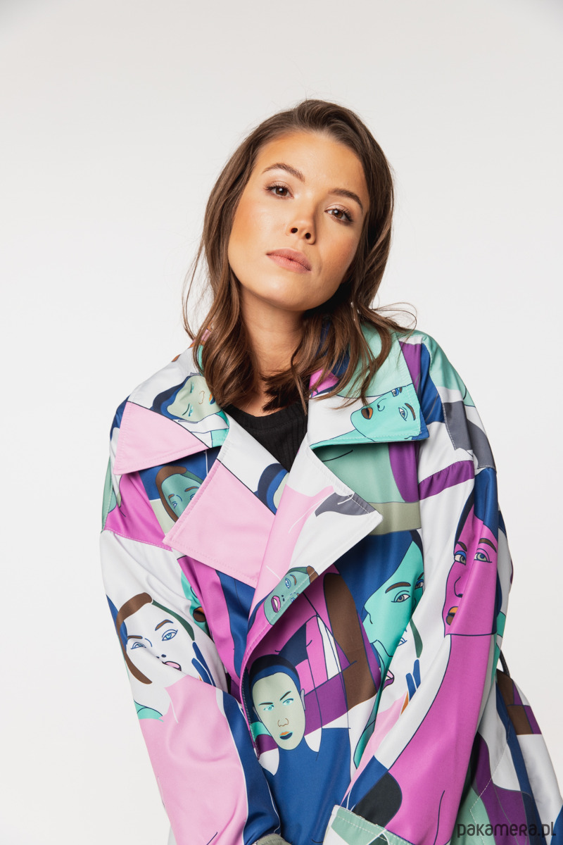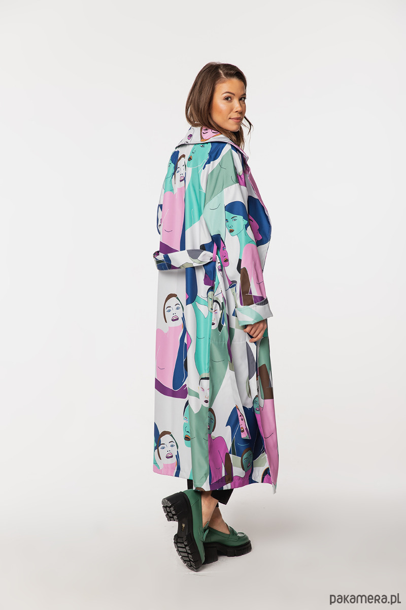 Płaszcz Vanita Faces to wyjątkowy model o artystycznym charakterze, stworzony dla kobiet, które lubią wyróżniać się stylem. Autorski print inspirowany motywem twarzy nadaje całości nowoczesny, wyrazisty wygląd i przyciąga uwagę.