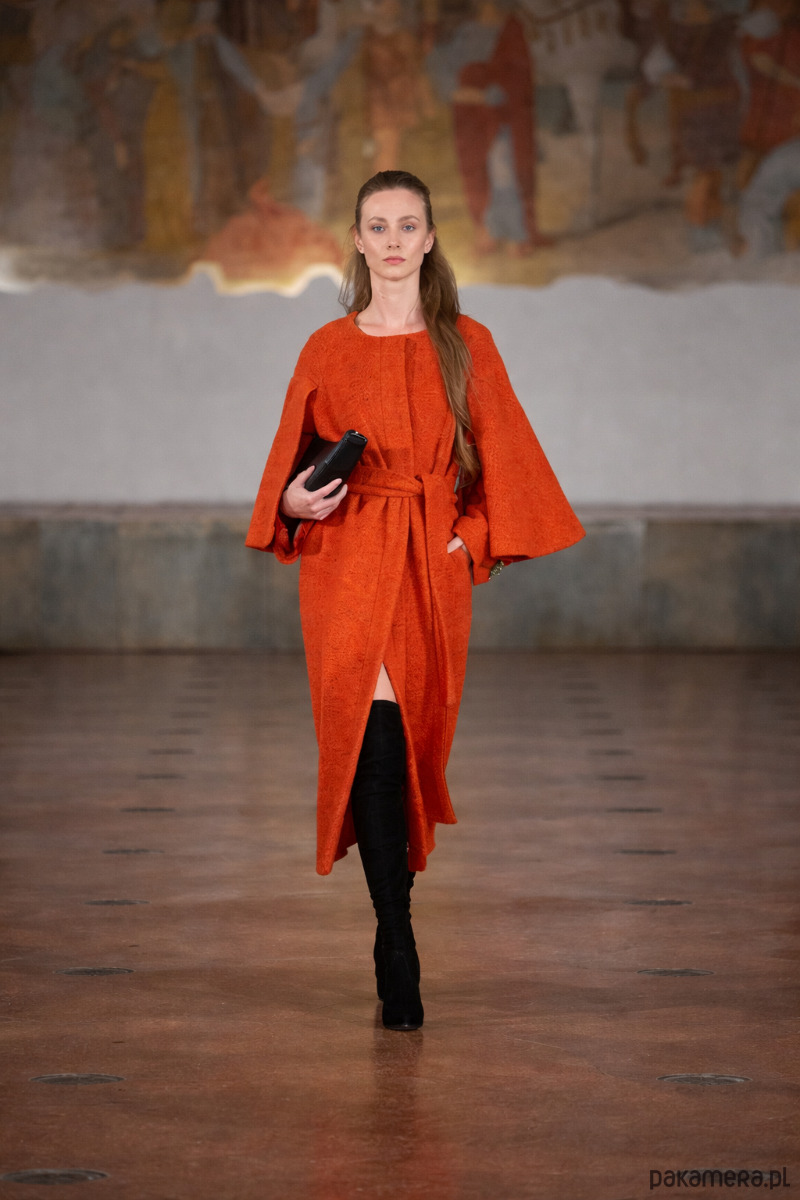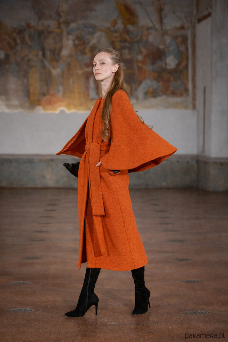 Płaszcz wykonany jest z wysokogatunkowej wełny włoskiej, w kolorze pomarańczowym, wykończony jest podszewką z mieszkanki jedwabiu i wiskozy w tym samym kolorze.