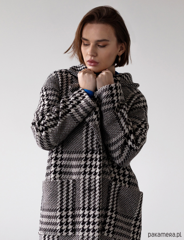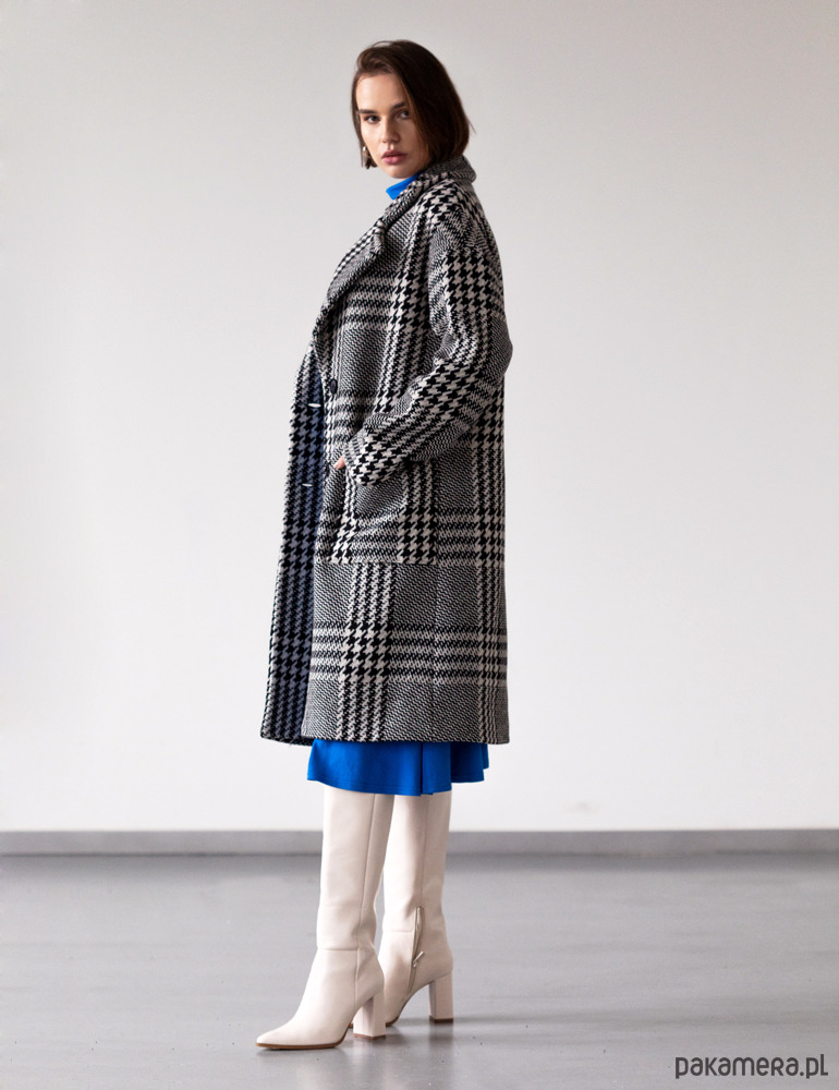 Elegancki wełniany płaszcz o prostym, nowoczesnym kroju. Ekskluzywnego charakteru nadaje mu misternie układany wzór kraty oraz tkanina o wyrazistej strukturze, z której został uszyty. Dzięki swojej uniwersalności płaszcz świetnie sprawdzi się w eleganckich zestawach, jak również w wersji bardziej sportowej ze sneakersami i ulubionym dresem.