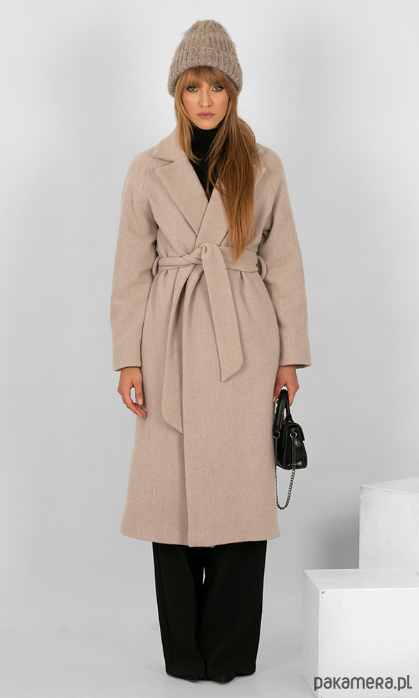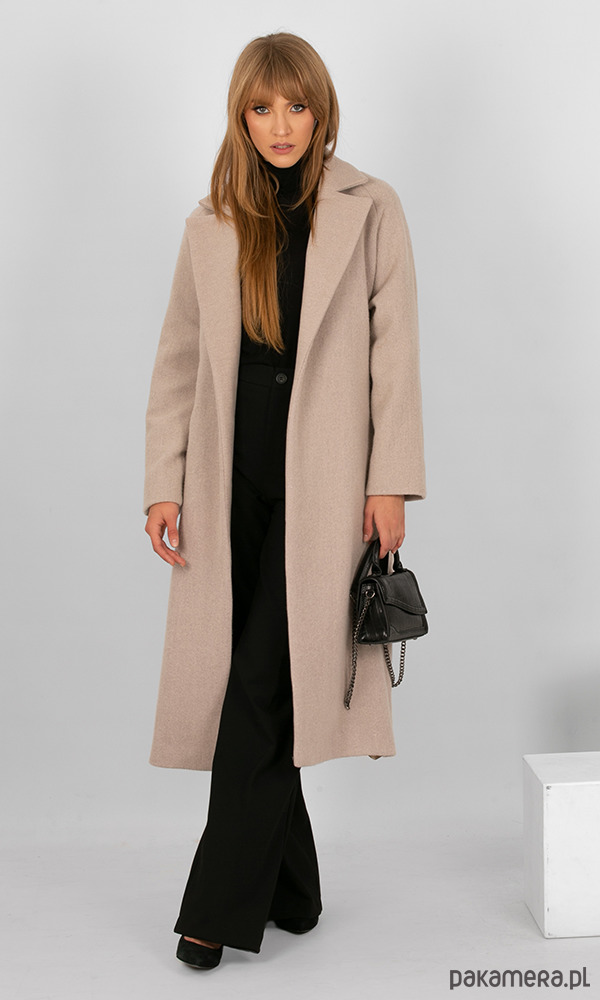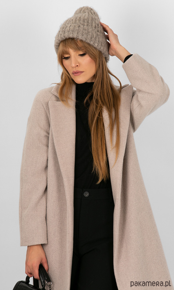 Elegancki, ciepły płaszcz wykonany z najwyższej jakości wełny polskiej produkcji, miłej i delikatnej w dotyku. Modny i szlachetny kolor w tonacji chłodnego beżu/ café latte. Tkanina jest grubsza i mięsista, ogrzeje Cię w chłodne dni.