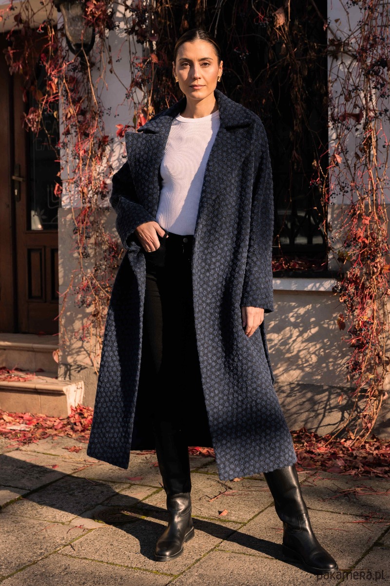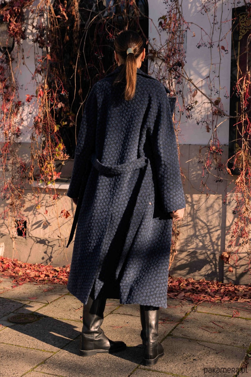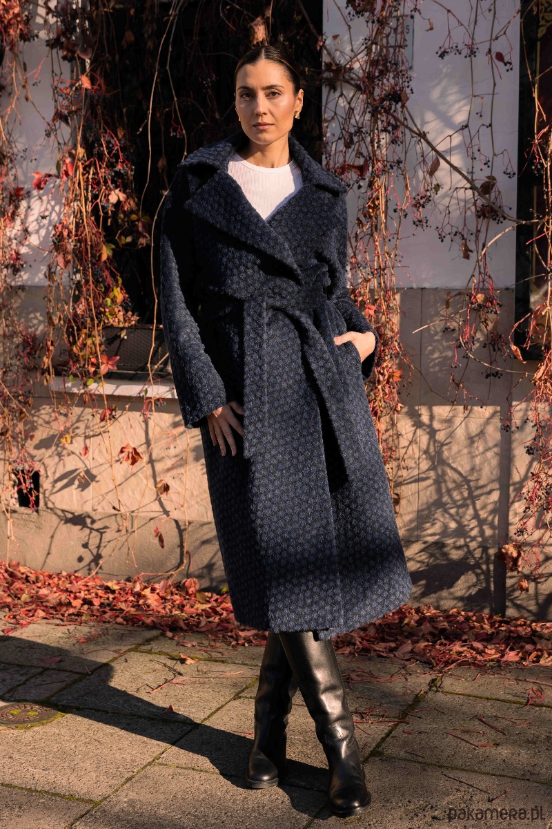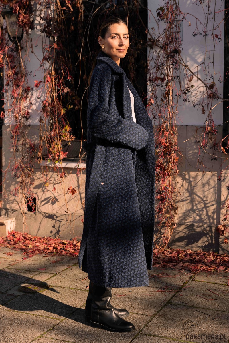 Idealnie skrojony, klasyczny płaszcz z pięknymi rękawami i kołnierzem. Płaszcz długi, delikatnie rozszerzający się ku dołowi, wiązany paskiem w talii. Płaszcz posiada kieszenie.