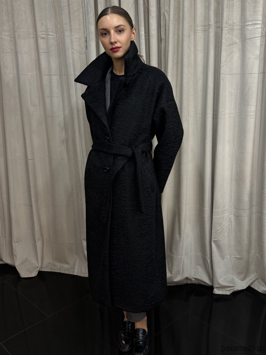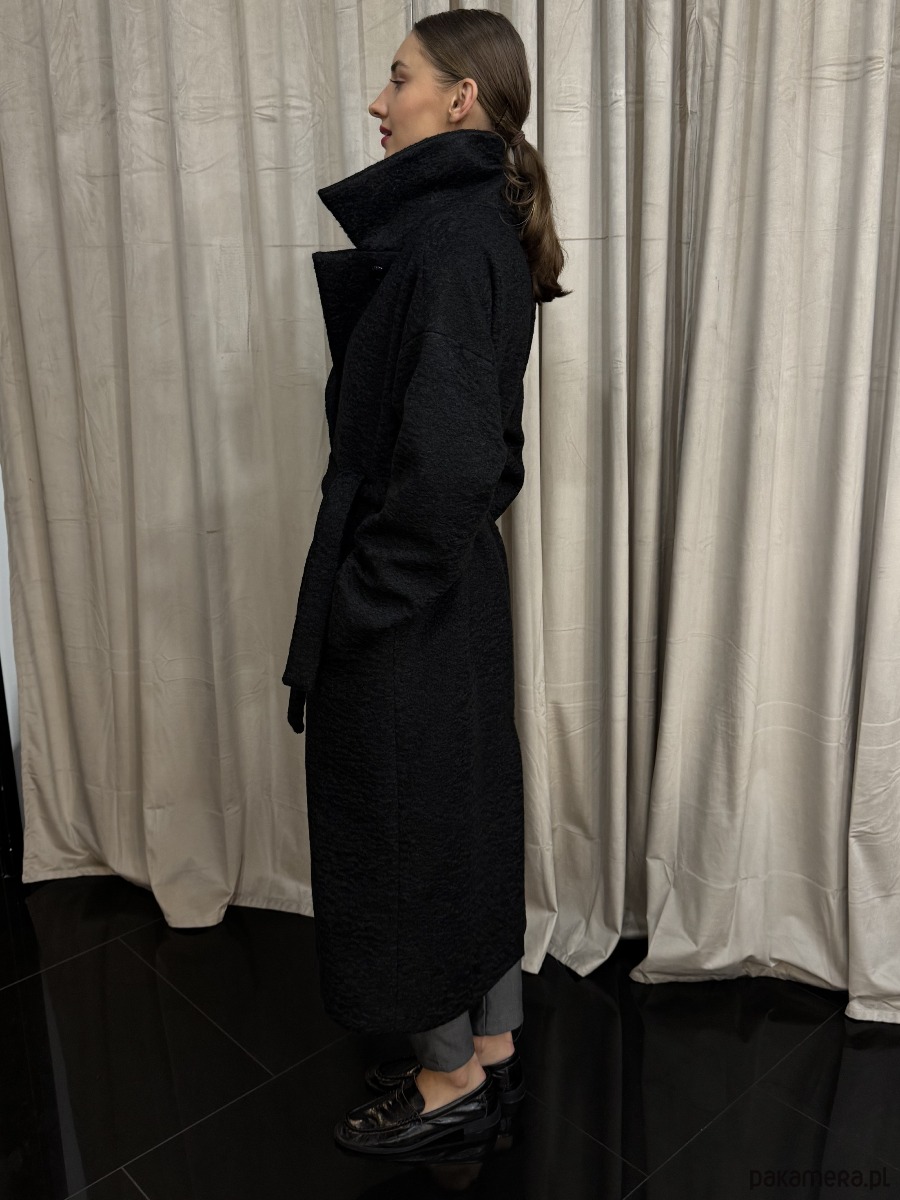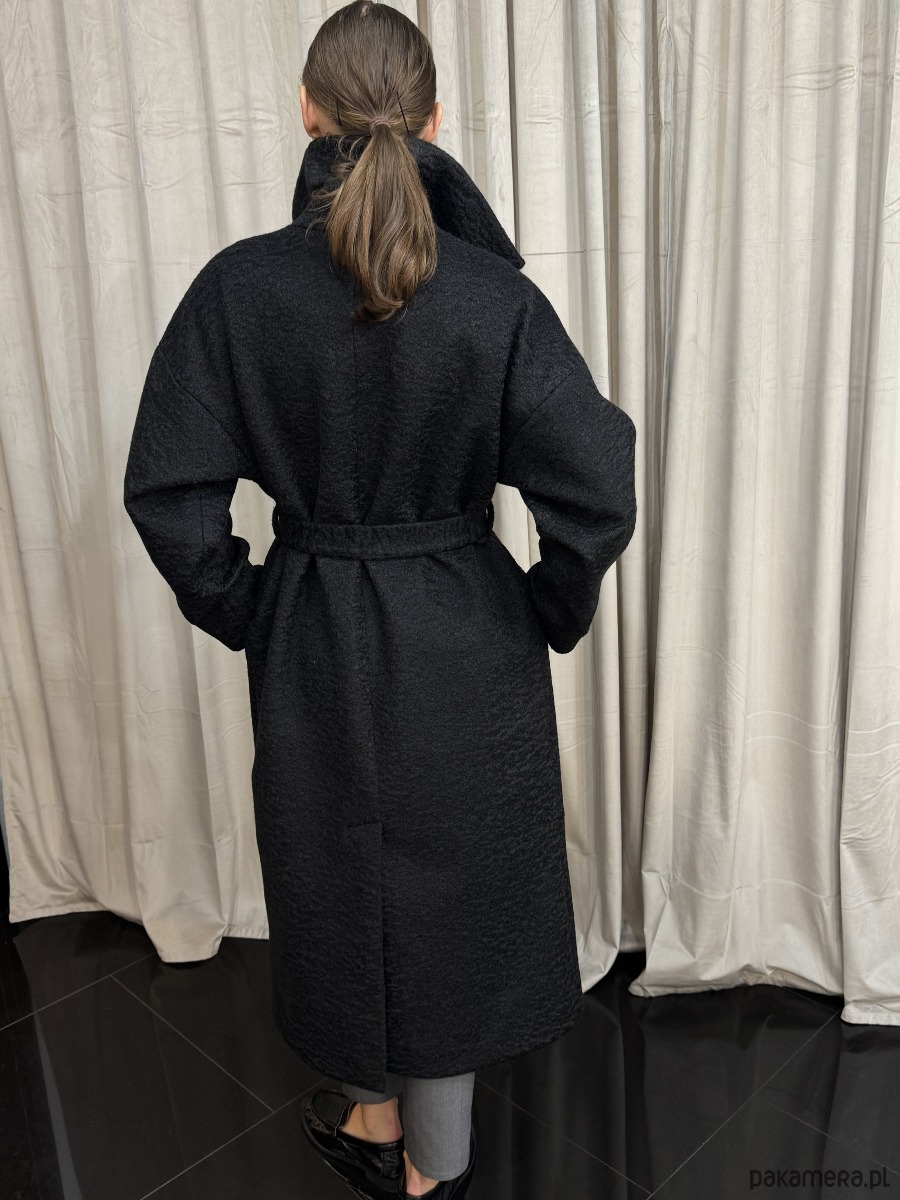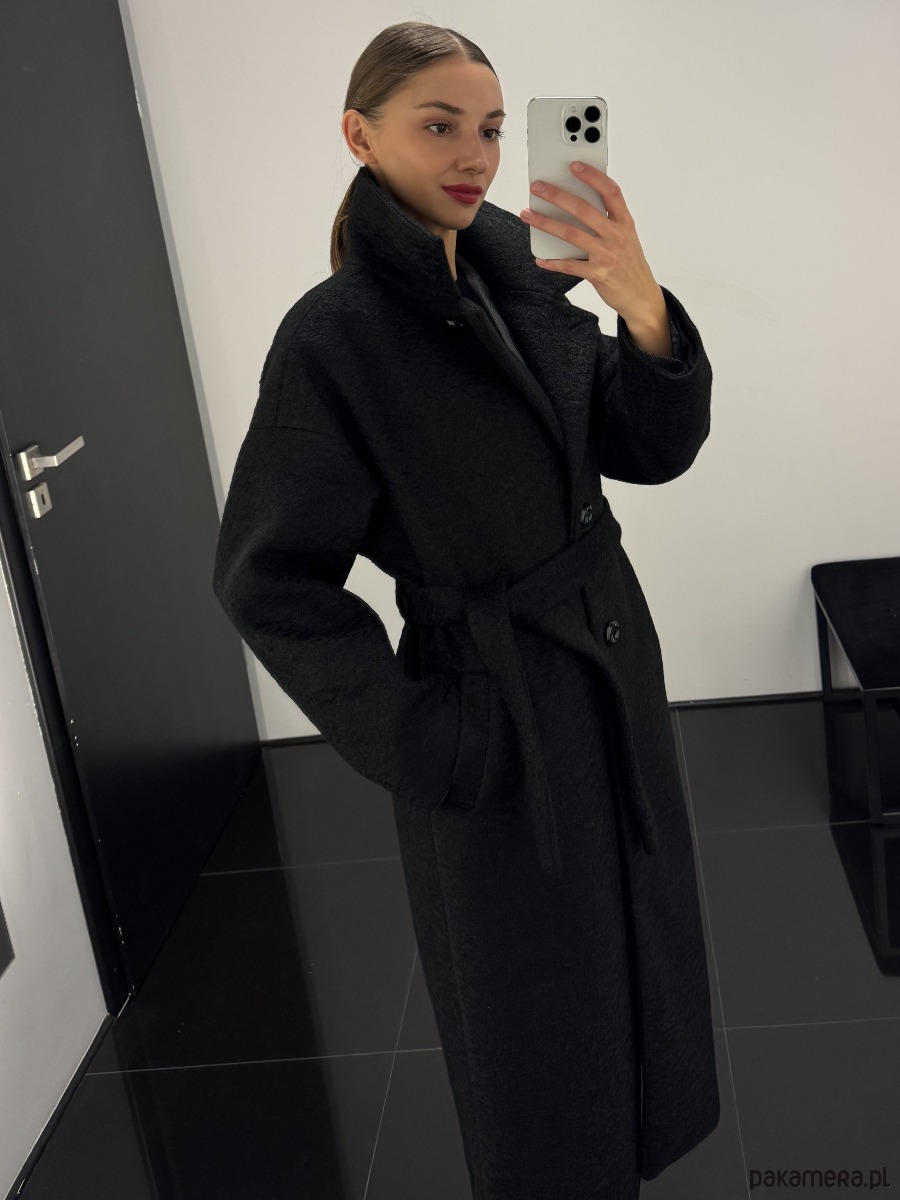 Długi a la karakuł zimowy płaszcz oversize czarny z wełną - wygląda jak piękne lekkie futro.