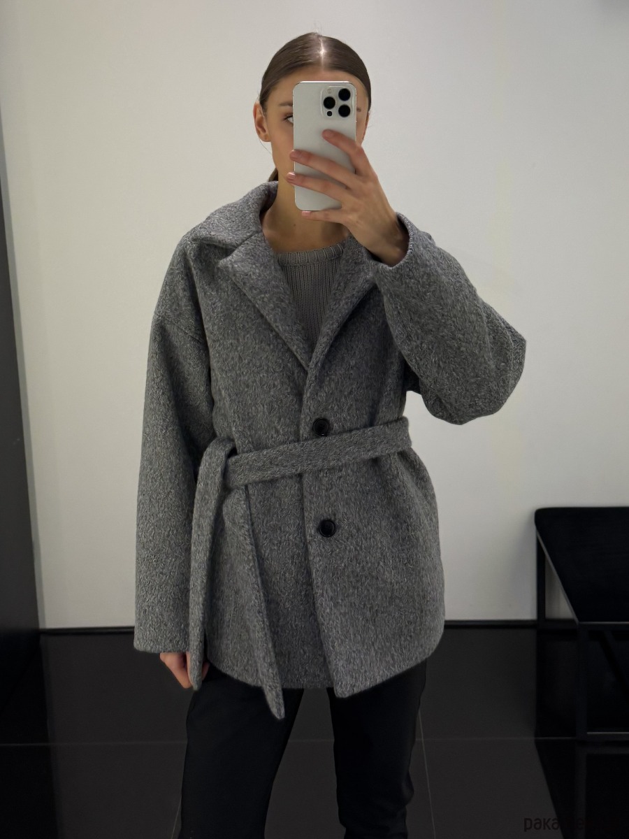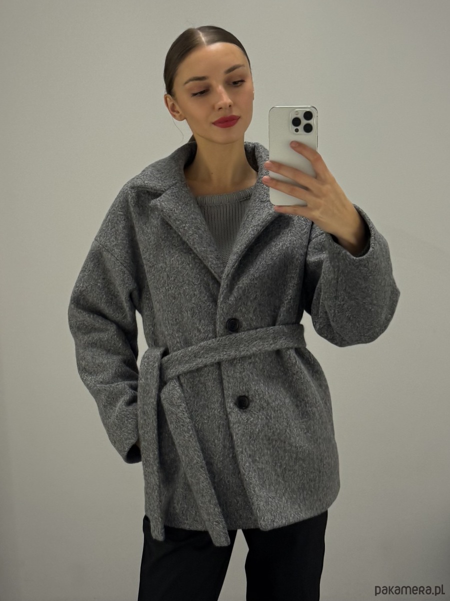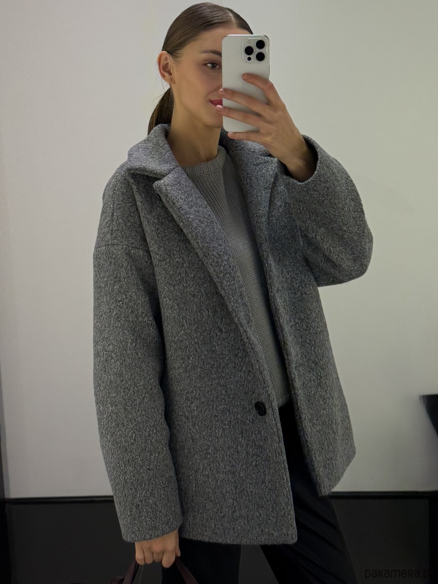 Krótki a la karakuł zimowy płaszcz oversize szary z wełną - wygląda jak piękne lekkie futro.