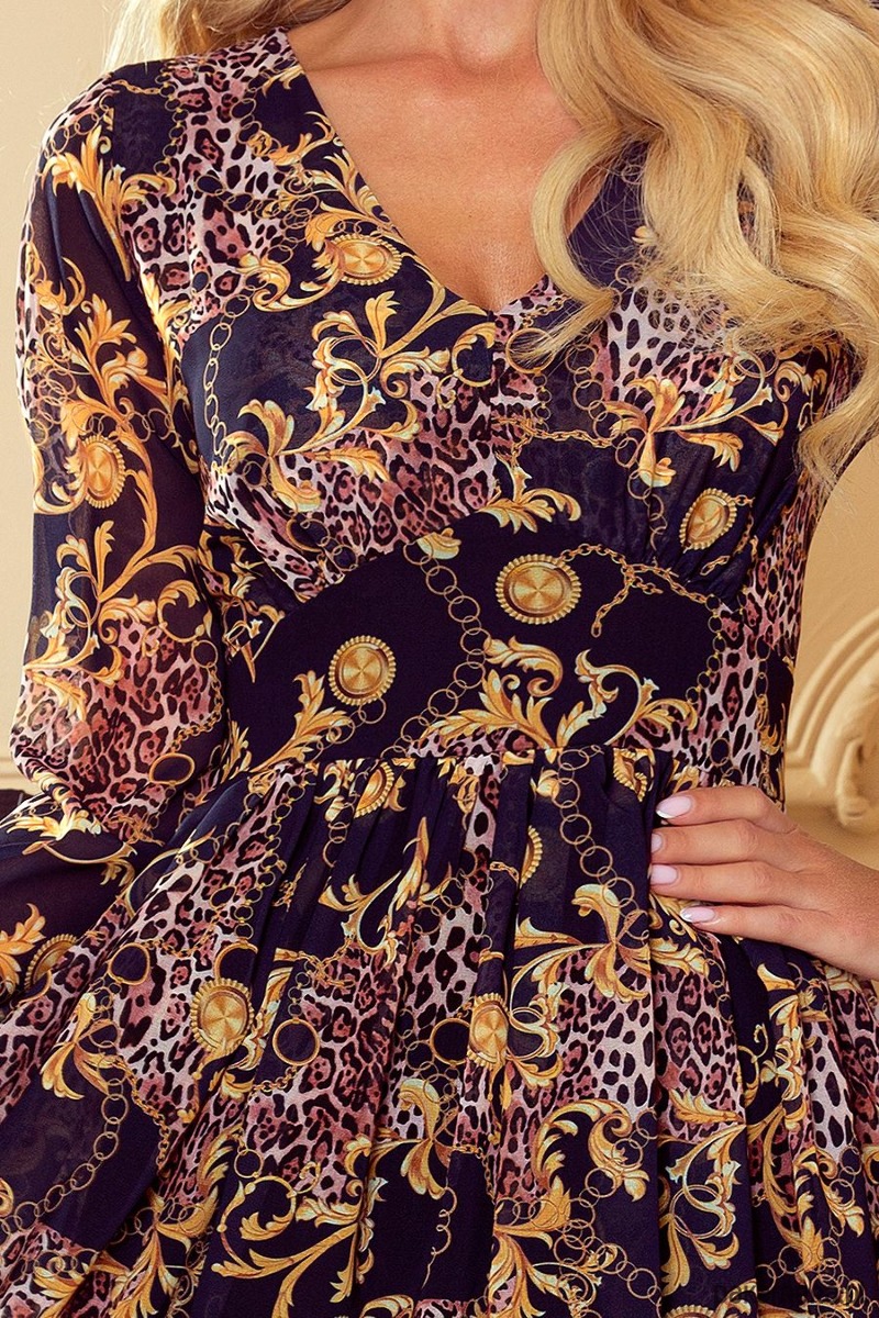 Szyfonowa sukienka z dekoltem i wiązaniem na plecach. Wzór: złote łańcuszki i panterkowe wstawki na granatowym tle. Produkcja polska. Marka Numoco.