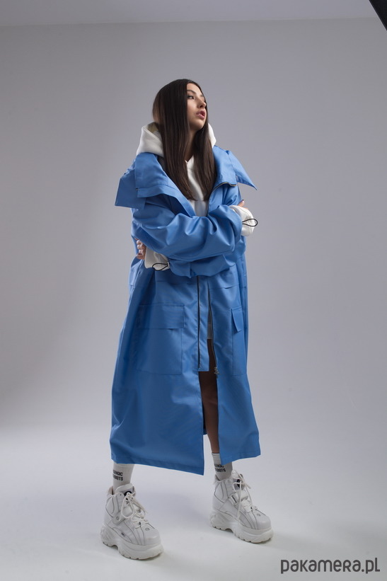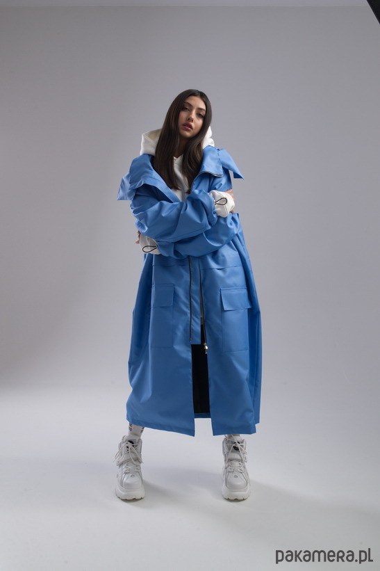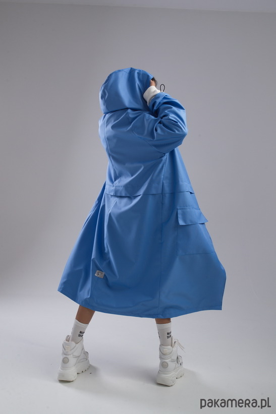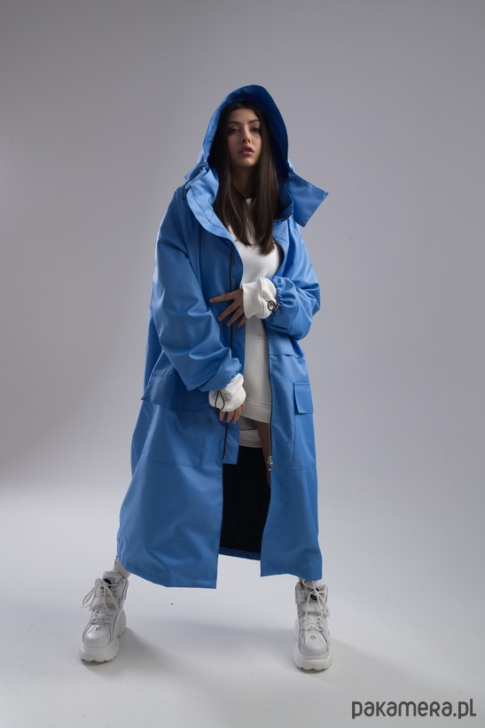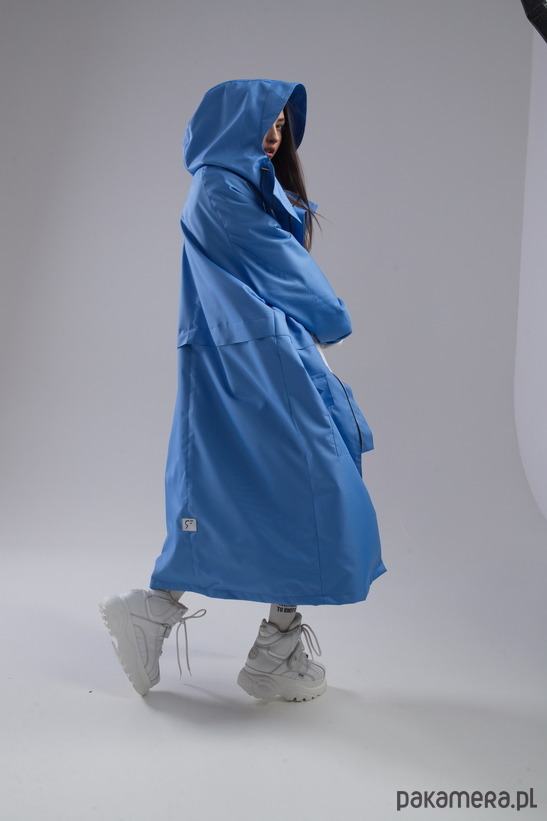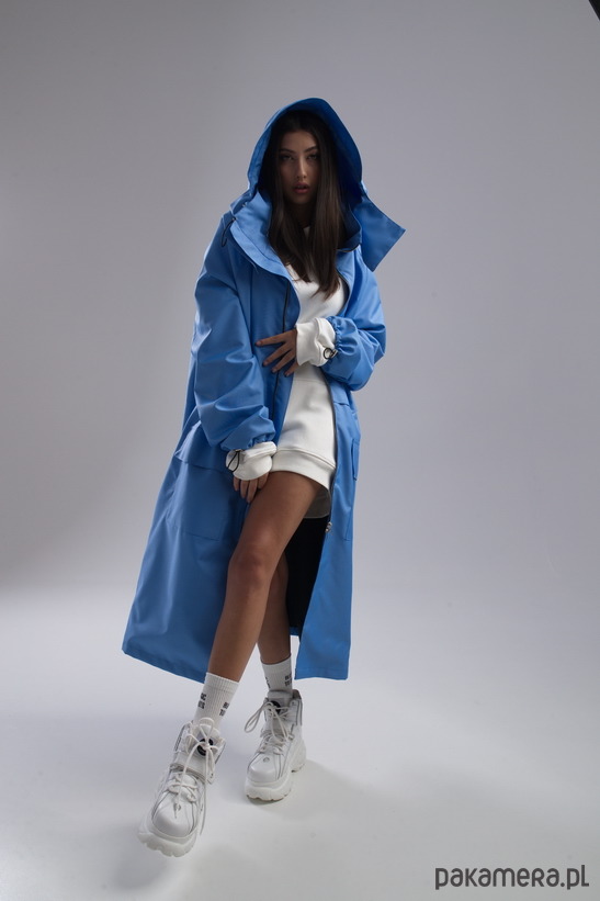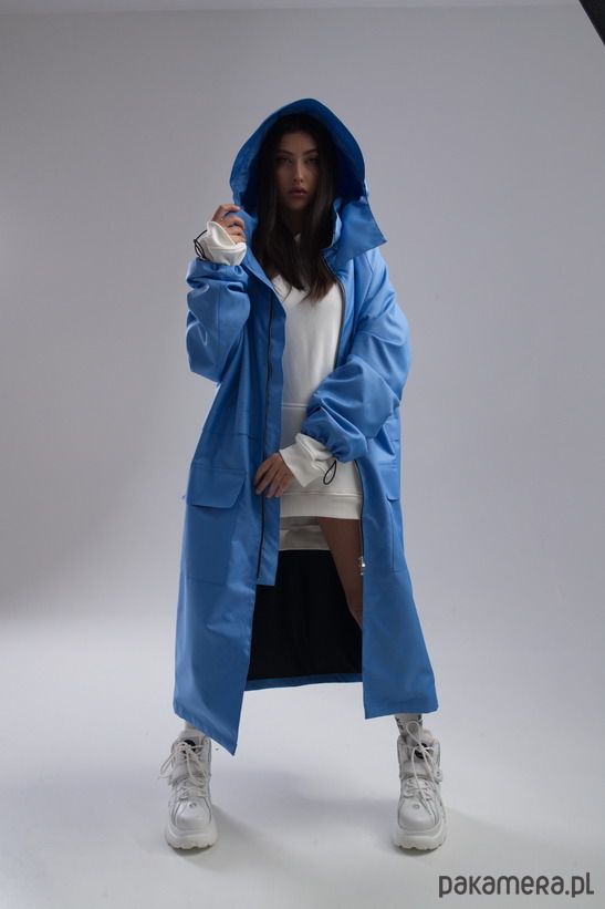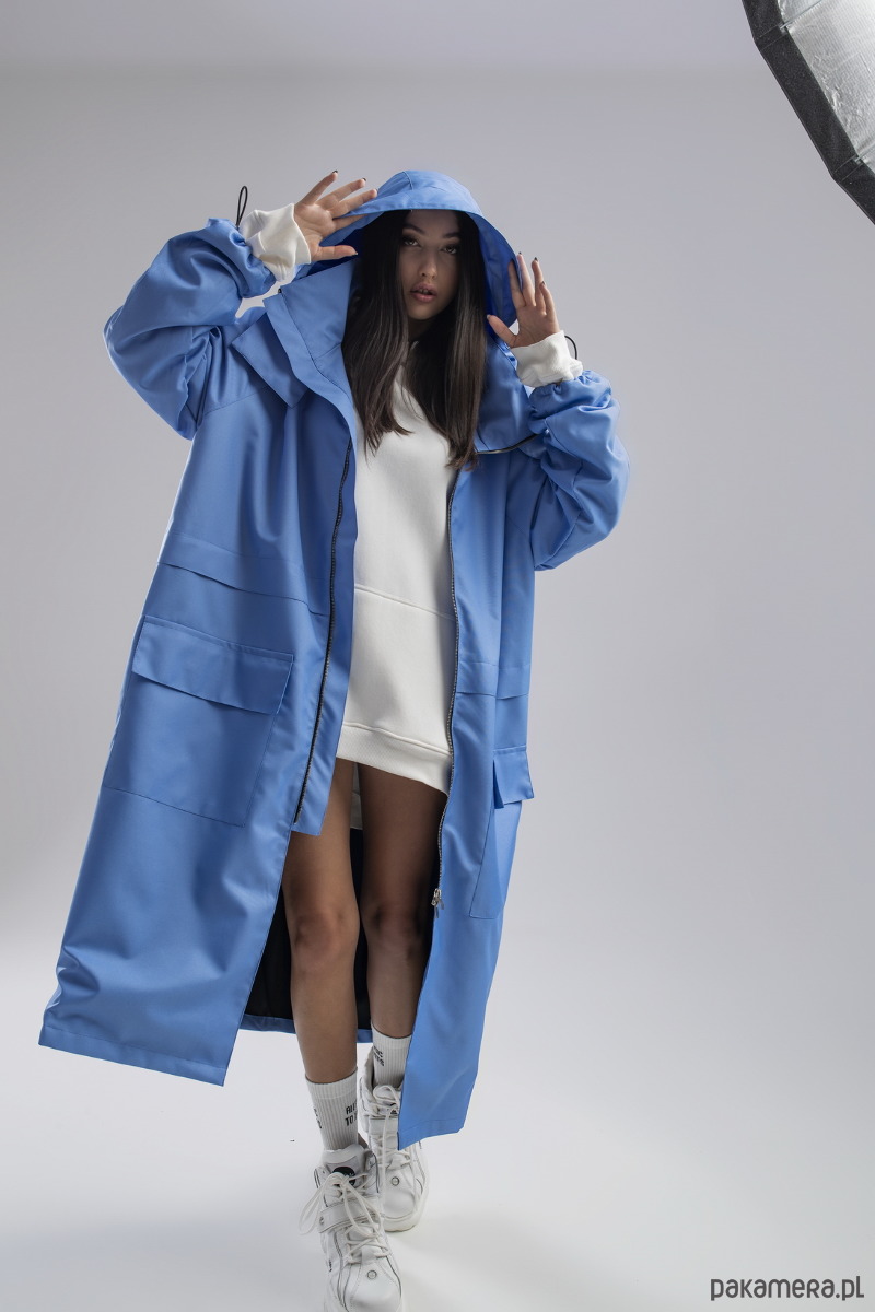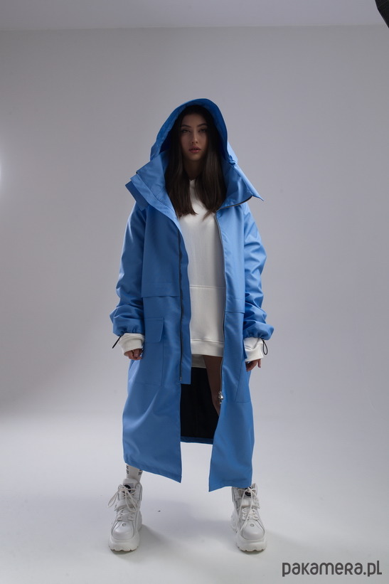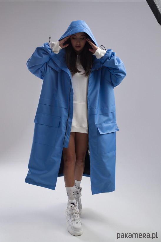 Parka longline hoodie oversize, uszyta z przeciwdeszczowej tkaniny w kolorze baby blue niebieskim, ciemny beż podszyta lekką, czarną podszewką