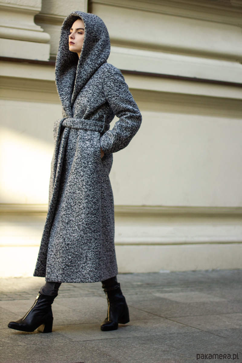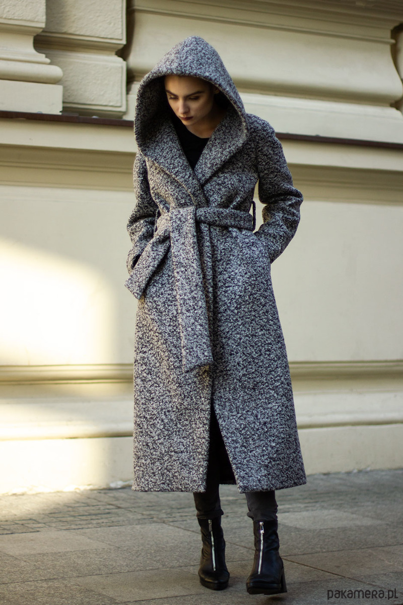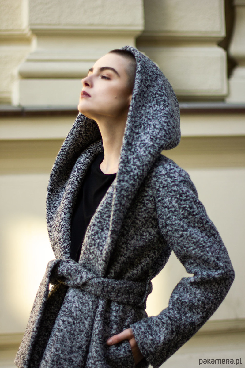 Stylowy, długi płaszcz wiązany w talii. Olbrzymi kaptur ochroni Cię przed chłodem a opuszczony stworzy wielki kołnierz. Przepięknie się układa i doskonale ogrzewa. Elegancki klasyczny krój.