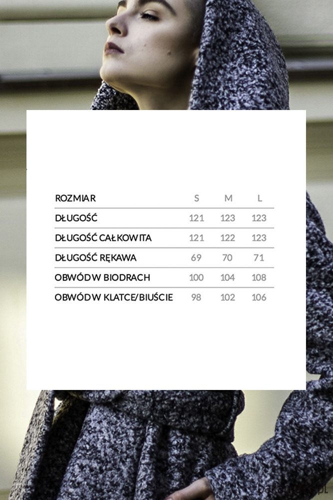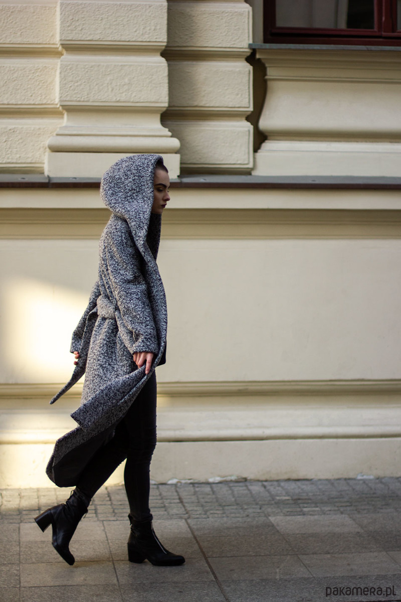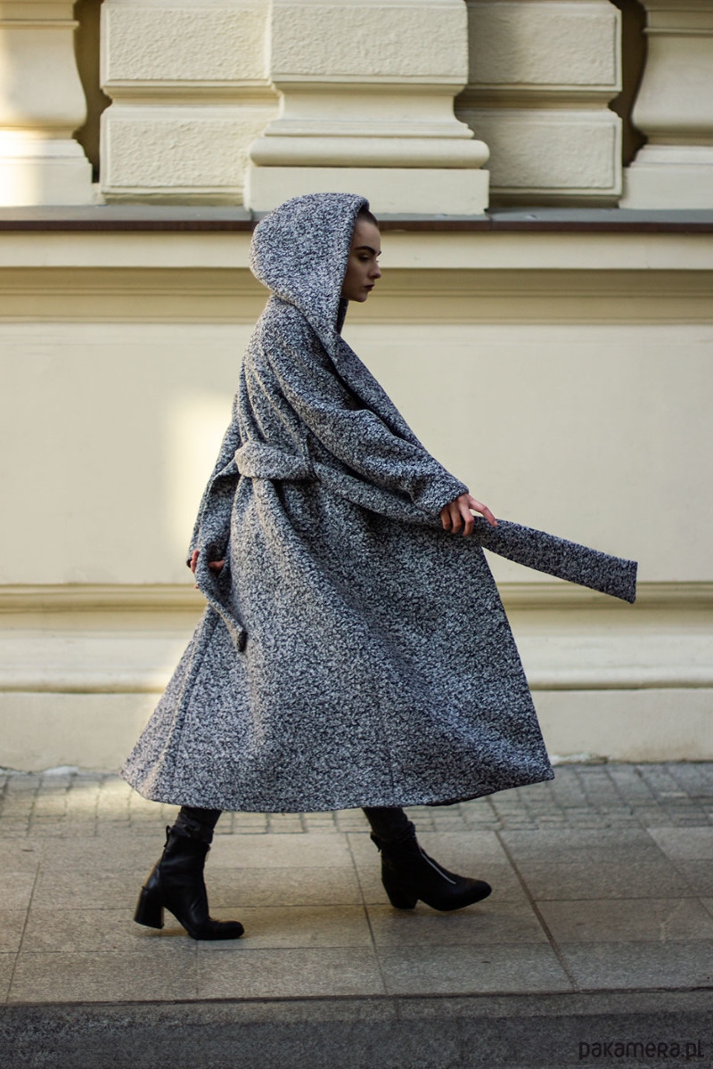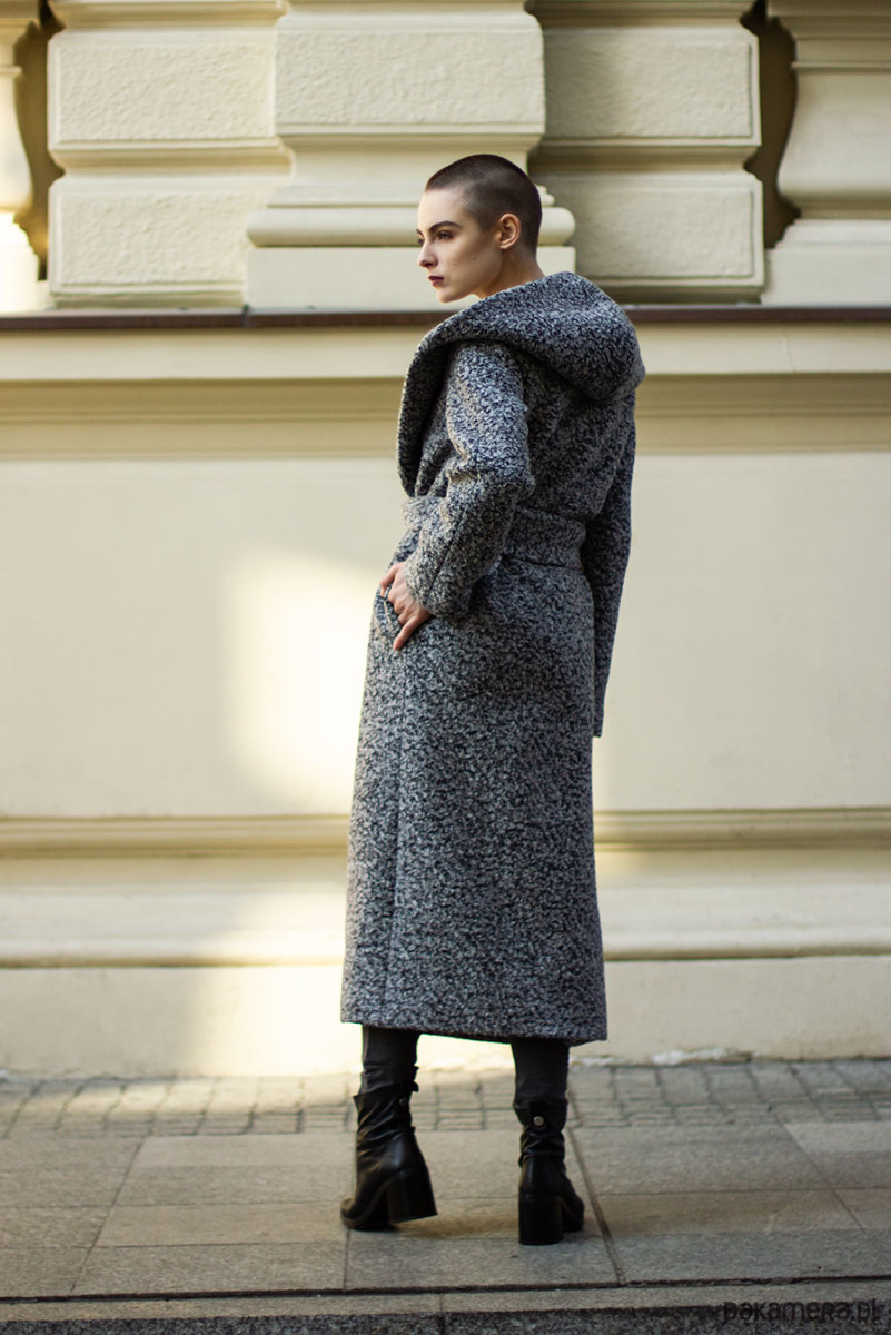 Stylowy, długi płaszcz wiązany w talii. Olbrzymi kaptur ochroni Cię przed chłodem a opuszczony stworzy wielki kołnierz. Przepięknie się układa i doskonale ogrzewa. Elegancki klasyczny krój.