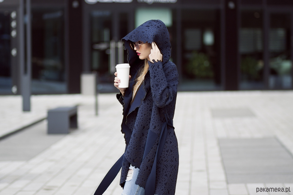 Idealny płaszcz na jesień/wiosnę z dużym kapturem. Uniwersalny krój i luźna forma sprawdzi się w każdej sytuacji.