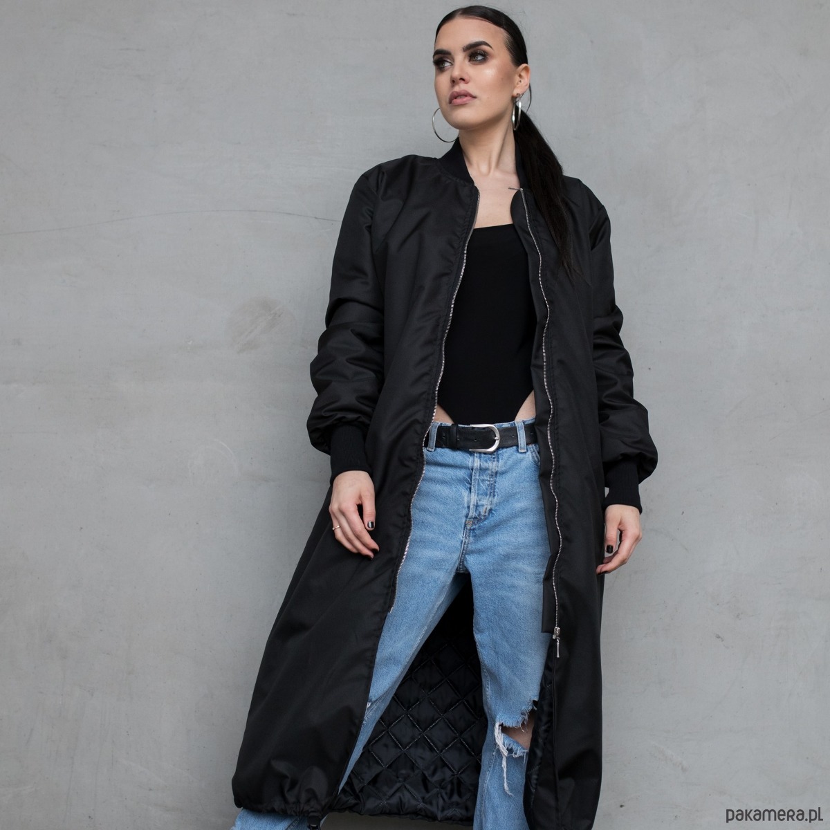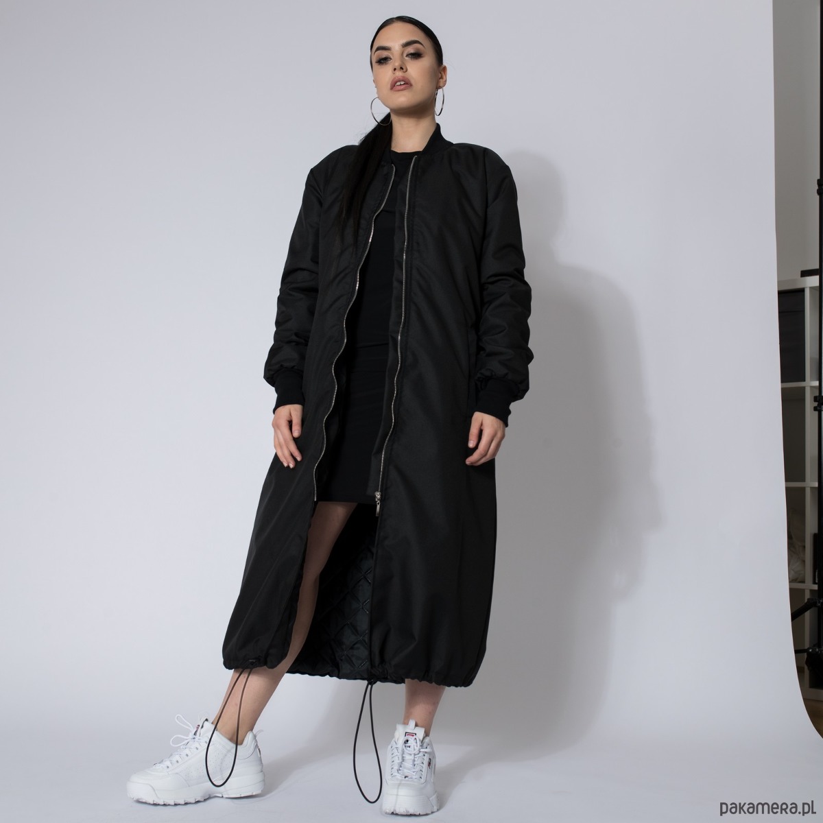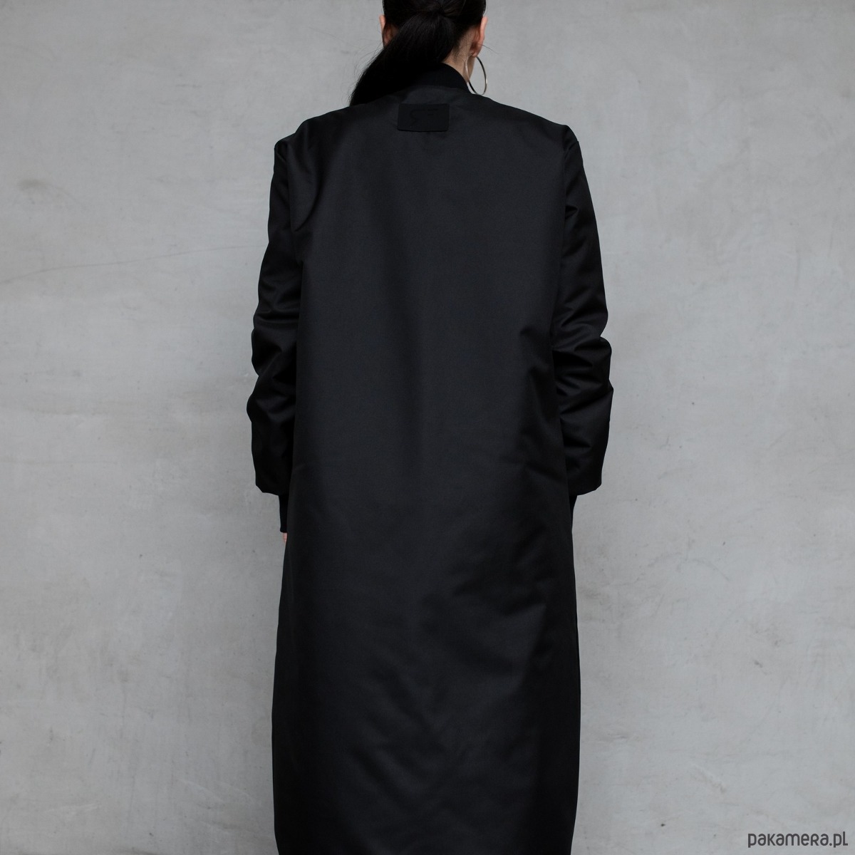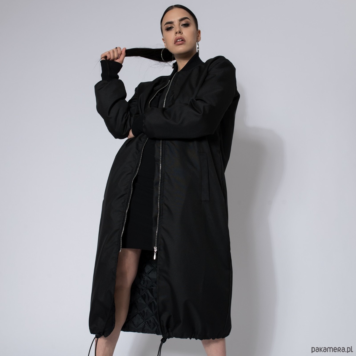 Długi płaszcz typu bomber wykonany z przeciwdeszczowej tkaniny softshell w kolorze czarnym, zapinany na zamek