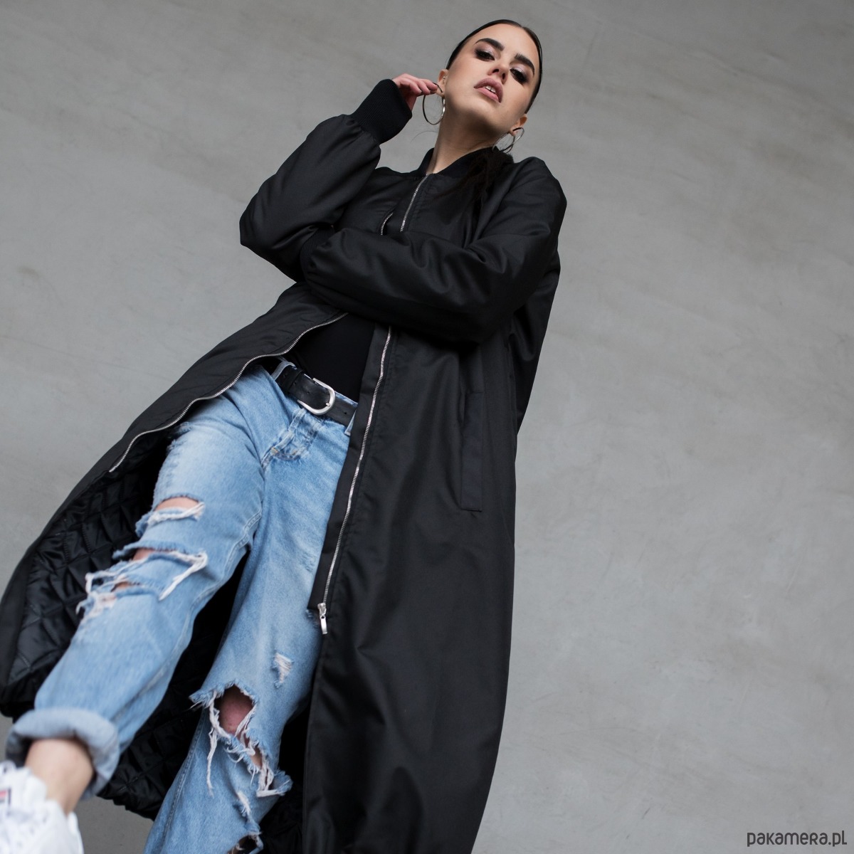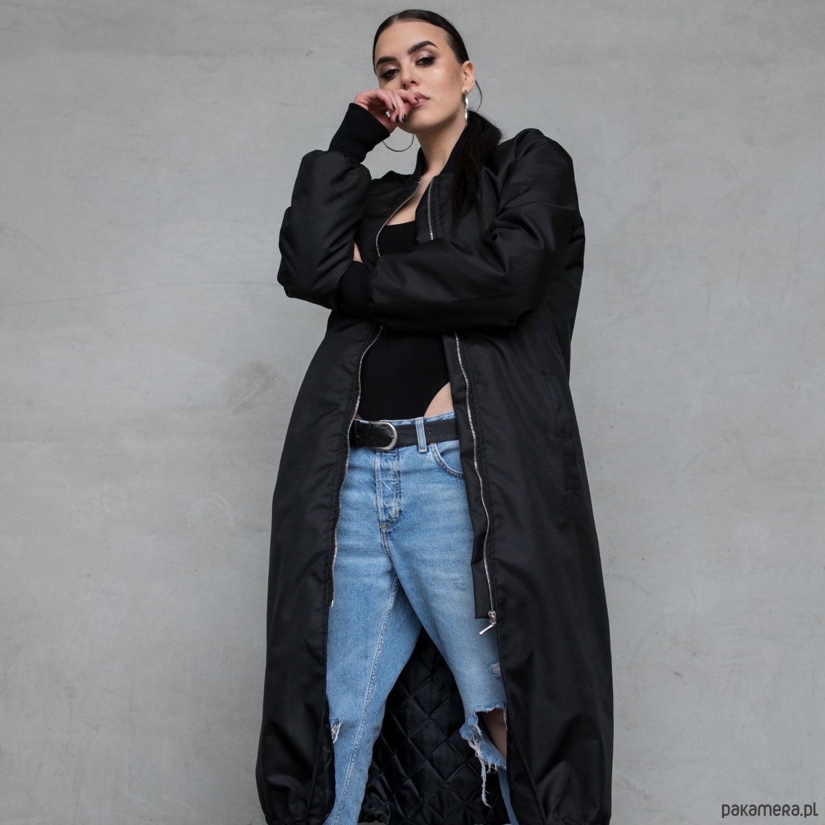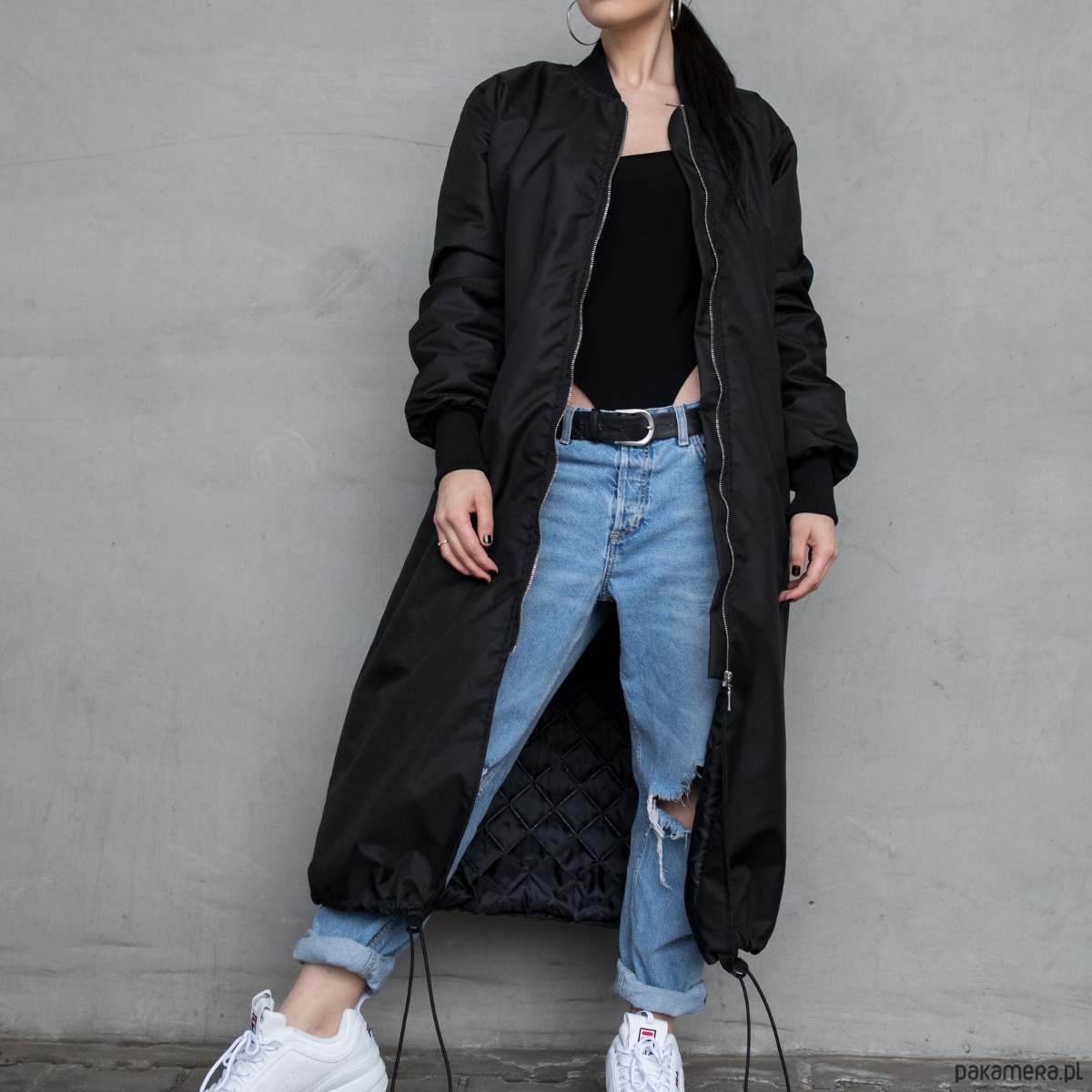 Długi płaszcz typu bomber wykonany z przeciwdeszczowej tkaniny softshell w kolorze czarnym, zapinany na zamek