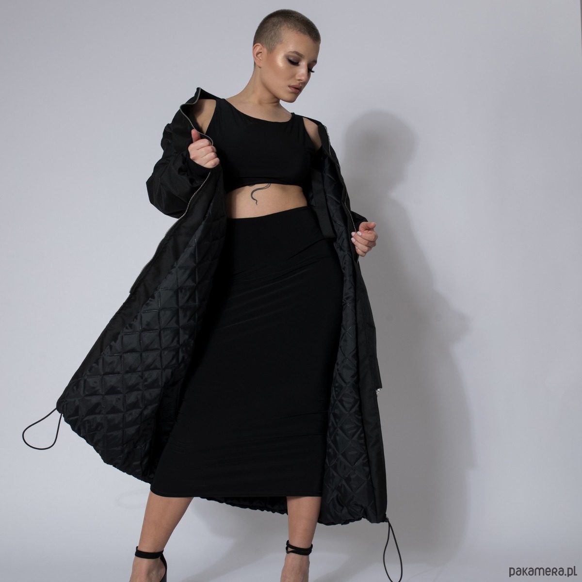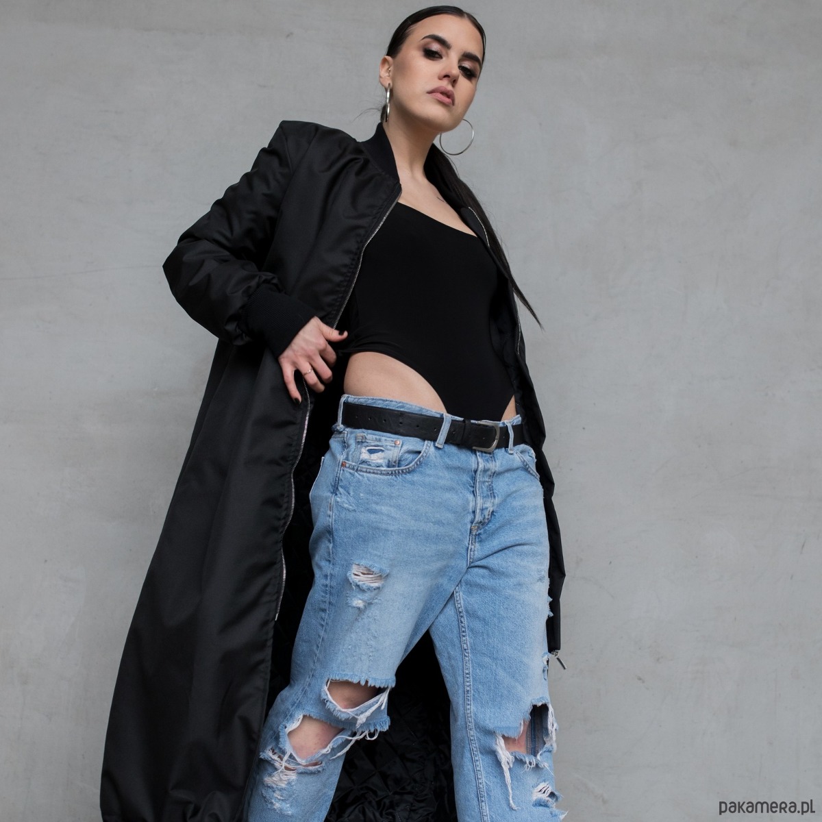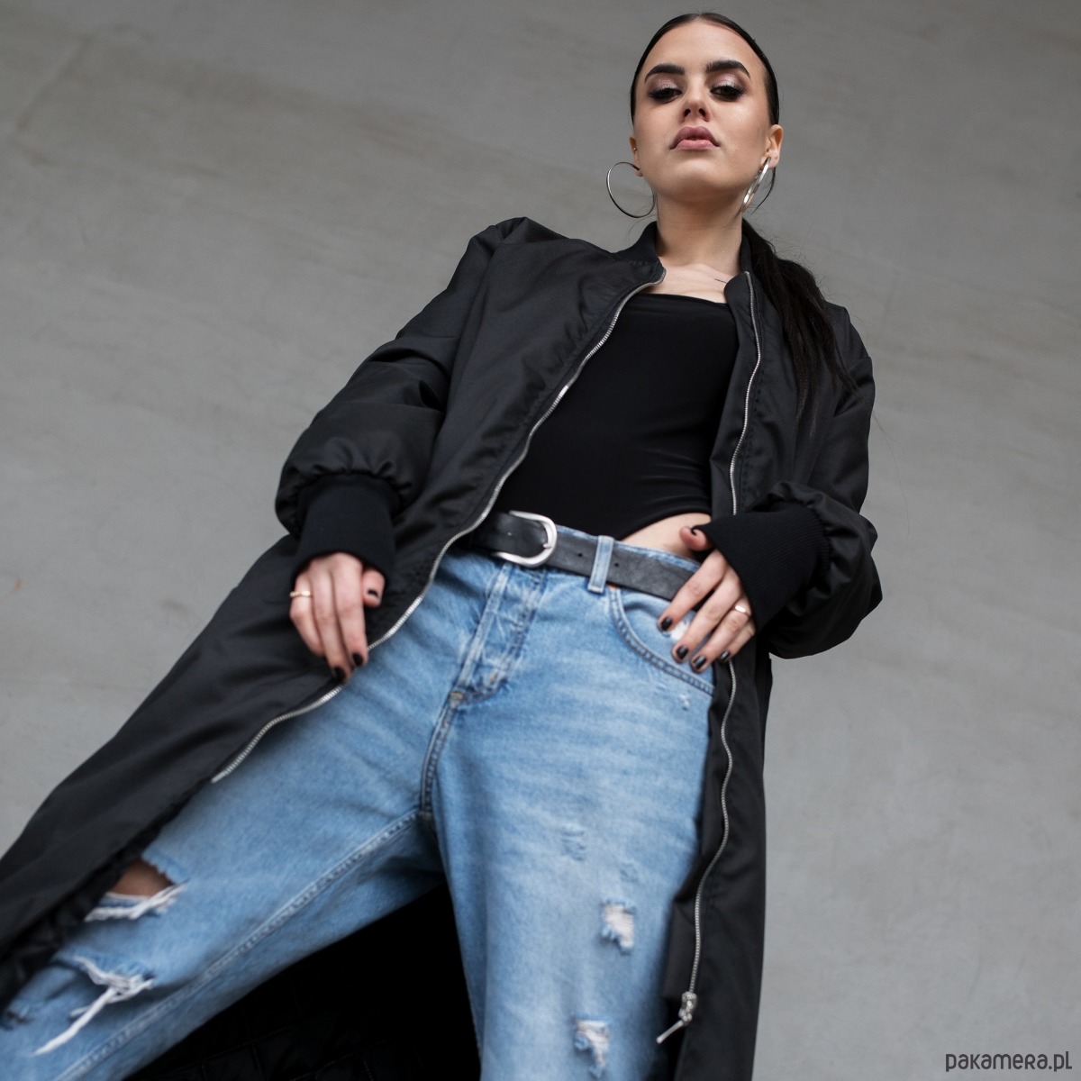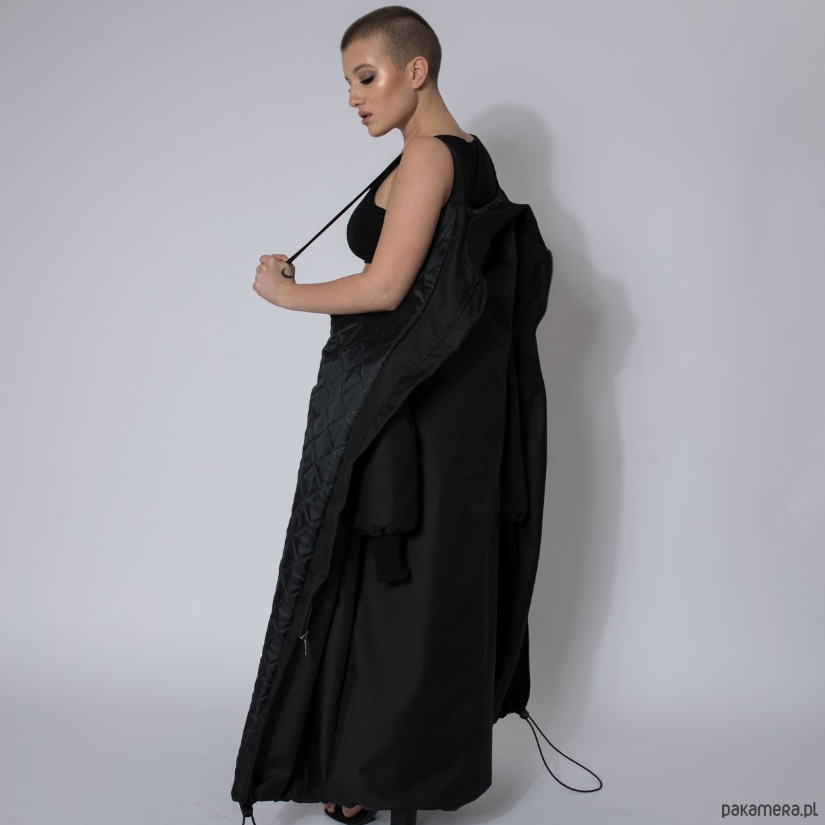Długi płaszcz typu bomber wykonany z przeciwdeszczowej tkaniny softshell w kolorze czarnym, zapinany na zamek