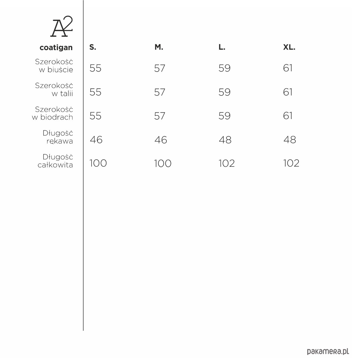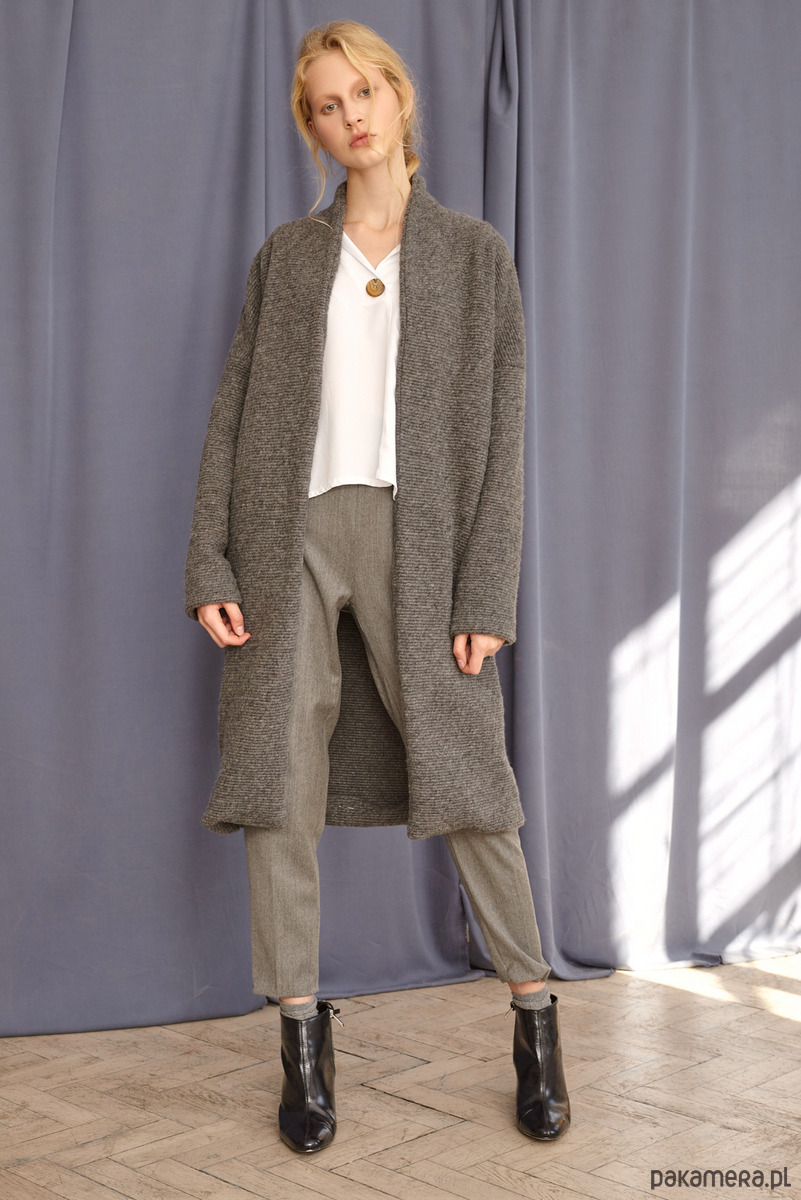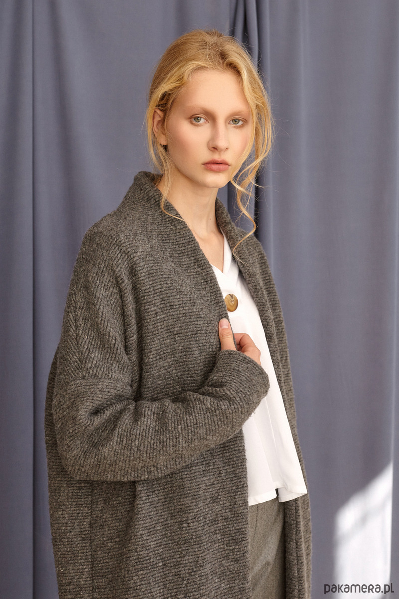 Wykonany z wełnianej dzianiny swobodny i ciepły swetrowy płaszcz. Wykończony kontrastową lamówką, zapinany na ręcznie doszywane zatrzaski.