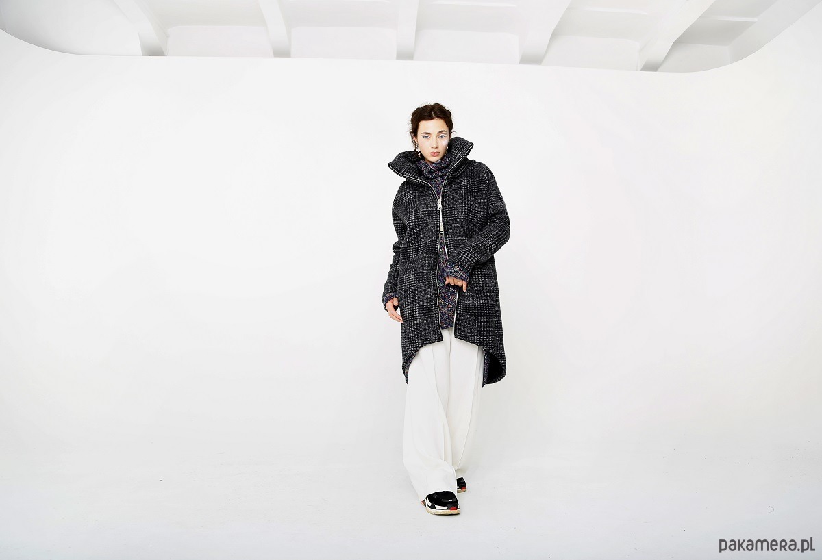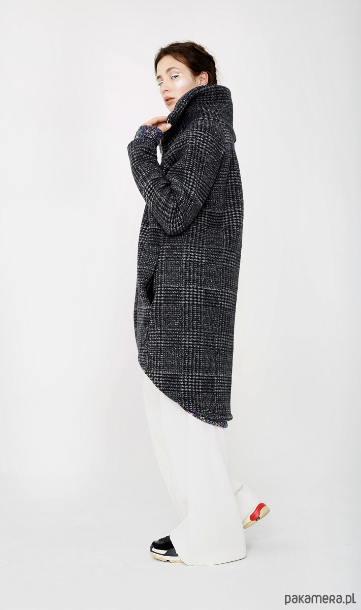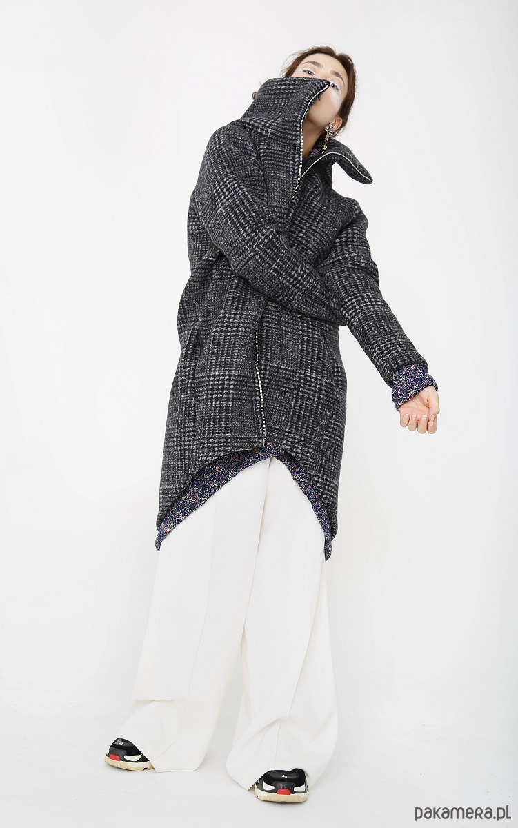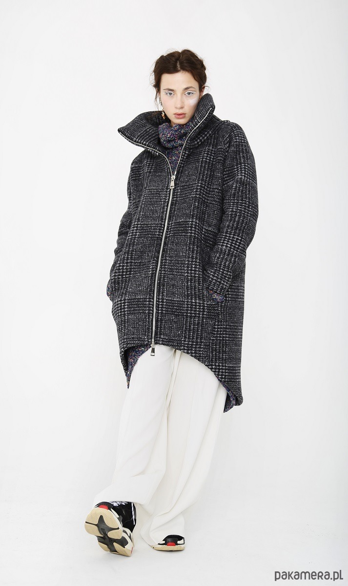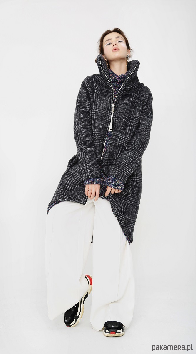Bestsellerowa forma naszego płaszcza typu T-unikat - tym razem w odsłonie z bardzo grubej, wysokiej jakości wełny w kratę, w odcieniach szarości, ze srebrnym, dwustronnym masywnym suwakiem, co świetnie kontrastuje i nadaje bluzie charakter. Z pewnością nie znikniesz w nim w tłumie. Prosta forma z golfem i lekko dłuższym tyłem.
