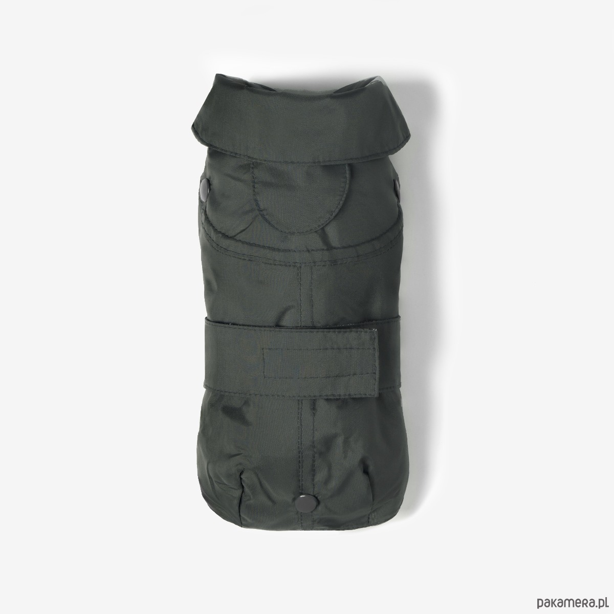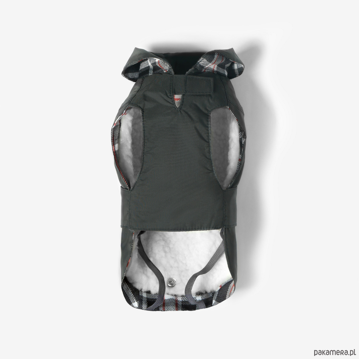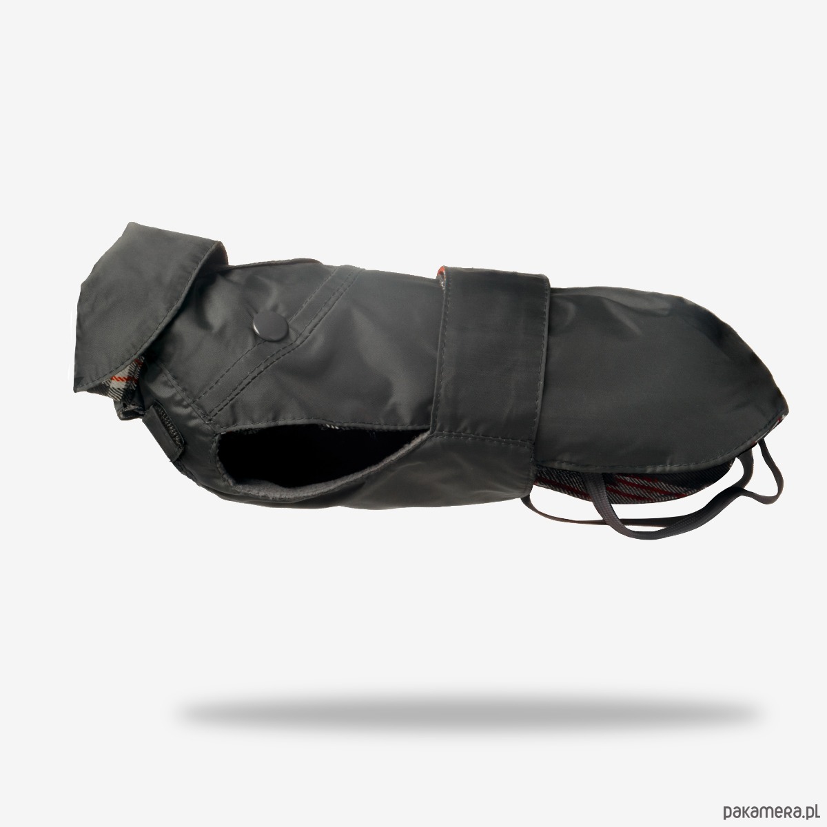 Stylowa podszewka w kratę dodaje mu charakteru, a starannie zaprojektowany krój chroni brzuszek i klatkę piersiową przed wilgocią. Na karku znajduje się dyskretne otwarcie, które umożliwia przypięcie smyczy do szelek lub obroży, a elastyczne gumki na tylne łapki stabilizują całość podczas spacerów.