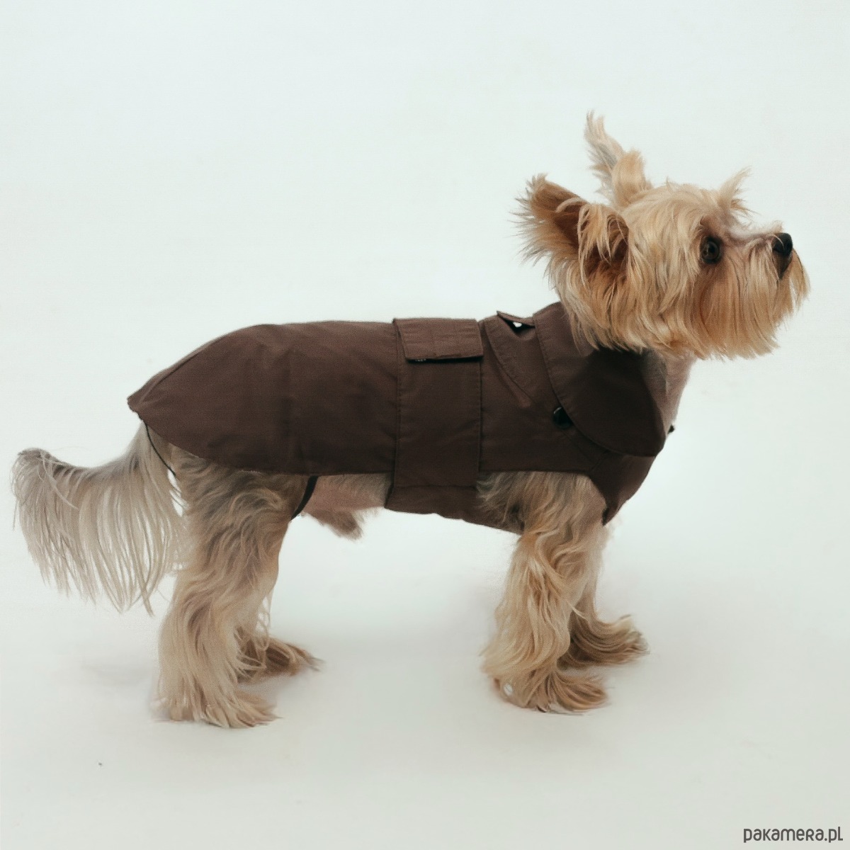 Stylowa podszewka w kratę nadaje całości wyjątkowego charakteru, a dopracowany krój skutecznie chroni brzuszek i klatkę piersiową przed wilgocią. Na karku znajduje się dyskretne otwarcie, które pozwala przypiąć smycz do szelek lub obroży. Elastyczne gumki na tylne łapki zapewniają stabilność płaszcza podczas spacerów.
