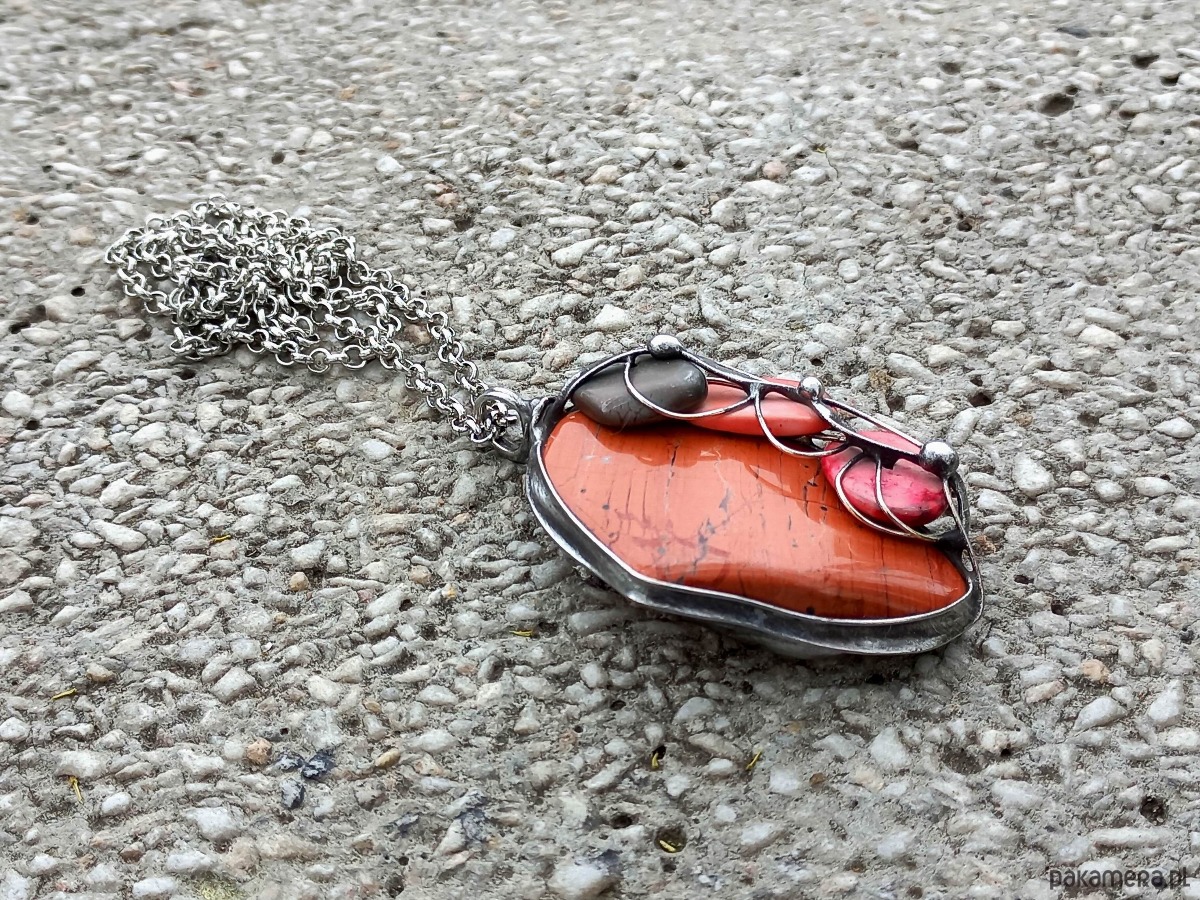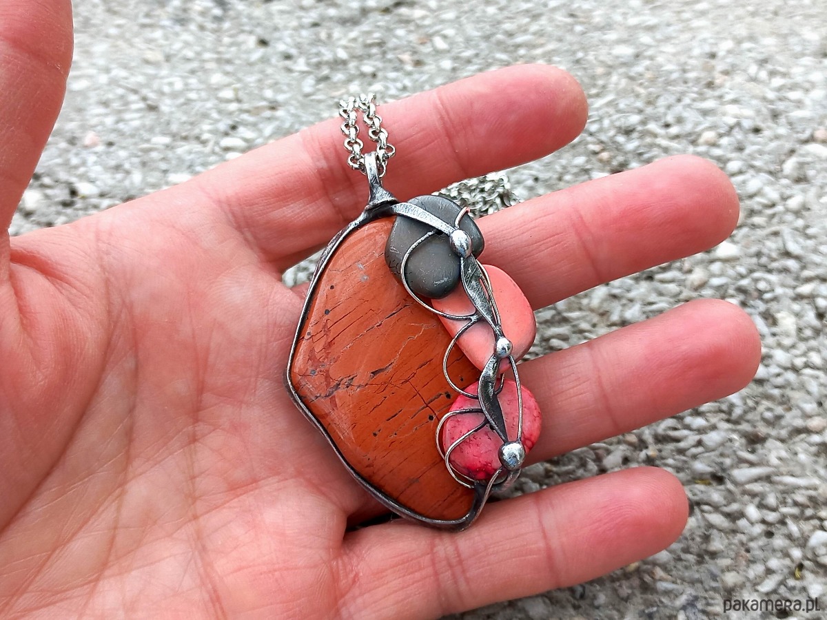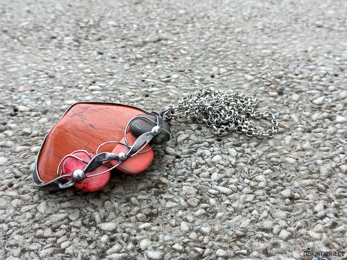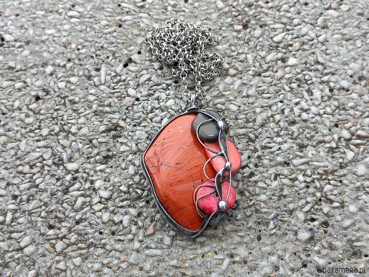 Wisiorek wykonany z miedzi, cyny, howlitów i jaspisu. Zawieszony na łańcuszku o długości ok. 50 cm. Wymiary ok. 5 na 4 cm.