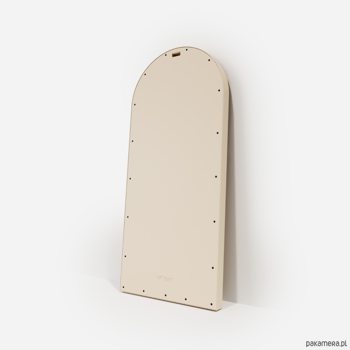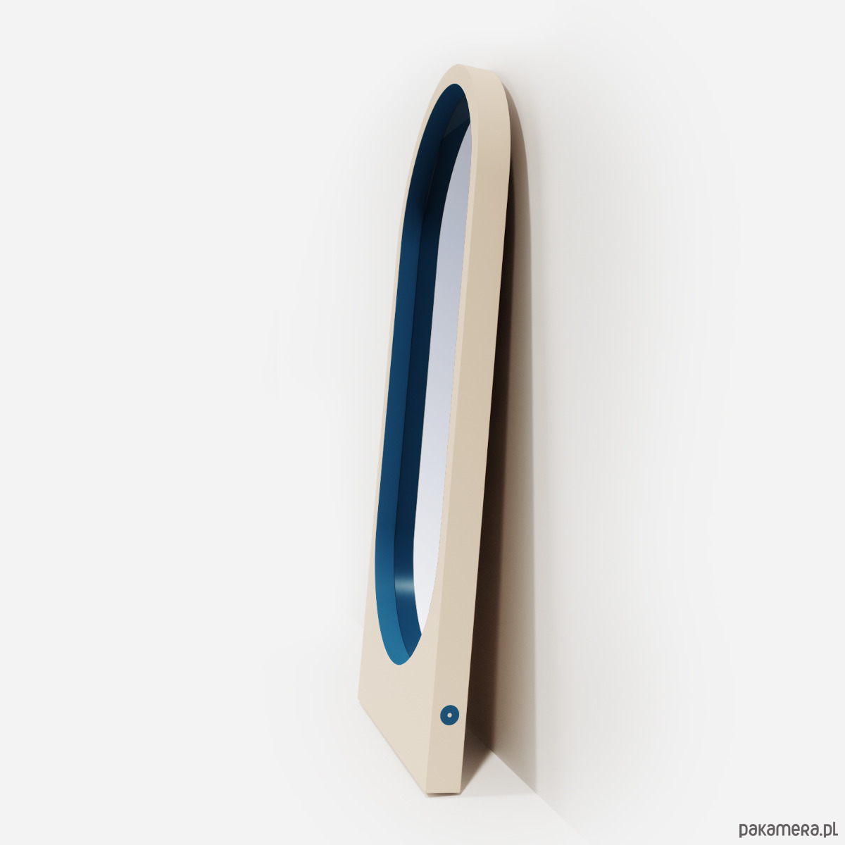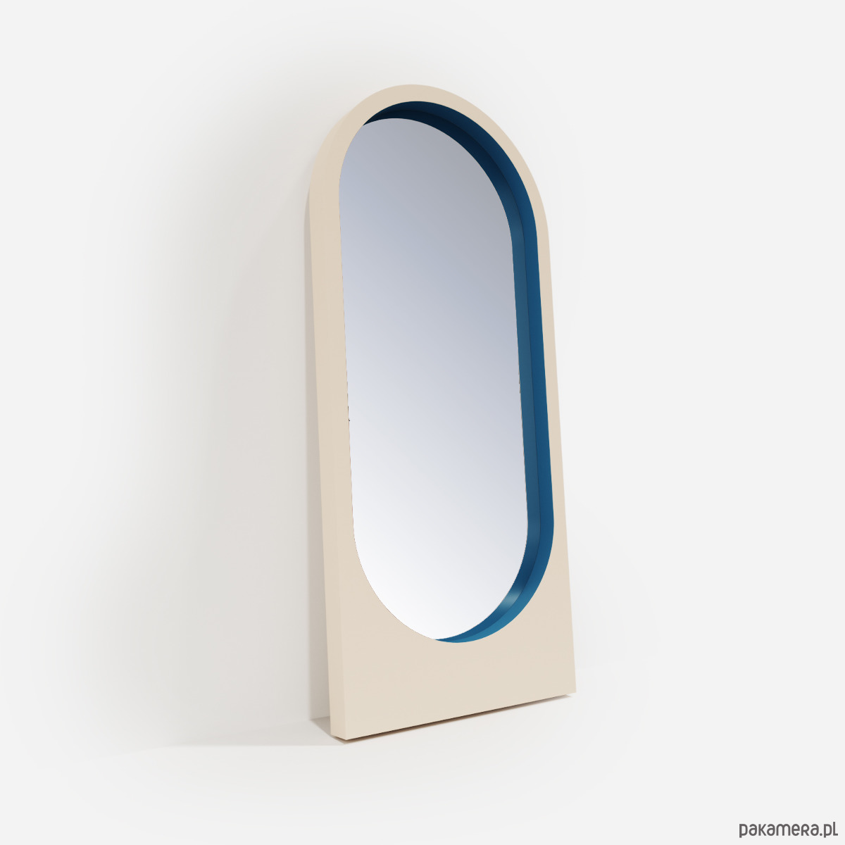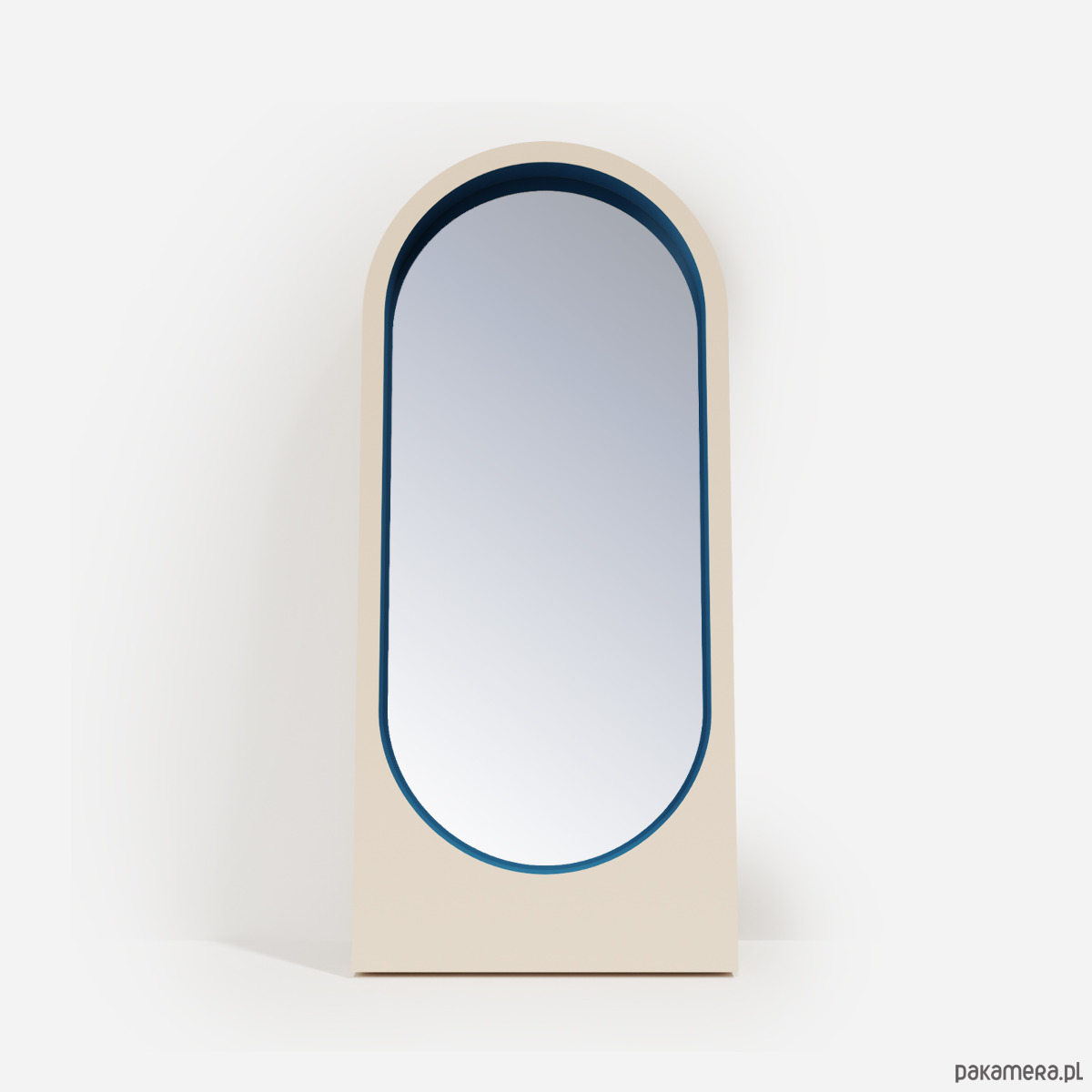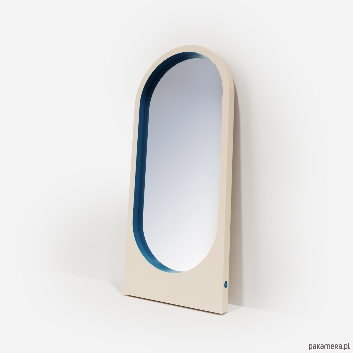 To duże, stojące, spektakularne lustro może grać rolę wyrazistego elementu w każdego rodzaju przestrzeni. Zostało zaprojektowane z myślą o sypialni, salonie czy hallu. Sprawdzi się zarówno w dużych jak i małych przestrzeniach – rozjaśni je, dodając im światła. Jego nowoczesny kształt to połączenie minimalistycznego funkcjonalizmu stylu Bauhaus i postmodernistycznej, energetycznej estetyki Grupy Memphis. Wyjątkową formę tworzy geometryczna, przestrzenna rama, wykończona detalem w postaci graficznego pasa w kontrastowym kolorze, który zaskakuje, dodaje energii i potęguje głębię lustra. Kolory, które wybraliśmy nadadzą wnętrzu odważny
