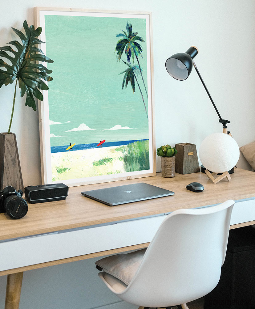 Dzikie plaże i nieposkromione fale, to marzenie każdego surfera. Plakat przedstawia takie właśnie idealne miejsce, skąpane w słońcu o poranku. Grafika przesycona jest aurą wakacyjnego relaksu. Idealna dekoracja dla fanów surfingu i nie tylko.