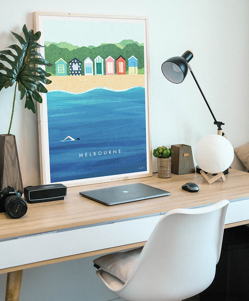 Plakat podróżniczy w stylu retro z barwną plażą w Melbourne w Australii. Grafika z ikonicznymi budkami kąpielowymi na plaży Brighton, to doskonała dekoracja dla każdego miłośnika lata, Australii i unikatowych widoków.