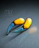 Ceramiczne podłużne kolczyki, ręcznie wykonane z delikatnej gliny kamionkowej, jednostronnie szkliwione mieszanką żółtych i błękitnych szkliw z efektem plamek ( rozmieszczenie kolorów może nieznacznie różnić się od przedstawionego na zdjęciu), tył matowy czekoladowobrązowy na antyalergicznych sztyftach w kolorze srebrnym.długość ok 2,8cm. Polecam