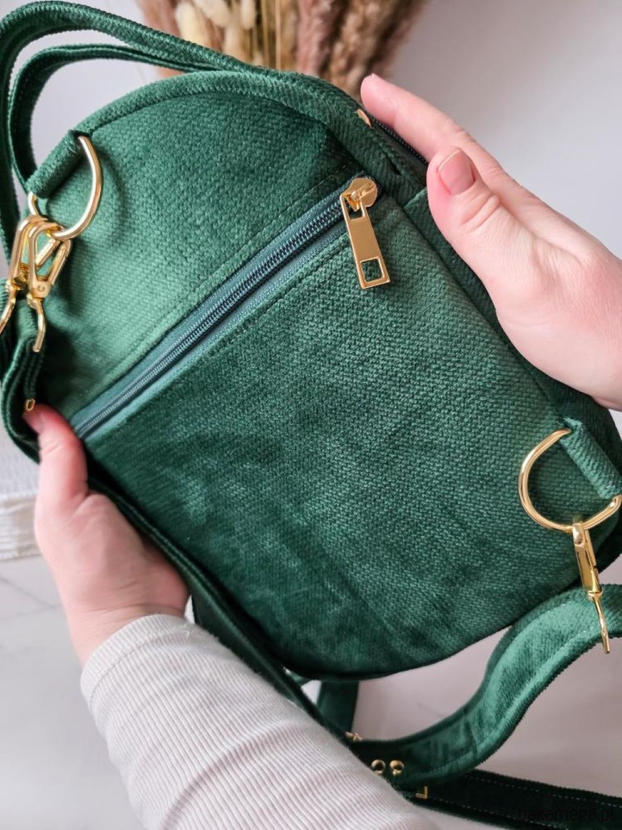 Posiada 2 odpinane, regulowane szelki i złote okucia. Całość zapinana na listwę suwakową z dwoma suwakami, w środku posiada 2 kieszonki - zapinana na suwak i wsuwana. Z tyłu plecaka znajduje się również kieszonka zapinana na zamek.