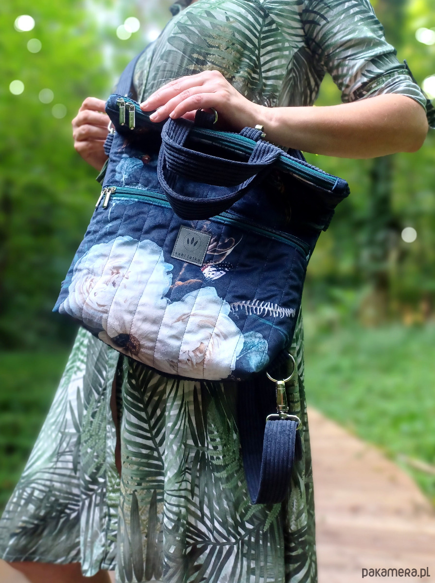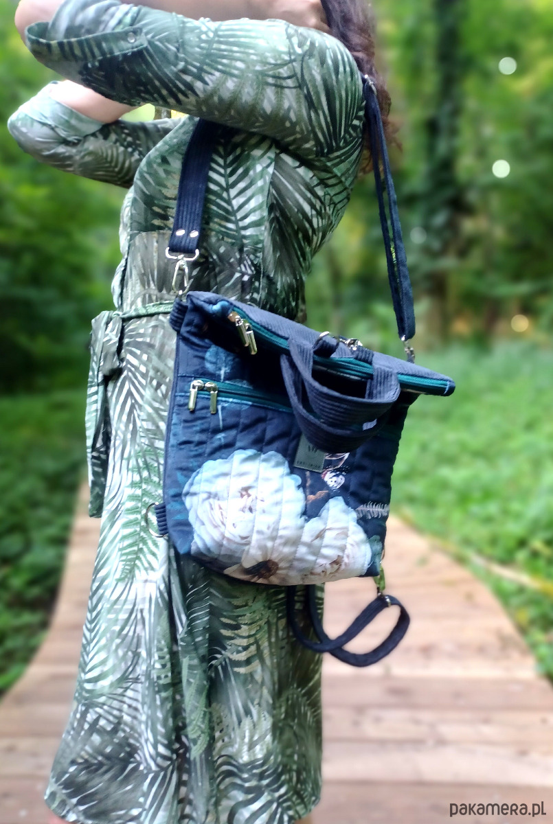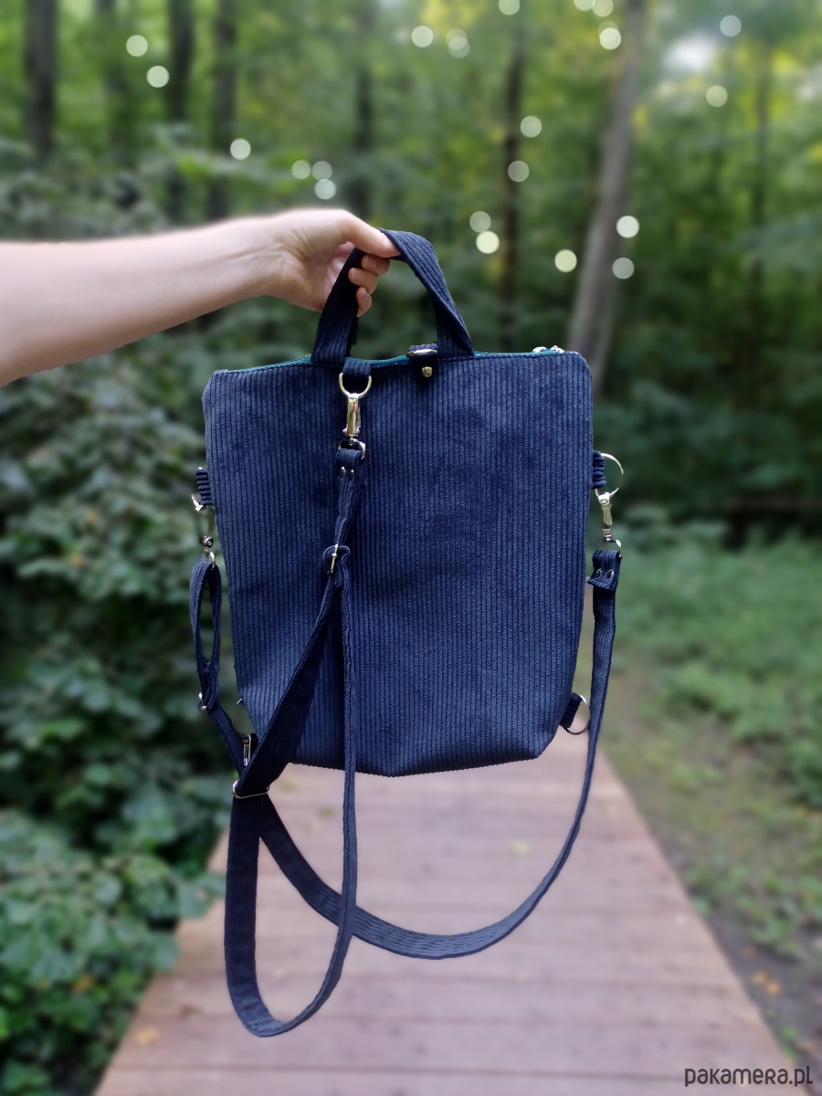 Torebko-plecak może służyć jako torebka albo jak plecak po przypięciu szelek do tyłu plecaka.
