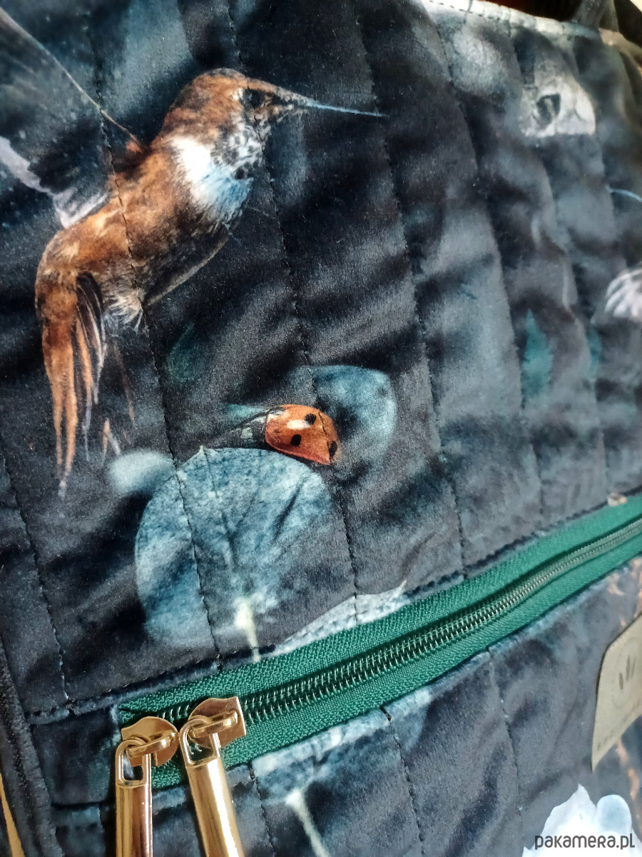 Wykonany z mocnego sztruksu oraz weluru tapicerskiego z kompozycją kwiatów, koliberków i owadów.