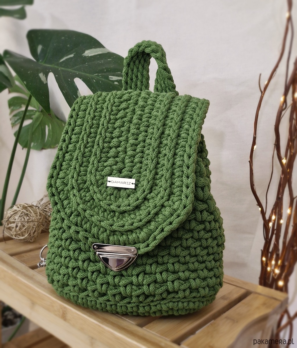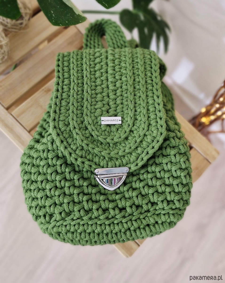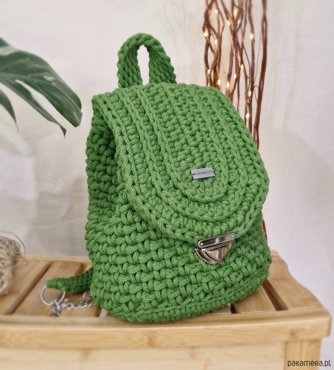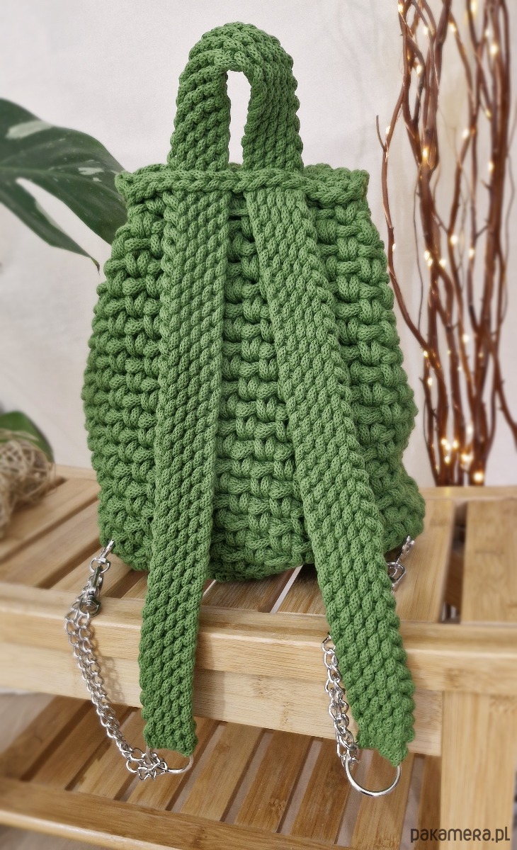 Plecak wykonany jest ręcznie z użyciem szydła według autorskiego projektu. Powstał ze sznurka 100 % bawełnianego z recyklingu. Jest miękki i układa się do sylwetki. Można prać go w pralce w temp. 30 stopni.