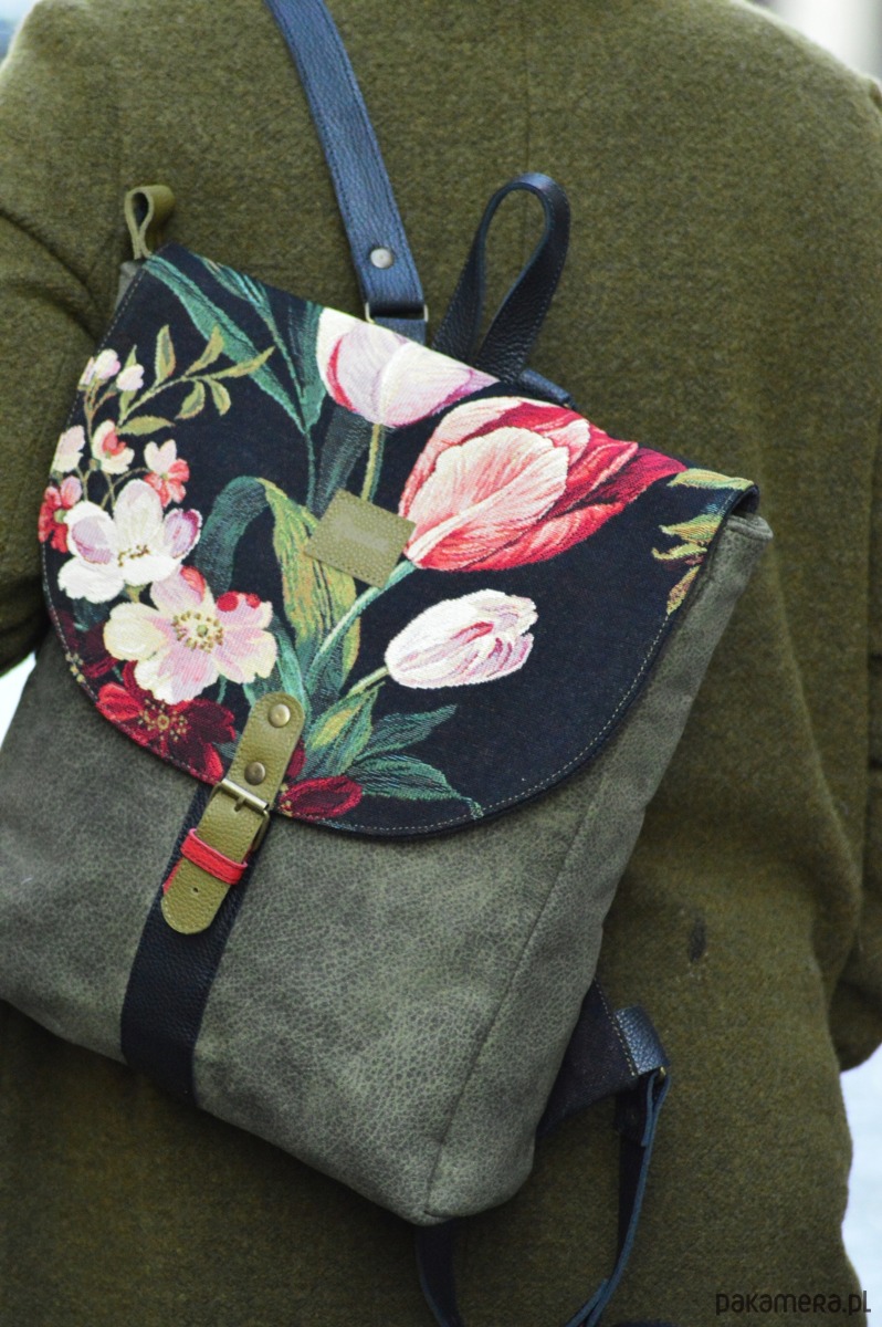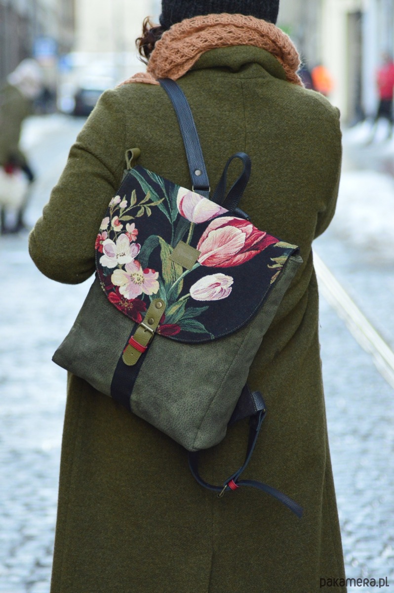Plecak powstał z wzorzystej tkaniny gobelinowej( Klapa), zielonego syntetycznego nubuku (korpus) oraz skóry naturalnej (łączenia, paski, zapięcie). Całość została wzmocniona warstwą wodoodporną i zapina się na zatrzaski. Wewnątrz znajdują się trzy kieszonki ( w tym jedna na suwak). Dodatkowo plecak ma kieszonkę z tyłu na zewnątrz.