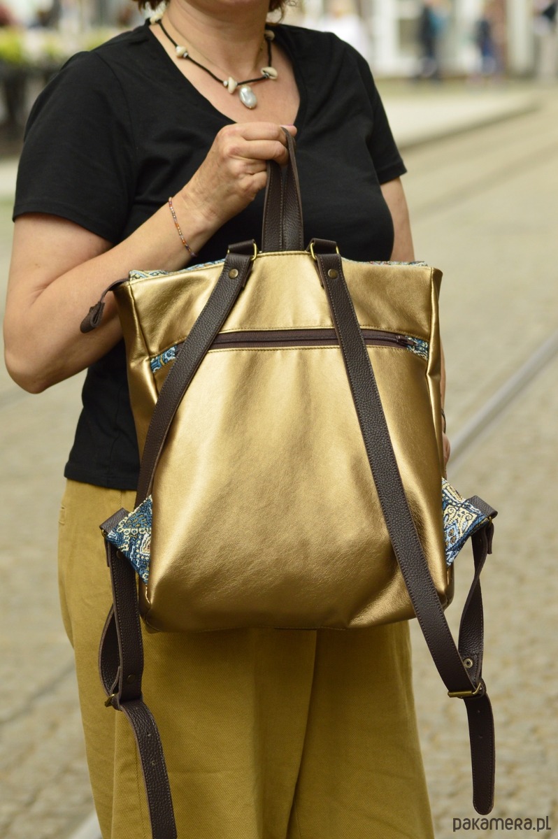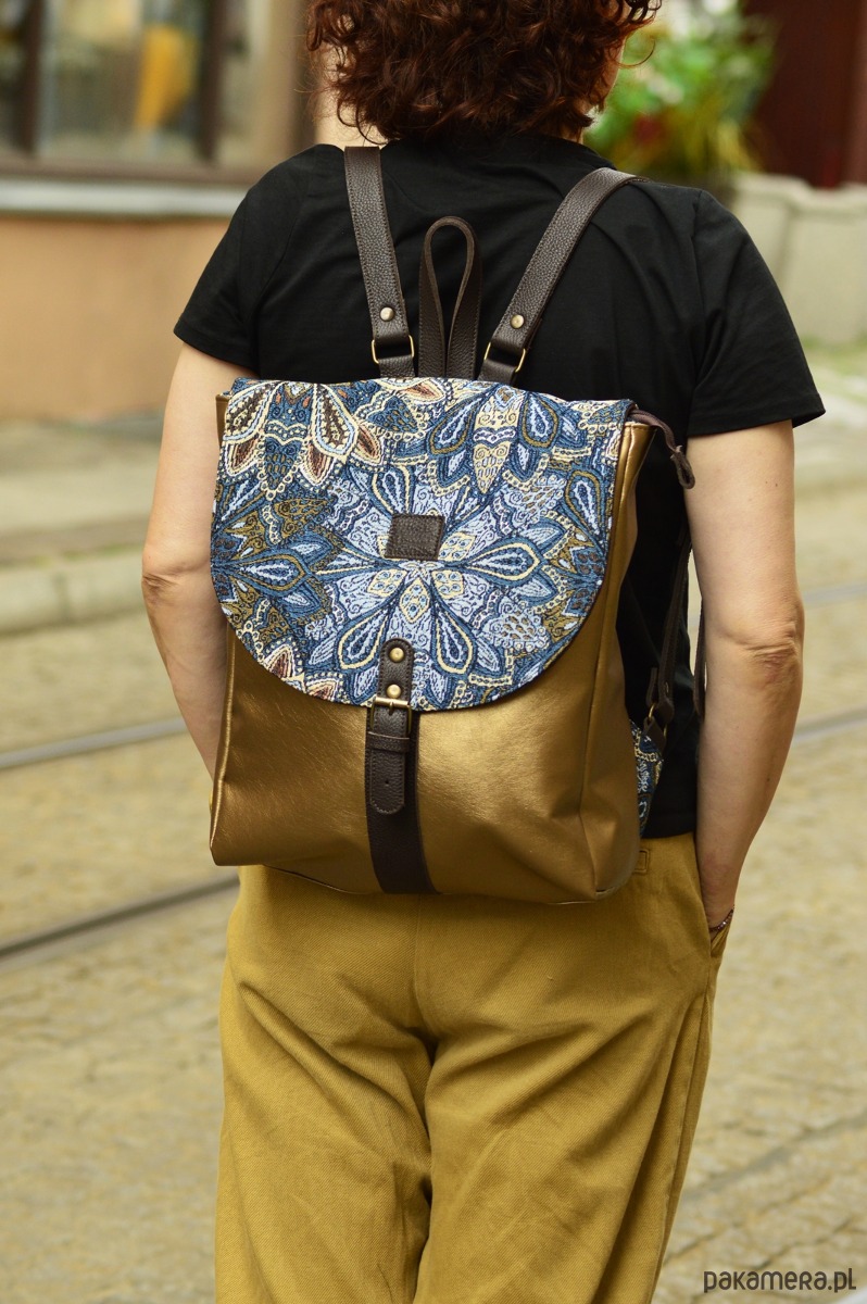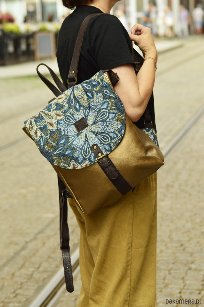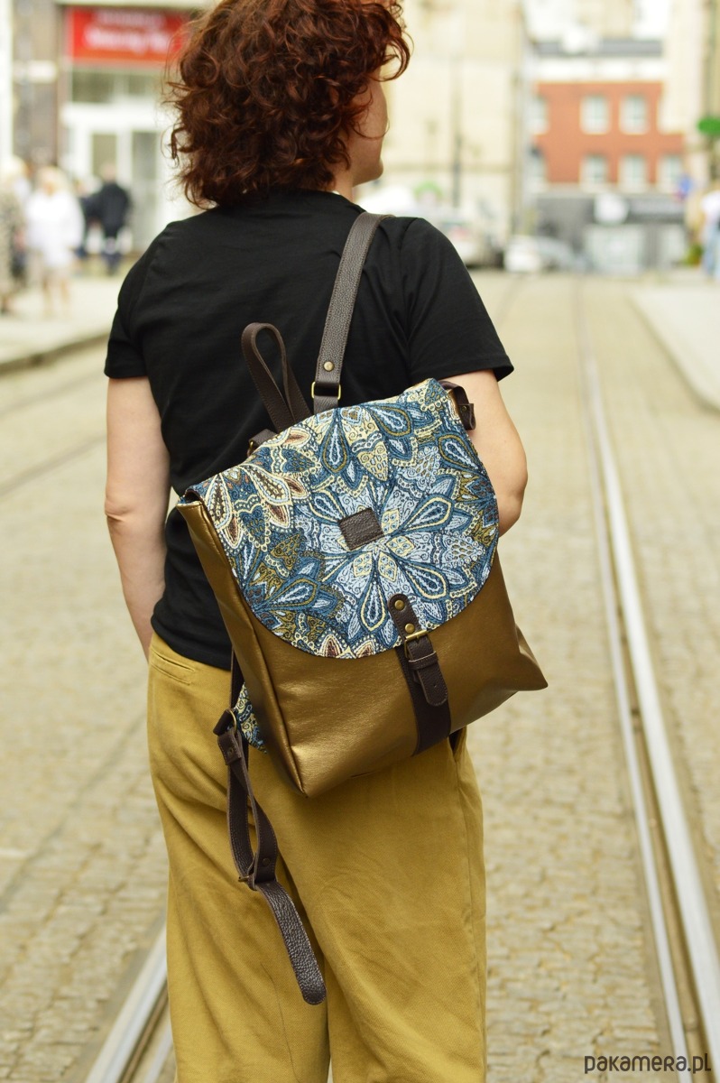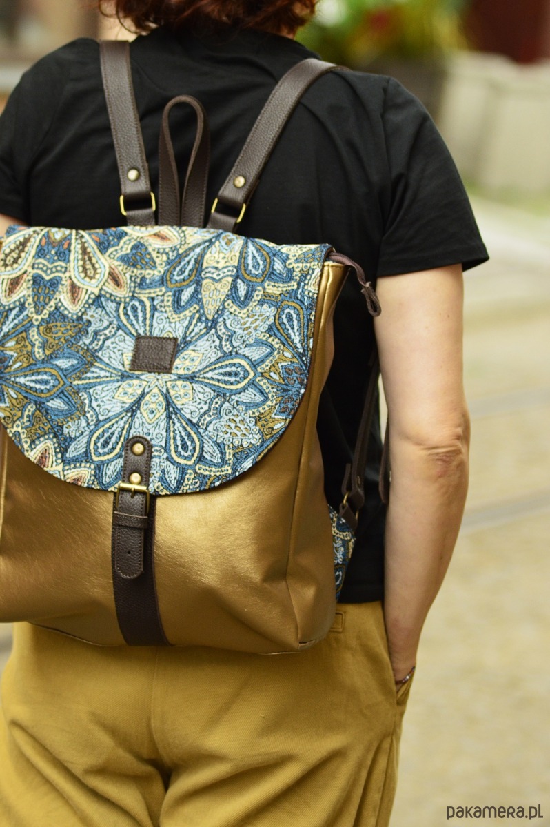 Plecak powstał z wzorzystej tkaniny gobelinowej ( Klapa), złotej ekoskóry oraz skóry naturalnej (łączenia, paski, zapięcie). Całość została wzmocniona warstwą wodoodporną i zapina się na zatrzaski. Wewnątrz znajdują się trzy kieszonki ( w tym jedna na suwak). Dodatkowo plecak ma kieszonkę z tyłu na zewnątrz.