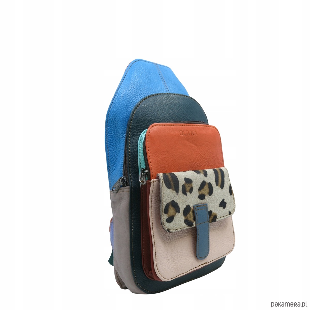Plecak na jedno ramię skórzany kolorowy damski kieszenie ze skrawków OLIVKA